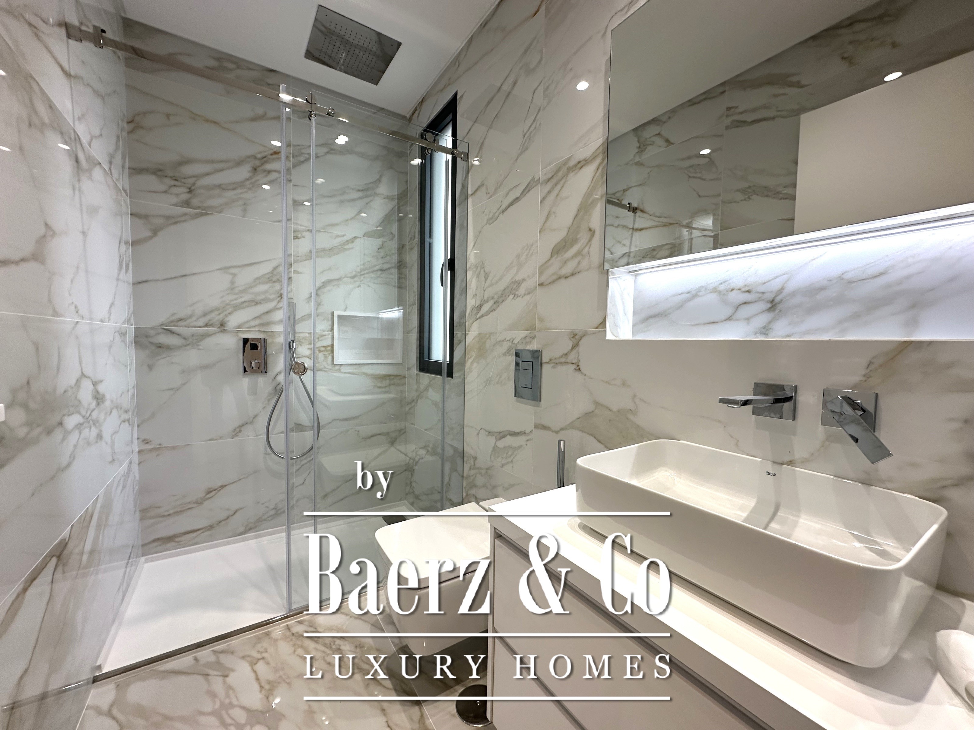 De royale hoofdverdieping beschikt over een open woon- en keukenruimte van 62 m², rijk aan natuurlijk licht. Alle vier de slaapkamers zijn ingericht als suite, waarvan drie op de begane grond met oppervlaktes van 12 m² tot 27 m²; stuk voor stuk ontworpen met oog voor comfort en flexibiliteit. De afwezigheid van vaste kasten biedt ruimte voor maatwerk, zodat de leefruimte naar eigen behoefte kan worden ingericht. Boven bevindt zich een privéterras van 106 m² voor ontspannen buitenleven en panoramische vergezichten, aangevuld met een extra technische ruimte.