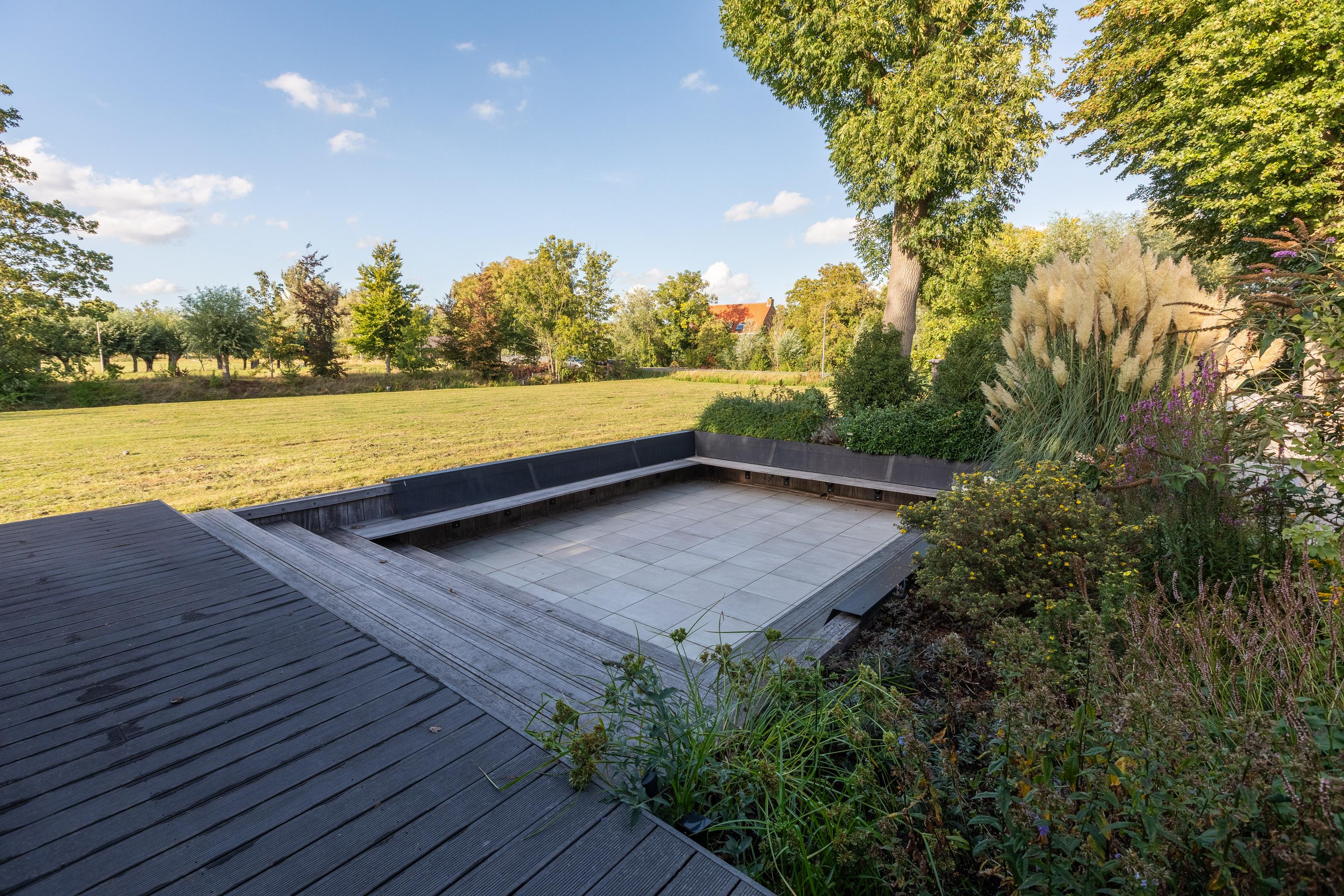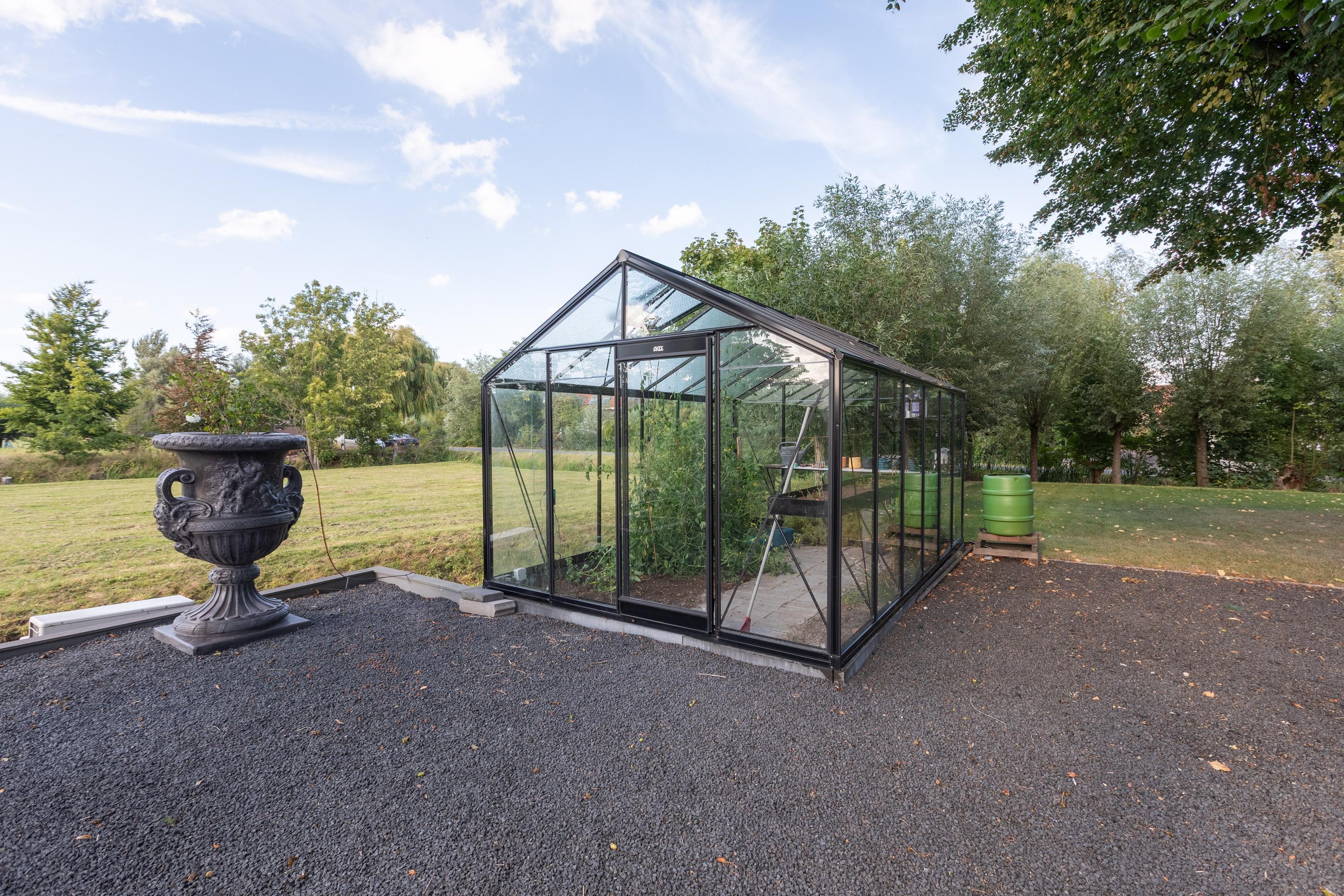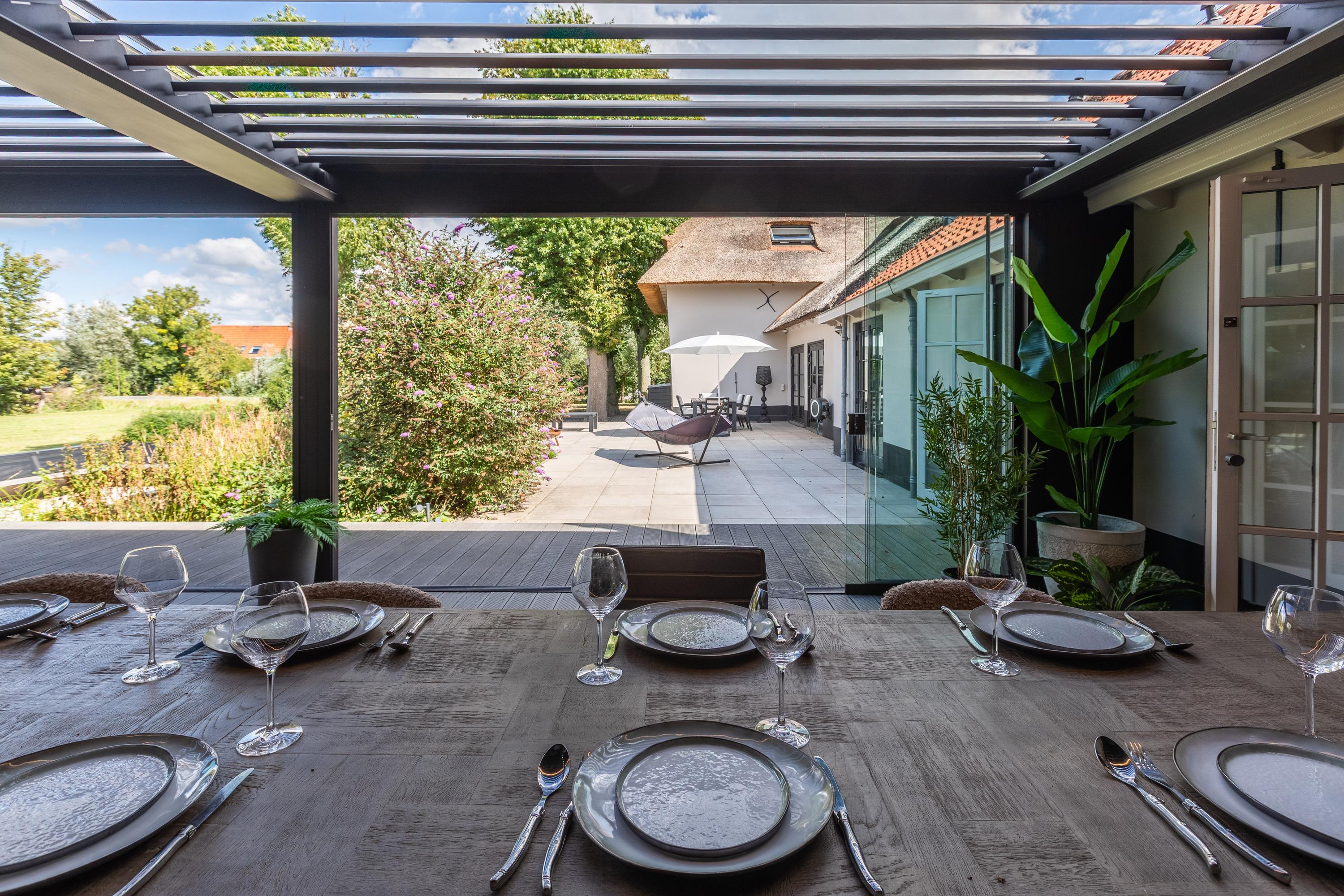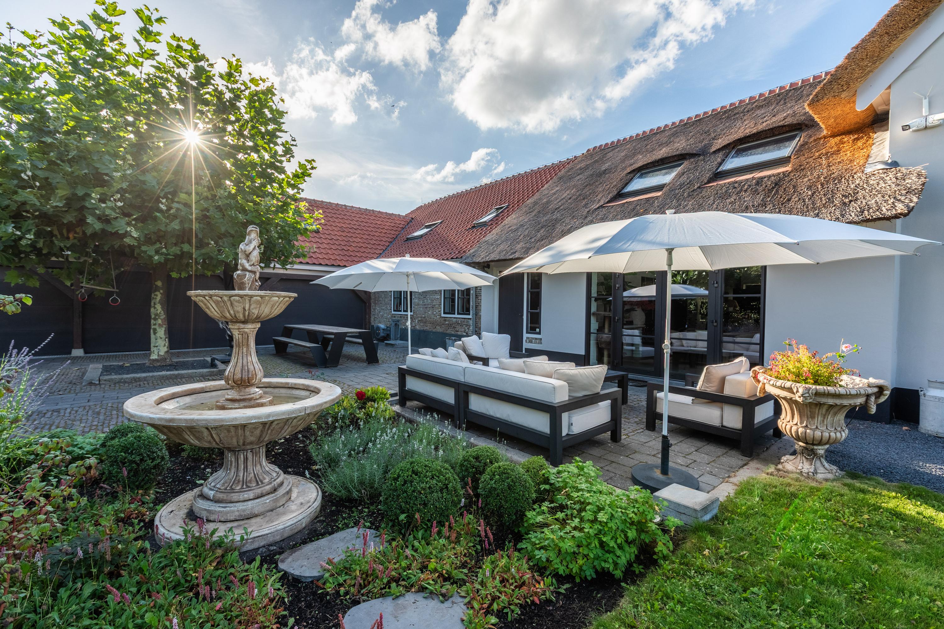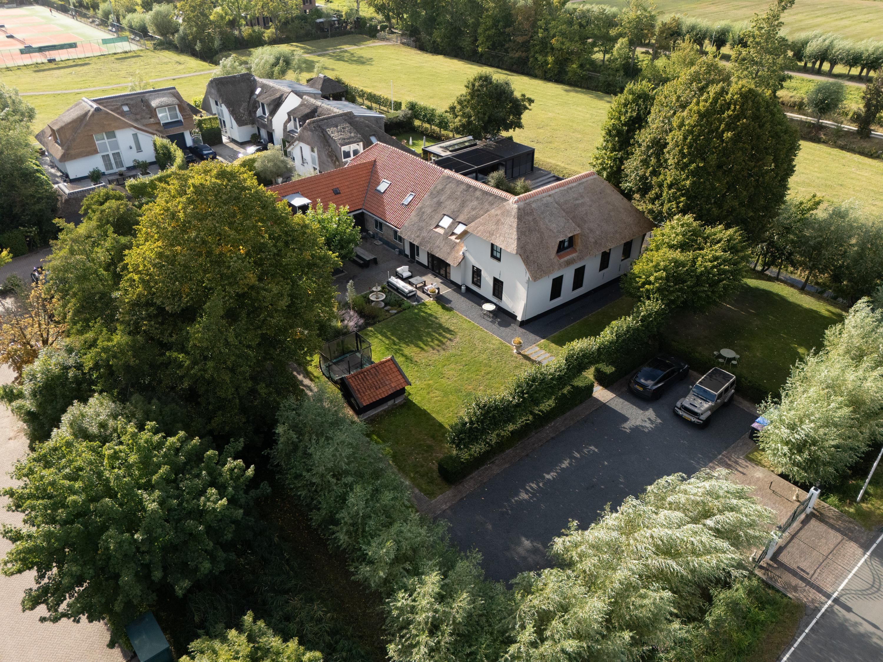 Via een elektrisch bedienbaar hek bereikt u de ruime voortuin met meerdere parkeerplaatsen. De tuin is smaakvol aangelegd met terrassen, een groot gazon, borders en een gezellige zitkuil die grenst aan het weiland. De grote schaduwrijke boom en de fraai aangelegde borders maken het geheel af. Hier ervaar je een unieke combinatie van luxe, comfort en landelijke gezelligheid – een buitenruimte die uitnodigt om elk seizoen optimaal te beleven.