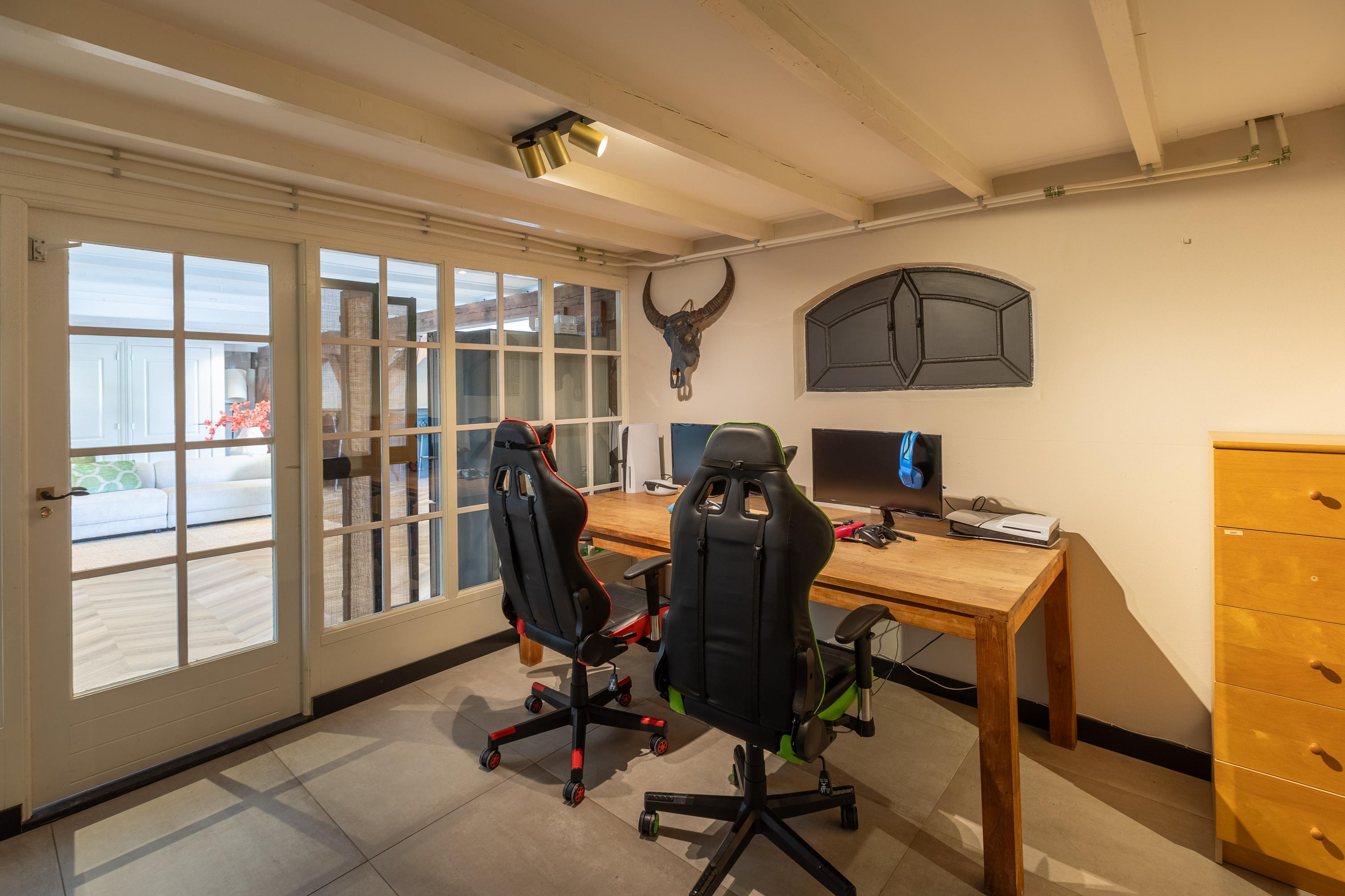 - Garage met vier deuren, gym en zolder (65 m²) met potentie tot uitbreiding met mogelijkheid tot een eigen ingang;