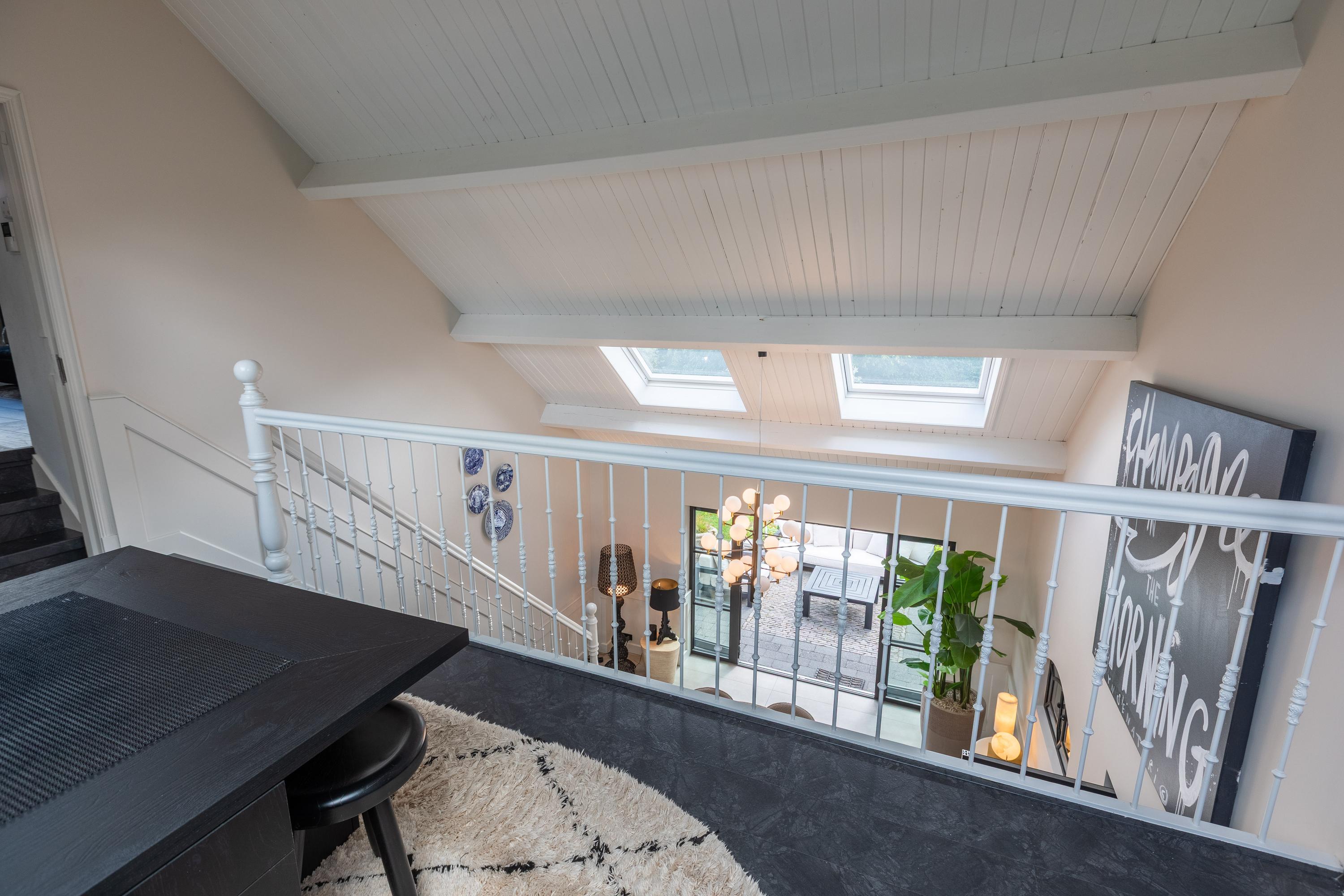 De entree is centraal gesitueerd en biedt toegang tot een royale hal met garderobe en toilet. Vanuit hier betreedt u de indrukwekkende eetkeuken van ca. 45 m², luxe uitgevoerd met kookeiland en hoogwaardige inbouwapparatuur. Dankzij de hoge nok en entresol geniet u hier van een prachtige ruimtelijke beleving.