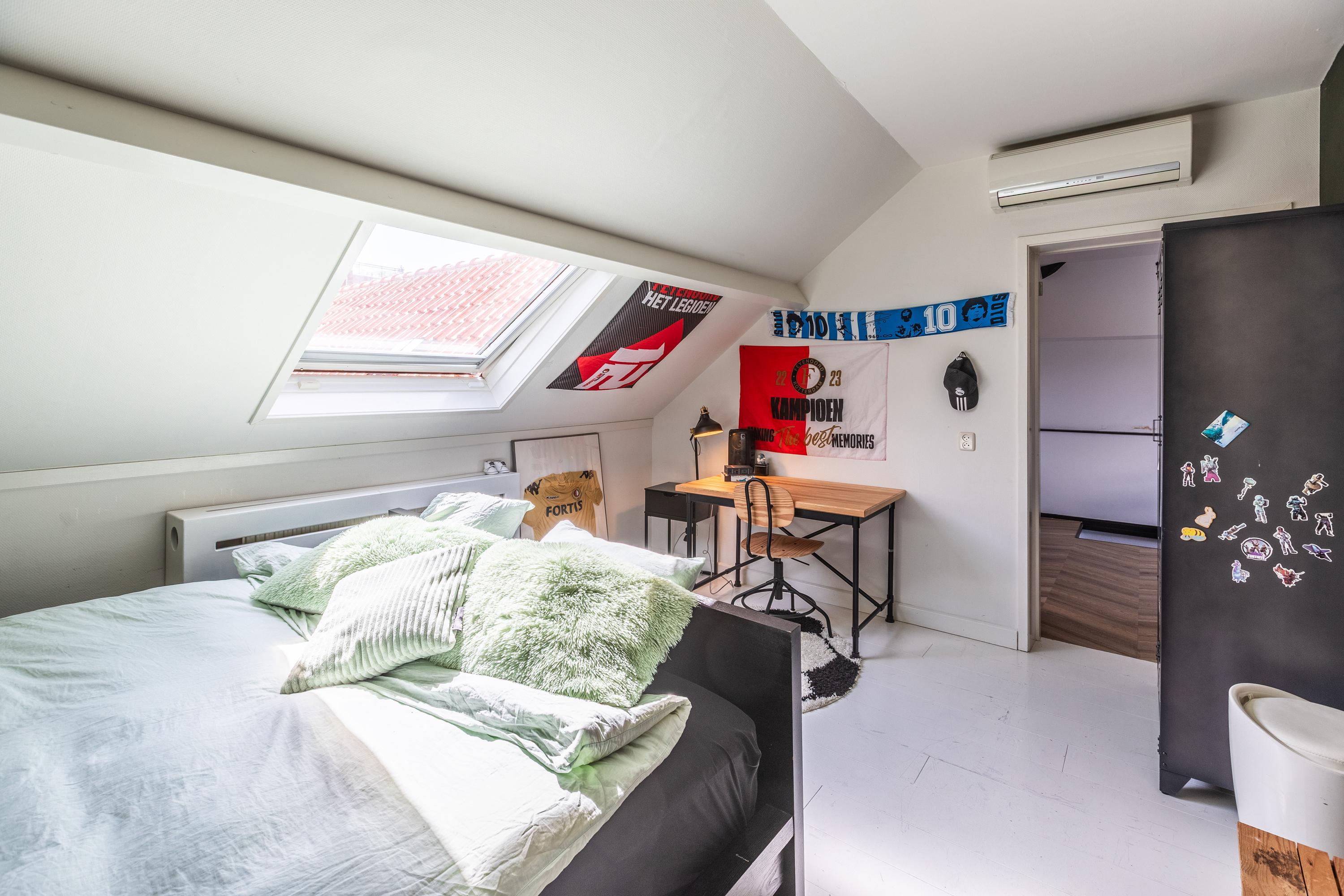 Aan de andere zijde van de overloop bevinden zich een hal met cv-ruimte, drie volwaardige slaapkamers voorzien van airco, een moderne tweede badkamer met douche, toilet en wastafel en een aparte werkkamer.