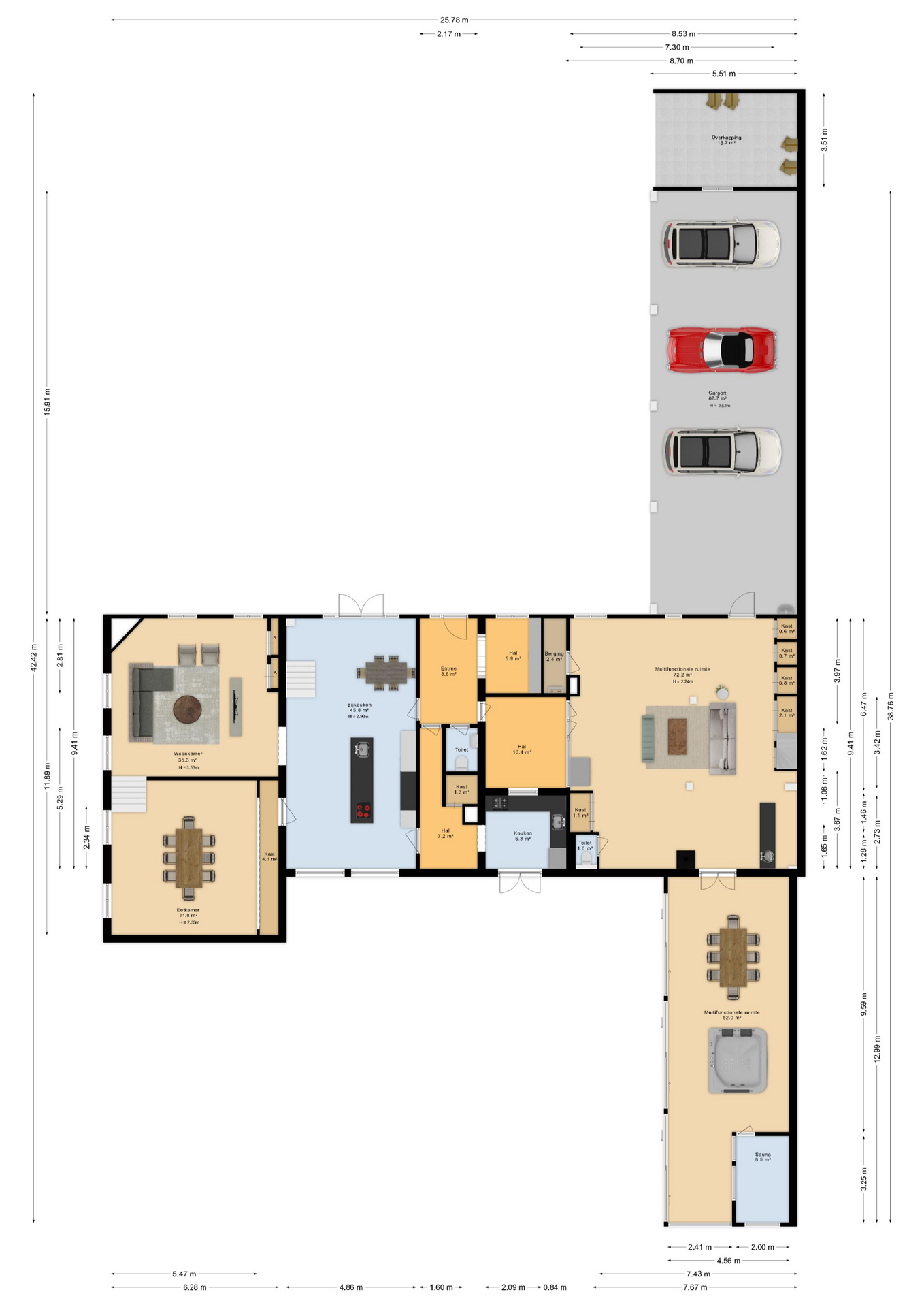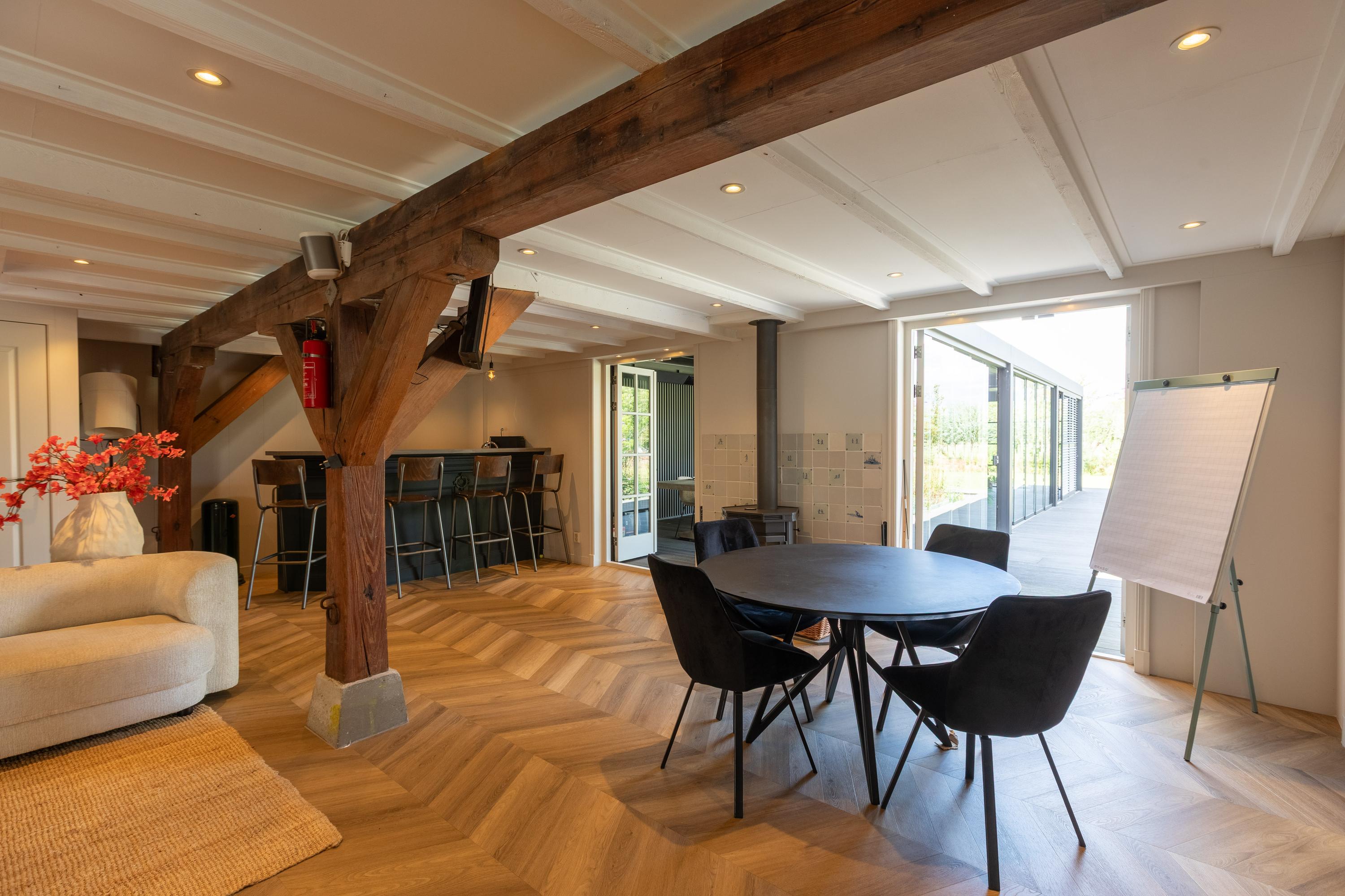 - Multifunctionele stalruimte (85 m²) met bar en pantry;