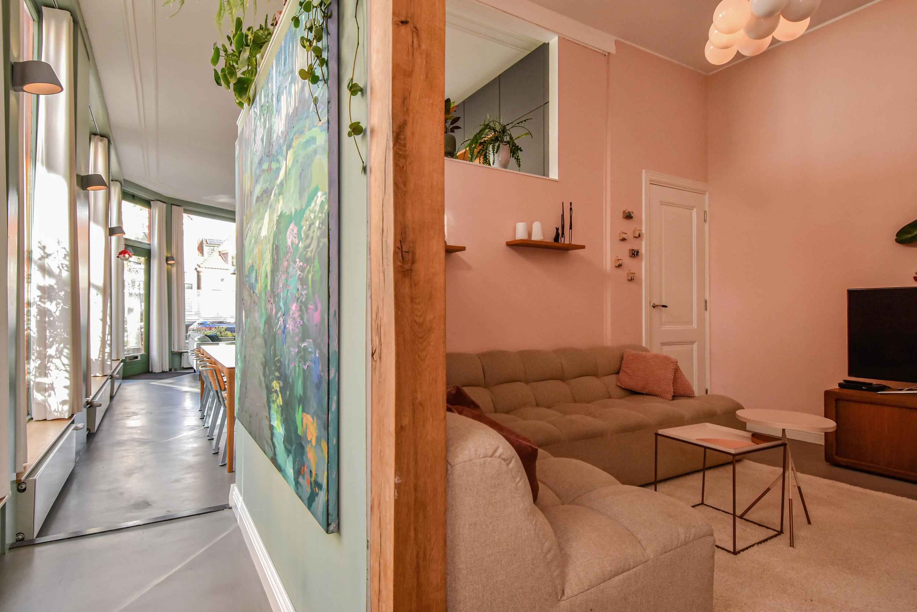 Bij binnenkomst word je direct verrast door de prachtige woonkeuken met haar indrukwekkende hoge glazen puien en een plafondhoogte van maar liefst 3,55 meter. In het plafond zit de originele gestucte sierlijst. De ruimte baadt in het licht en biedt volop plek voor een royale eettafel. De stijlvol afgewerkte keuken vormt het hart van de woning: een fijne ruimte met luxe inbouwapparatuur, waar je met plezier kookt en gasten ontvangt.