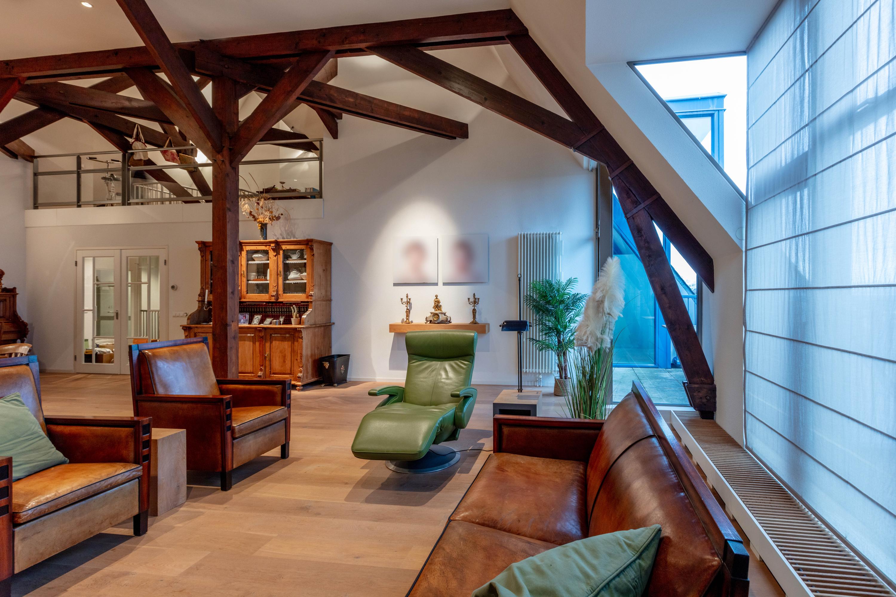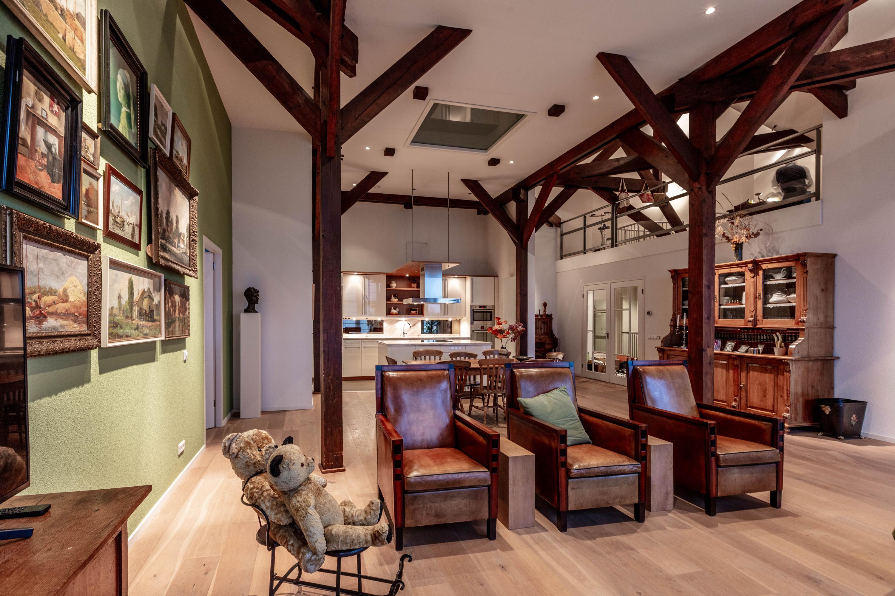 De bijzonder sfeervolle woonkamer is indrukwekkend door de unieke hoogte en fraaie zichtbare kapconstructie. De open keuken bevindt zich aan de achterzijde en beschikt over een kookeiland, volop kastruimte en diverse inbouwapparatuur. Vanuit de keuken is er prettig zicht op de woonkamer met een gezellig zitgedeelte en een apart eetgedeelte.