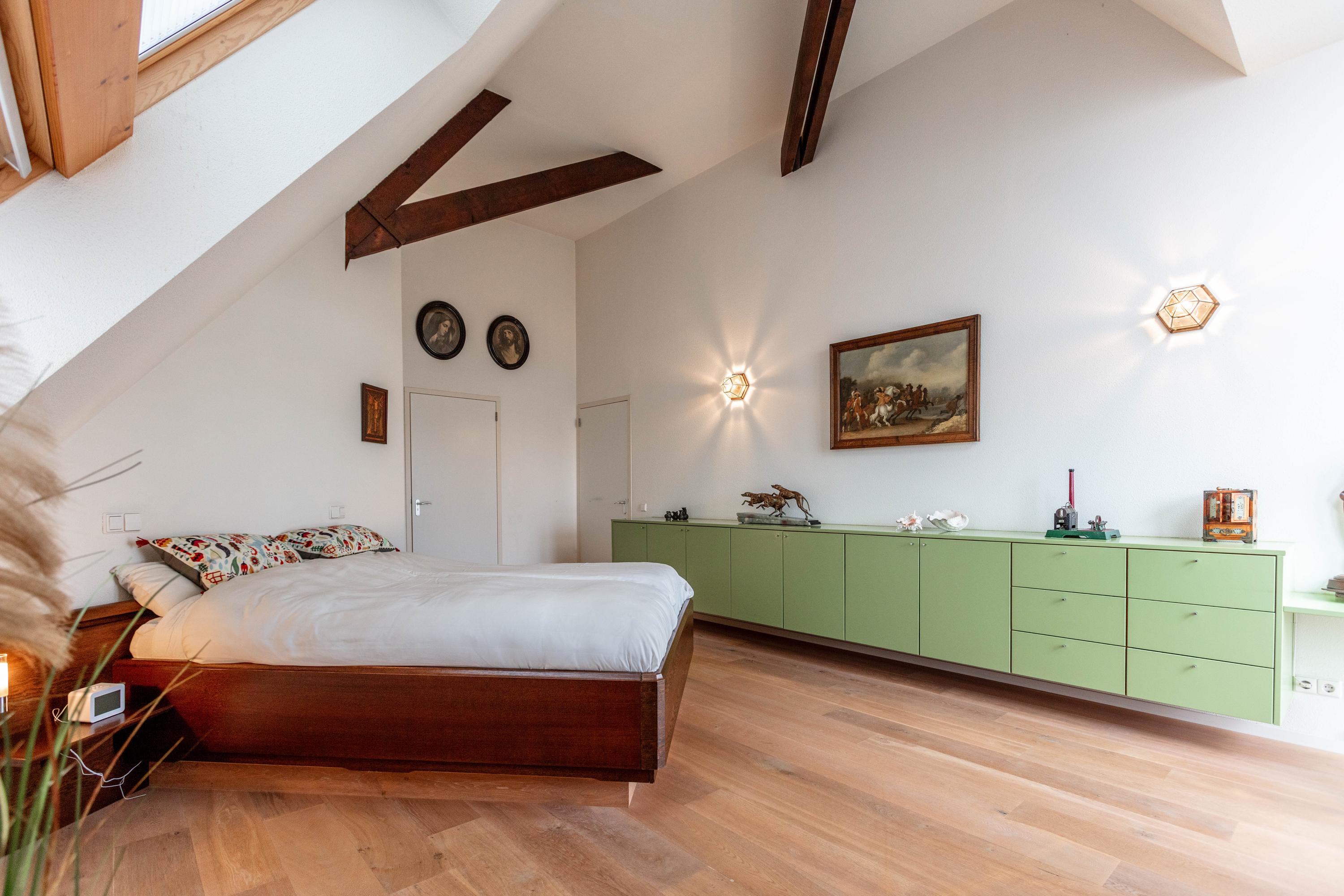 De tweede slaapkamer is ook voorzien van dakvensters en heeft eveneens een eigen badkamer met douche en wastafel.