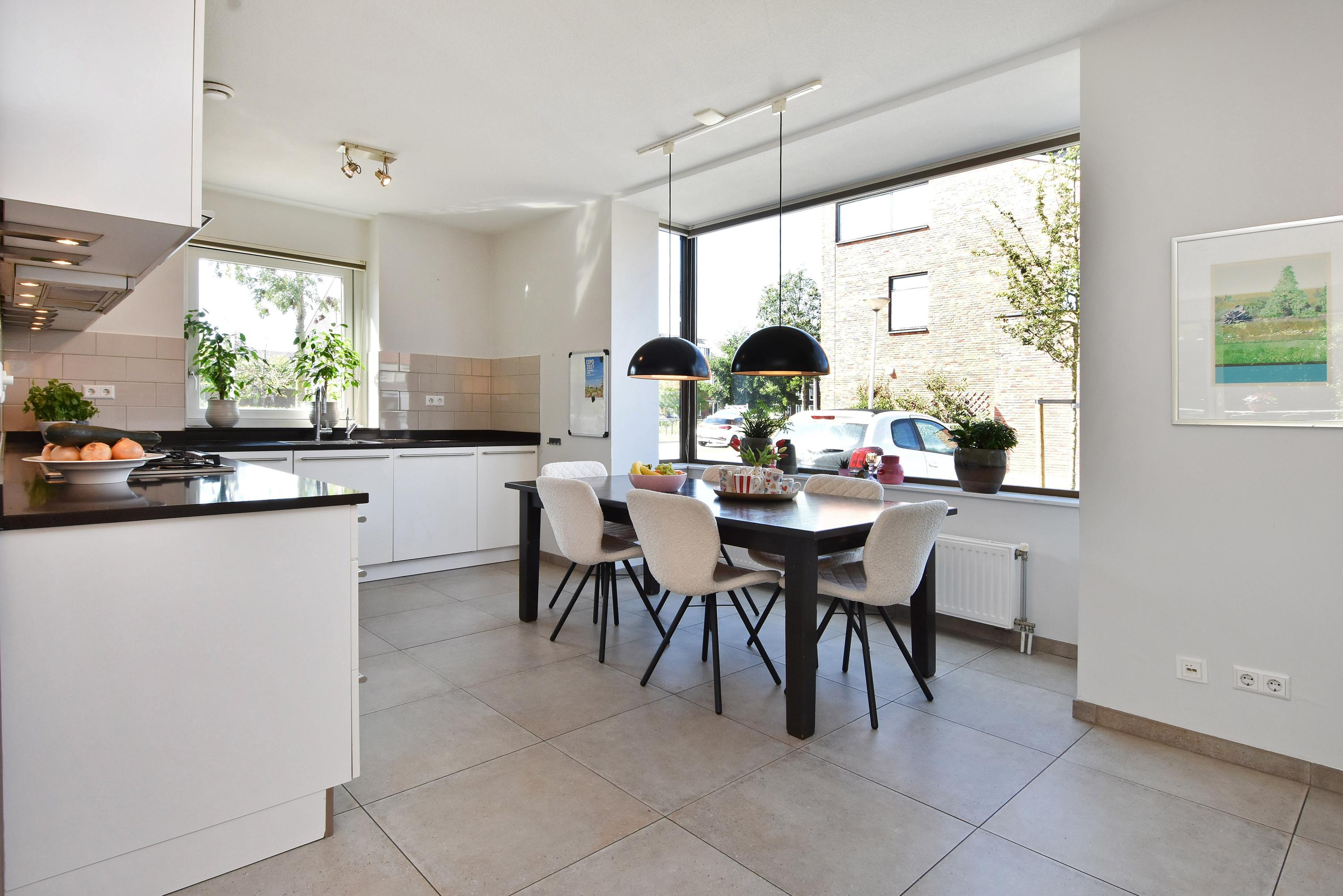 Aan de voorzijde is er een moderne eetkeuken, deze is geplaatst in een praktische U-vorm. Dankzij de grote ramen is de keuken opvallend licht en bovendien van alle gemakken voorzien met hoogwaardige inbouwapparatuur. Er is ruim plaats voor een royale eettafel, waardoor de keuken het kloppend hart van het huis vormt.