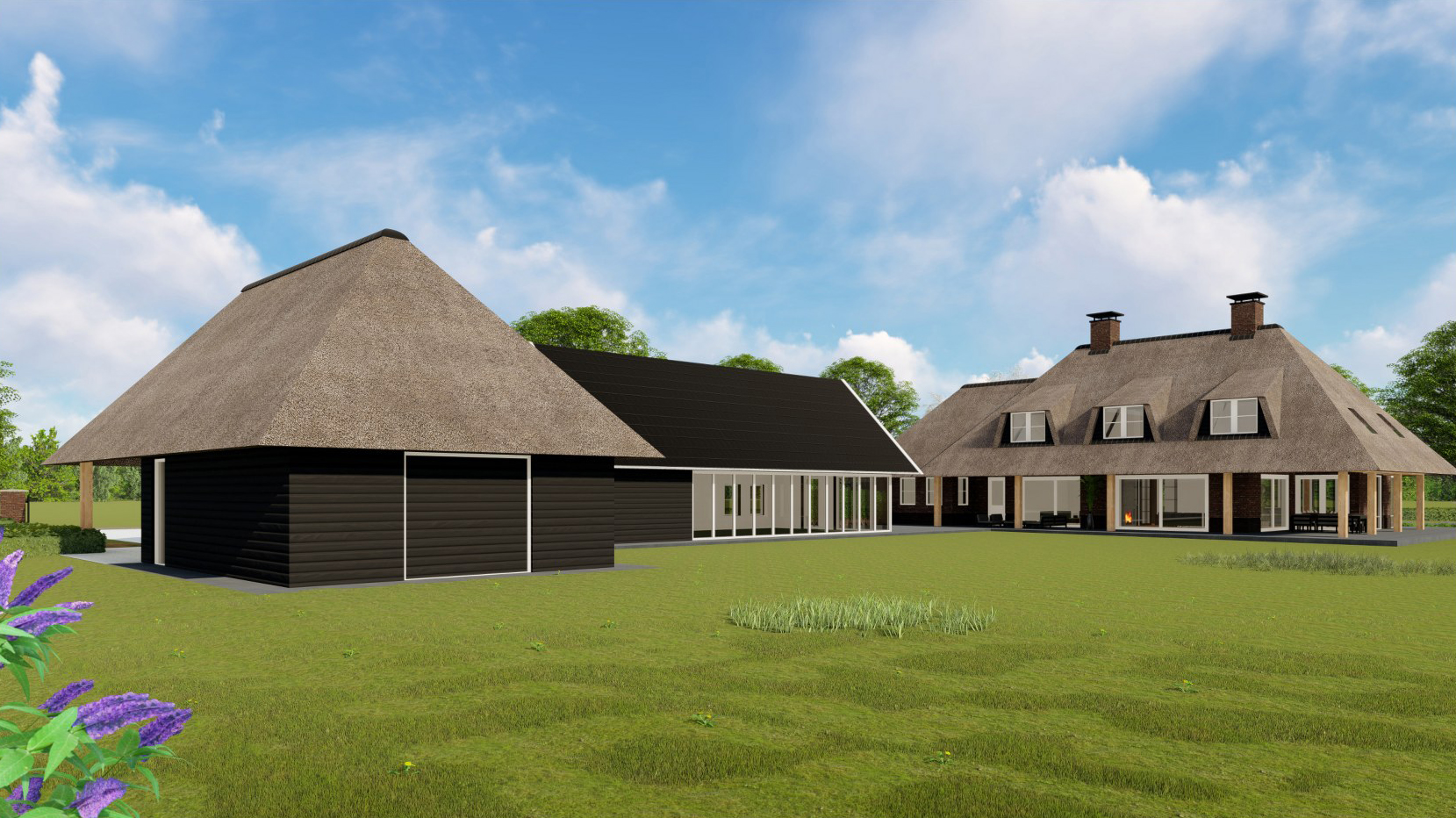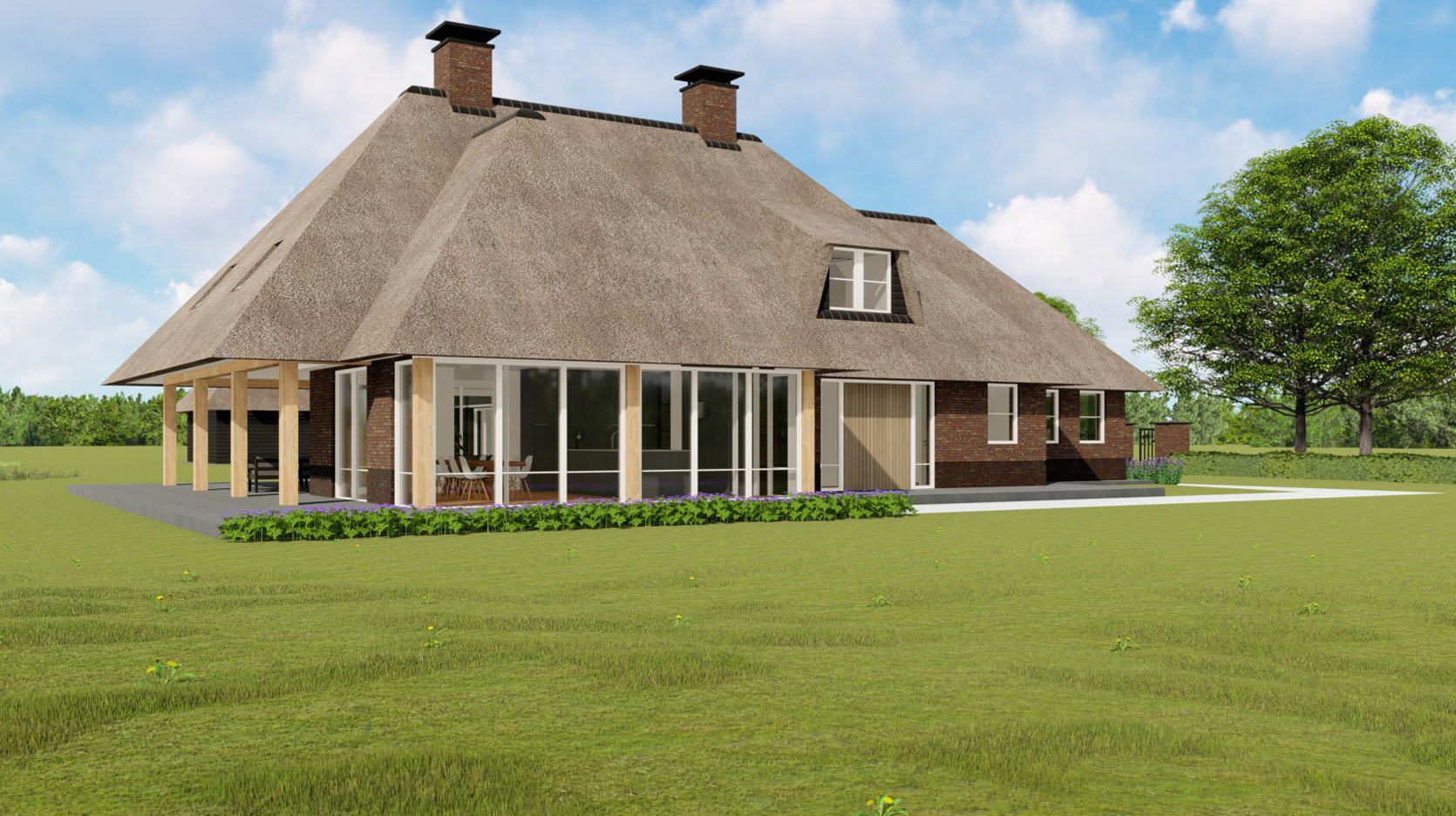 De architect betrokken bij dit ontwerp is Bekhuis & Kleinjan. Het ontwerp is gestoeld op landelijk wonen met een knipoog naar de traditionele Drentse boerderij maar dan met alle luxe en comfort van nu. Rieten daken met gemetselde schoorstenen, stoere eikenhouten palen en balken, grote raampartijen gericht op een prachtige natuurbeleving, brede dak overstekken met overdekte wine- & dine area’s, een pool house (of gastenverblijf) met wellness en een ruime dubbele garage met vliering en carport. Dit alles gesitueerd in een hoefijzeropstelling om maximale privacy te garanderen. Naast de bouwtekeningen is ook een tuinontwerp beschikbaar. De vergunning is verleend voor onbepaalde tijd, de woning vrij te plaatsen op de kavel, onder de voorwaarde dat het oude woonhuis wordt gesloopt.