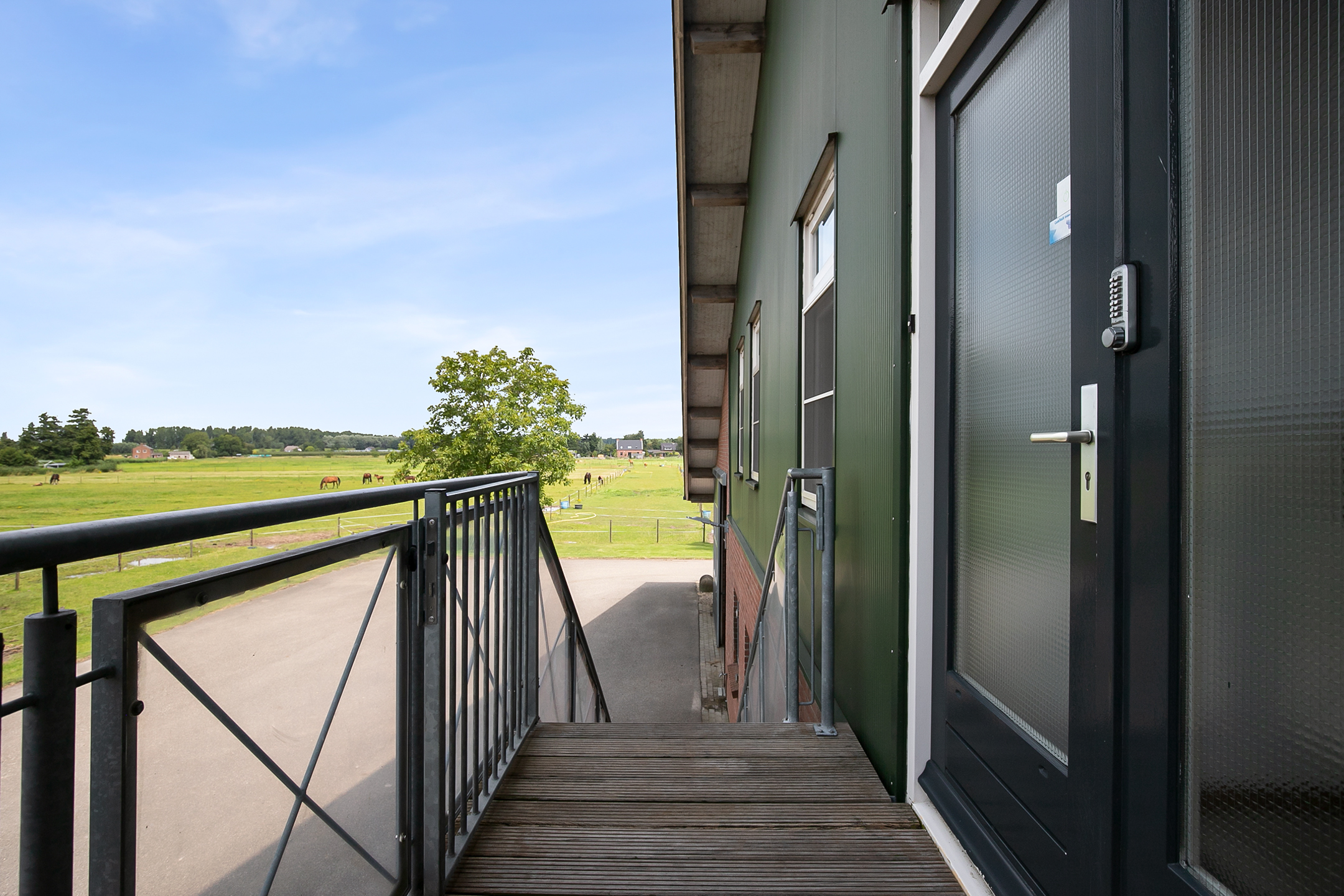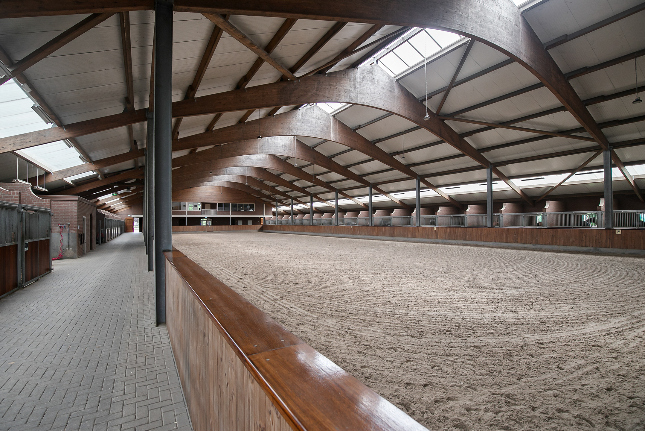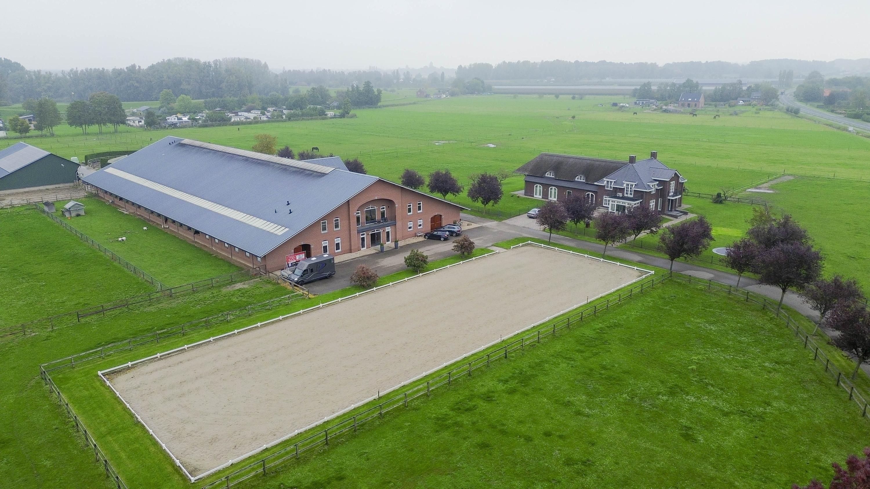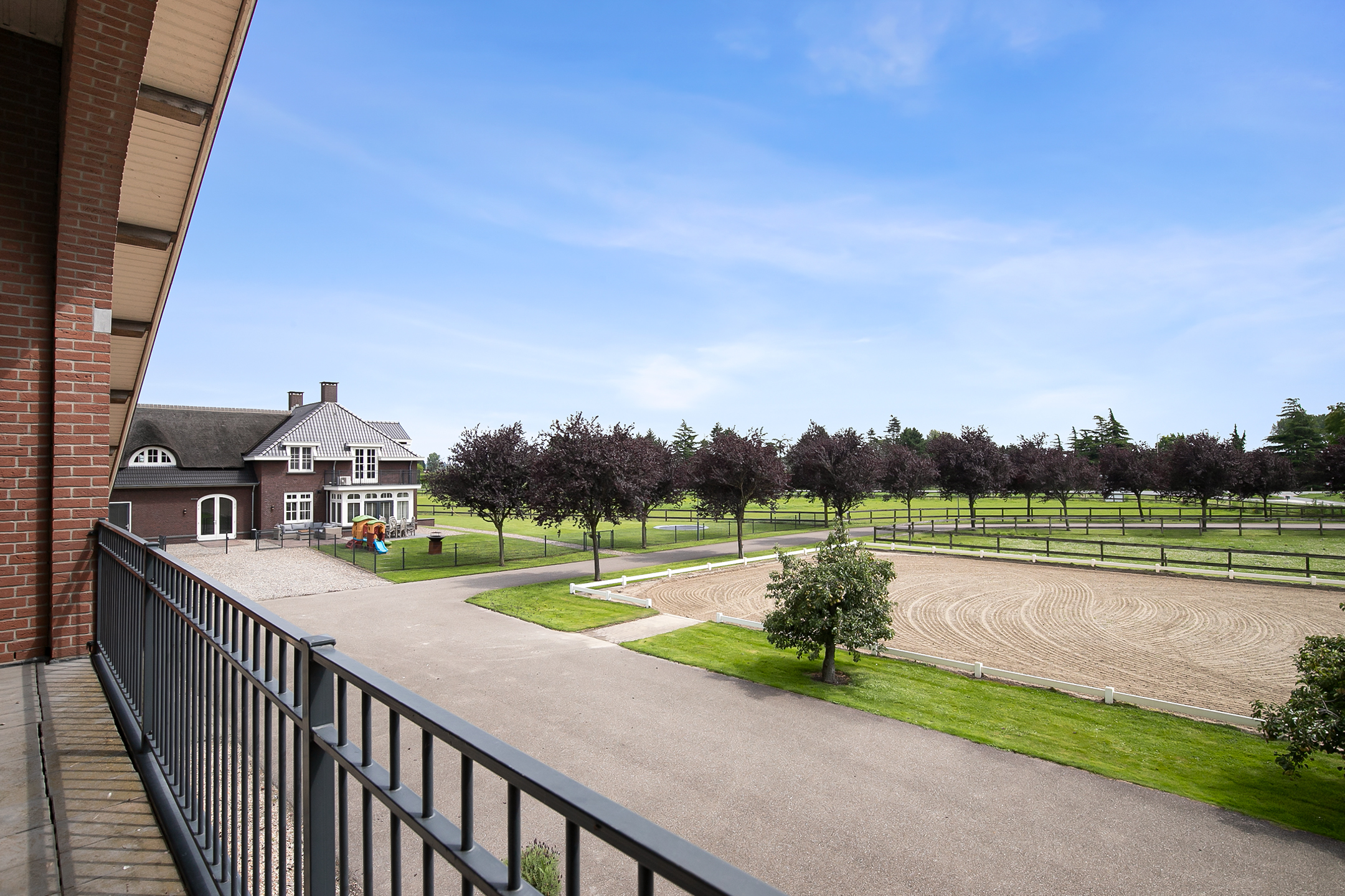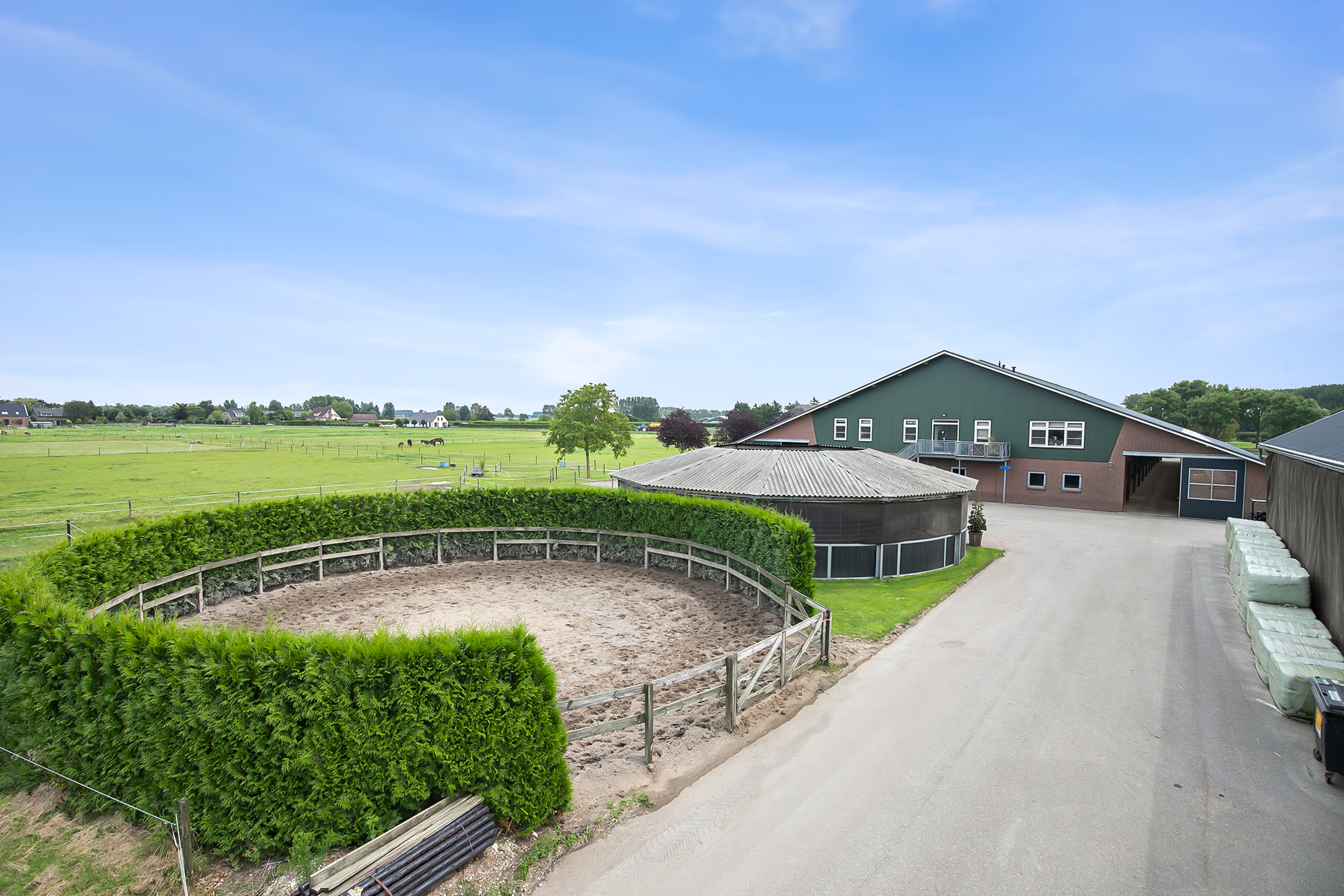 De hal aan de voorzijde van de rijhal is voorzien van een beklinkerde vloer en biedt toegang tot een berging, toiletruimtes, wasruimte en een winkelruimte. Een bordestrap biedt toegang tot de 1e verdieping. Hier is de ontvangstruimte en een appartement gesitueerd. De ontvangstruimte is voorzien van een tegelvloer, stucwerk wanden en een systeemplafond. Er is een keukenblok en een bar aanwezig. Openslaande deuren bieden toegang tot een balkon aan de voorzijde van de rijhal. Grote raampartijen bieden een fraai uitzicht op de binnenpiste en de stallen. Ook is er vanuit de ontvangstruimte toegang tot een balkon boven de binnenpiste.Het appartement is uitgerust met een woonkamer met open keuken, 2 slaapkamers en een ruime badkamer. Het appartement is voorzien van een tegelvloer. Het keukenblok beschikt over een spoelbak, inductiekookplaat, vaatwasser, koelkast en een combimagnetron. De badkamer is geheel betegeld en verder voorzien van een doucheruimte, wastafel met meubel en een zwevend toilet. Achter een praktische schuifwand is een wasruimte gesitueerd. De binnenpiste (ca. 21x61 mtr.) is voorzien van een professionele bodem (Ben Agterberg), een fraaie hardhouten bakrand. Gewelfde houten spanten zorgen voor extra sfeer. Een lichtstraat in de nok zorgt voor fraai natuurlijke lichtinval. Ook is er LED-verlichting aanwezig. De 39 paardenboxen zijn verdeeld over twee stallengangen. De boxen zijn voorzien van deels hardhouten / deels gegalvaniseerde voorwanden en metselwerk tussen- en achterwanden. De deuren van de boxen zijn draaibaar. De boxen zijn tevens uitgerust met een buitenluik. Iedere stallengang beschikt over eigen faciliteiten zoals wasplaatsen en een zadelkamer. Tussen de gangen zijn nog drie ruime loopstallen gesitueerd. De wasplaatsen zijn voorzien van een warm- en koud watervoorziening. Ook is er een plaats voor de hoefsmid en fysio aanwezig. Aan de achterzijde is nog een appartement gesitueerd. Middels een bordestrap aan de buitenzijde is er toegang. Hier is tevens een balkon gesitueerd. Het appartement beschikt over een ruime woonkamer met open keuken, 3 slaapkamers, een ruime badkamer, een bijkeuken, wasruimte en een toiletruimte.Aan de achterzijde van het perceel is een vrijstaande veldschuur gesitueerd. De schuur is opgetrokken uit metselwerk plinten met damwand gevels en het geisoleerde dak is met sandwichpanelen gedekt. Aan de voorzijde is de veldschuur voorzien van windbreekgaas. In de schuur is een voersilo aanwezig. Er zijn momenteel 14 paardenboxen en een longeercirkel gesitueerd, maar uiteraard is deze schuur geheel naar wens ook uitermate geschikt voor diverse andere doeleinden.