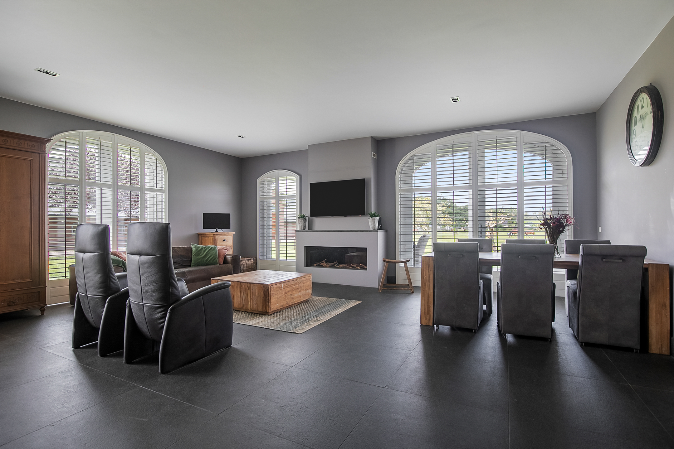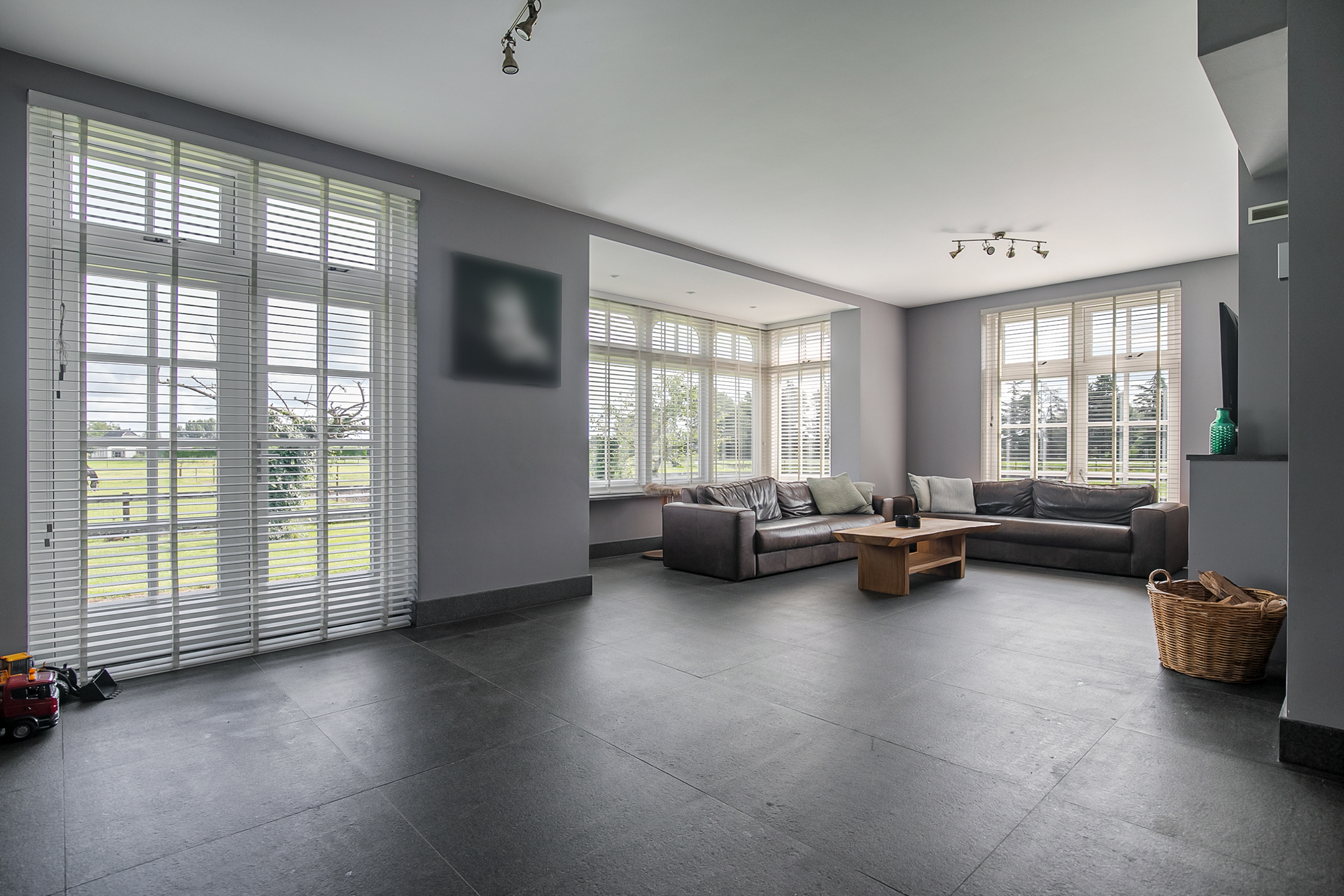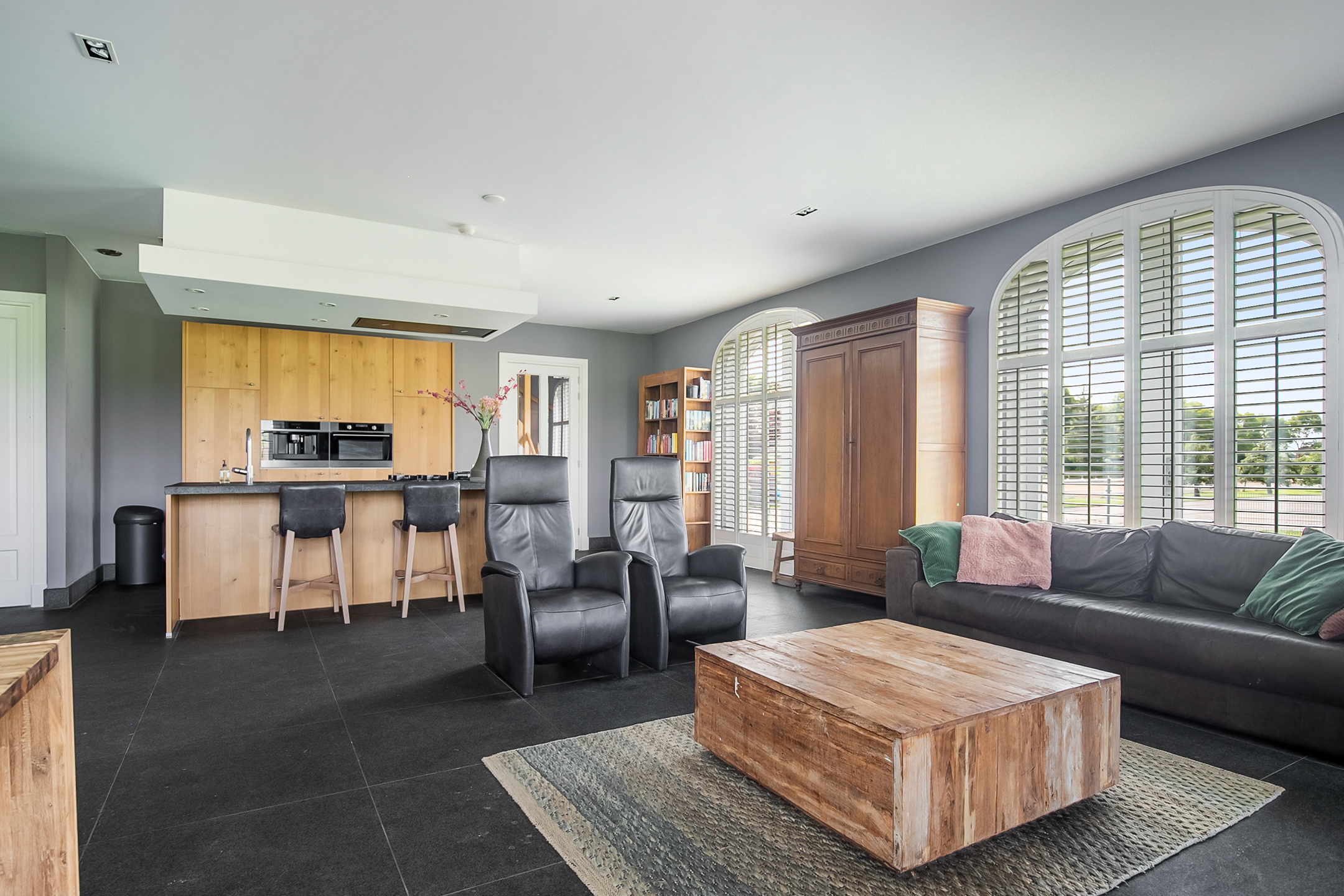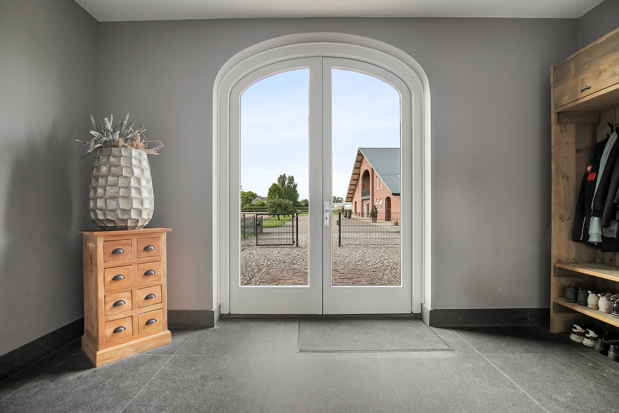 De overdekte entree met een dubbele openslaande voordeur, geeft deze villa een fraaie uitstraling. De ruime ontvangsthal met imposante houten trap biedt toegang tot de woonkamer en de 1e verdieping. De hal is voorzien van een natuurstenen tegelvloer, stucwerk wanden en een stucwerk plafond. De royale leefkeuken met eetkamergedeelte is voorzien van een natuurstenen tegelvloer, stucwerk wanden en een stucwerk plafond met inbouwverlichting. De keuken beschikt over een inrichting in een wandopstelling met apparatenwand en een kook- en spoeleiland. De apparatenwand is verder uitgerust met een oven, koffiezetapparaat, een stoomoven en een koelkast. Het eiland beschikt over een 5-pits gaskookplaat met ingebouwde afzuigkap in het plafond, een spoelbak en een vaatwasser. Diverse kastjes en lades zorgen voor veel opbergruimte. Een grote erker/uitbouw met openslaande deuren zorgen voor toegang naar de tuin. De vele raampartijen zorgen voor veel natuurlijke lichtinval. Een haard zorgt voor extra sfeer en warmte in de ruimte. Vanuit de woonkamer is er een fraai uitzicht op de paardenweides. En ook hier zorgen grote raampartijen en dubbele openslaande deuren voor een zee van licht. Daarnaast is er een prachtige, grote schouw aanwezig met een gashaard welke zorgt voor nog extra sfeer en warmte in de ruimte. Schuifdeuren zorgen dat de woonkamer afgesloten kan worden van de keuken/eetgedeelte. Halfronde openslaande deuren in de zijgevel van de woning zorgen voor toegang tot het voorhuis. De ruime entreehal biedt toegang tot de bijkeuken/wasruimte, woonkamer, toiletruimte en de meterkast. De bijkeuken/wasruimte is uitgerust met een gootsteen. Tevens zijn hier de aansluitingen voor de wasapparatuur gesitueerd. Vanuit hier is er toegang tot de kantoor/werkkamer. De kantoorruimte is een fijne ruimte welke uiteraard voor diverse doeleinden geschikt is, zoals bijvoorbeeld een speelkamer of chillroom.