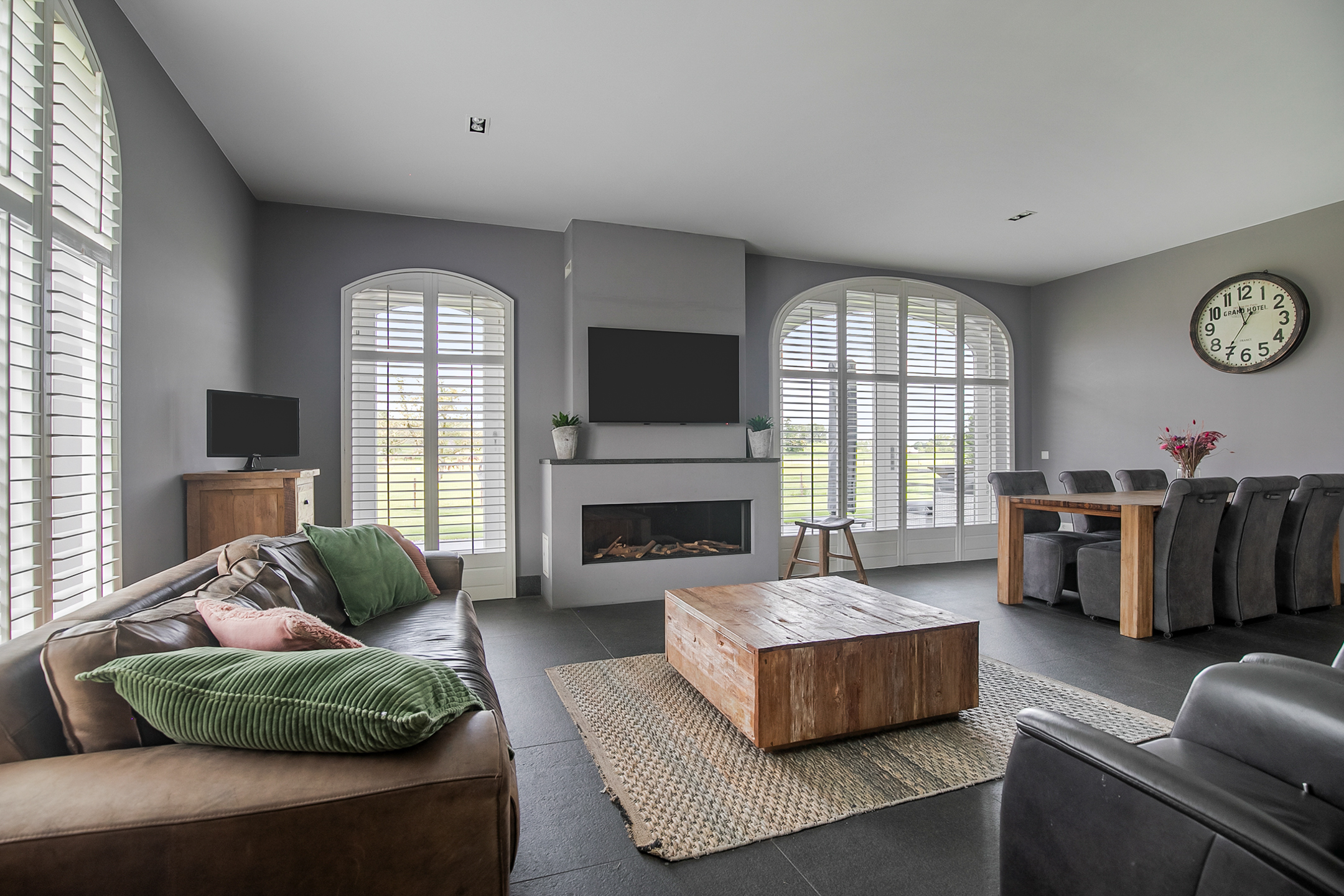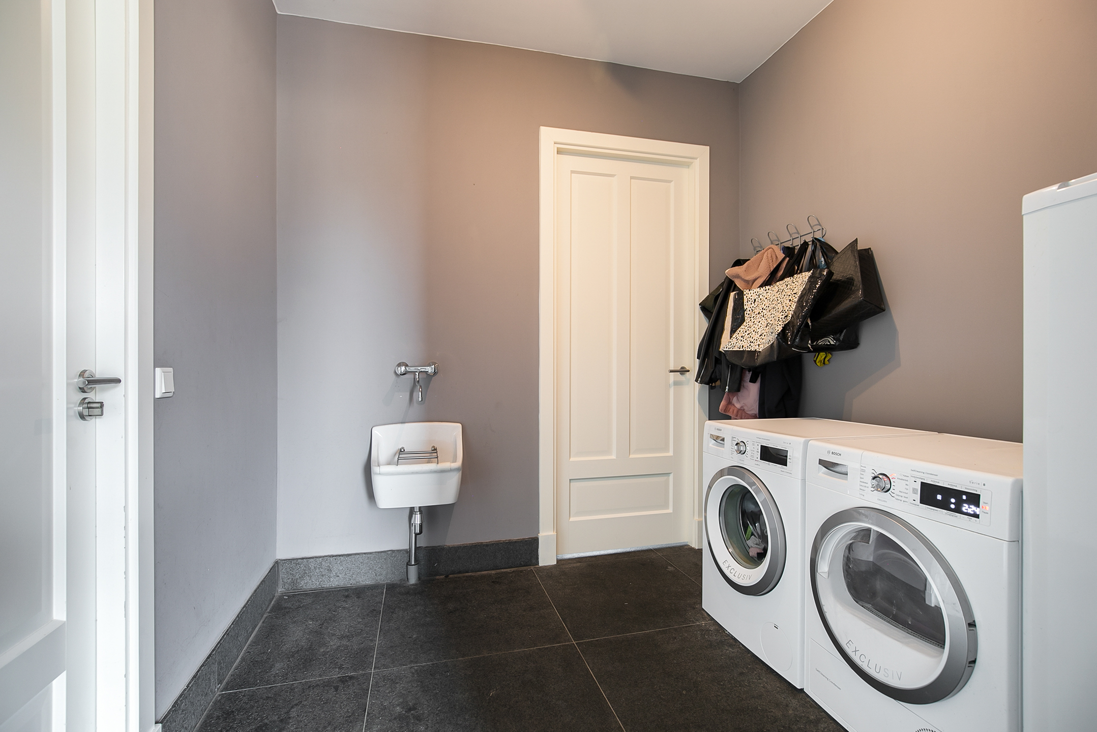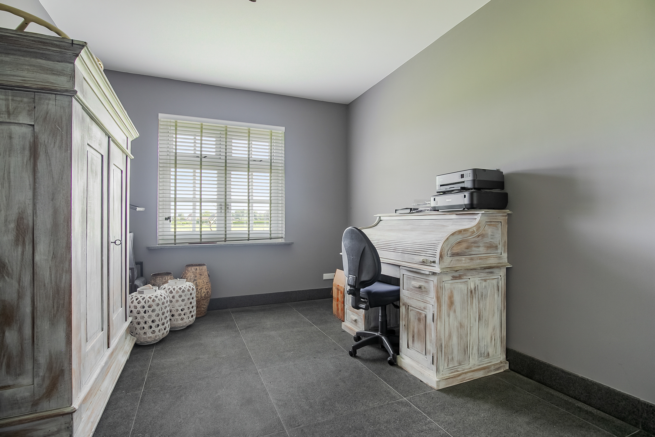 De overdekte entree met een dubbele openslaande voordeur, geeft deze villa een fraaie uitstraling. De ruime ontvangsthal met imposante houten trap biedt toegang tot de woonkamer en de 1e verdieping. De hal is voorzien van een natuurstenen tegelvloer, stucwerk wanden en een stucwerk plafond. De royale leefkeuken met eetkamergedeelte is voorzien van een natuurstenen tegelvloer, stucwerk wanden en een stucwerk plafond met inbouwverlichting. De keuken beschikt over een inrichting in een wandopstelling met apparatenwand en een kook- en spoeleiland. De apparatenwand is verder uitgerust met een oven, koffiezetapparaat, een stoomoven en een koelkast. Het eiland beschikt over een 5-pits gaskookplaat met ingebouwde afzuigkap in het plafond, een spoelbak en een vaatwasser. Diverse kastjes en lades zorgen voor veel opbergruimte. Een grote erker/uitbouw met openslaande deuren zorgen voor toegang naar de tuin. De vele raampartijen zorgen voor veel natuurlijke lichtinval. Een haard zorgt voor extra sfeer en warmte in de ruimte. Vanuit de woonkamer is er een fraai uitzicht op de paardenweides. En ook hier zorgen grote raampartijen en dubbele openslaande deuren voor een zee van licht. Daarnaast is er een prachtige, grote schouw aanwezig met een gashaard welke zorgt voor nog extra sfeer en warmte in de ruimte. Schuifdeuren zorgen dat de woonkamer afgesloten kan worden van de keuken/eetgedeelte. Halfronde openslaande deuren in de zijgevel van de woning zorgen voor toegang tot het voorhuis. De ruime entreehal biedt toegang tot de bijkeuken/wasruimte, woonkamer, toiletruimte en de meterkast. De bijkeuken/wasruimte is uitgerust met een gootsteen. Tevens zijn hier de aansluitingen voor de wasapparatuur gesitueerd. Vanuit hier is er toegang tot de kantoor/werkkamer. De kantoorruimte is een fijne ruimte welke uiteraard voor diverse doeleinden geschikt is, zoals bijvoorbeeld een speelkamer of chillroom.