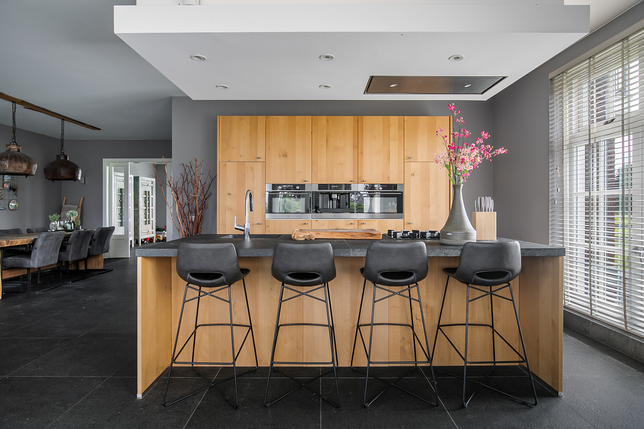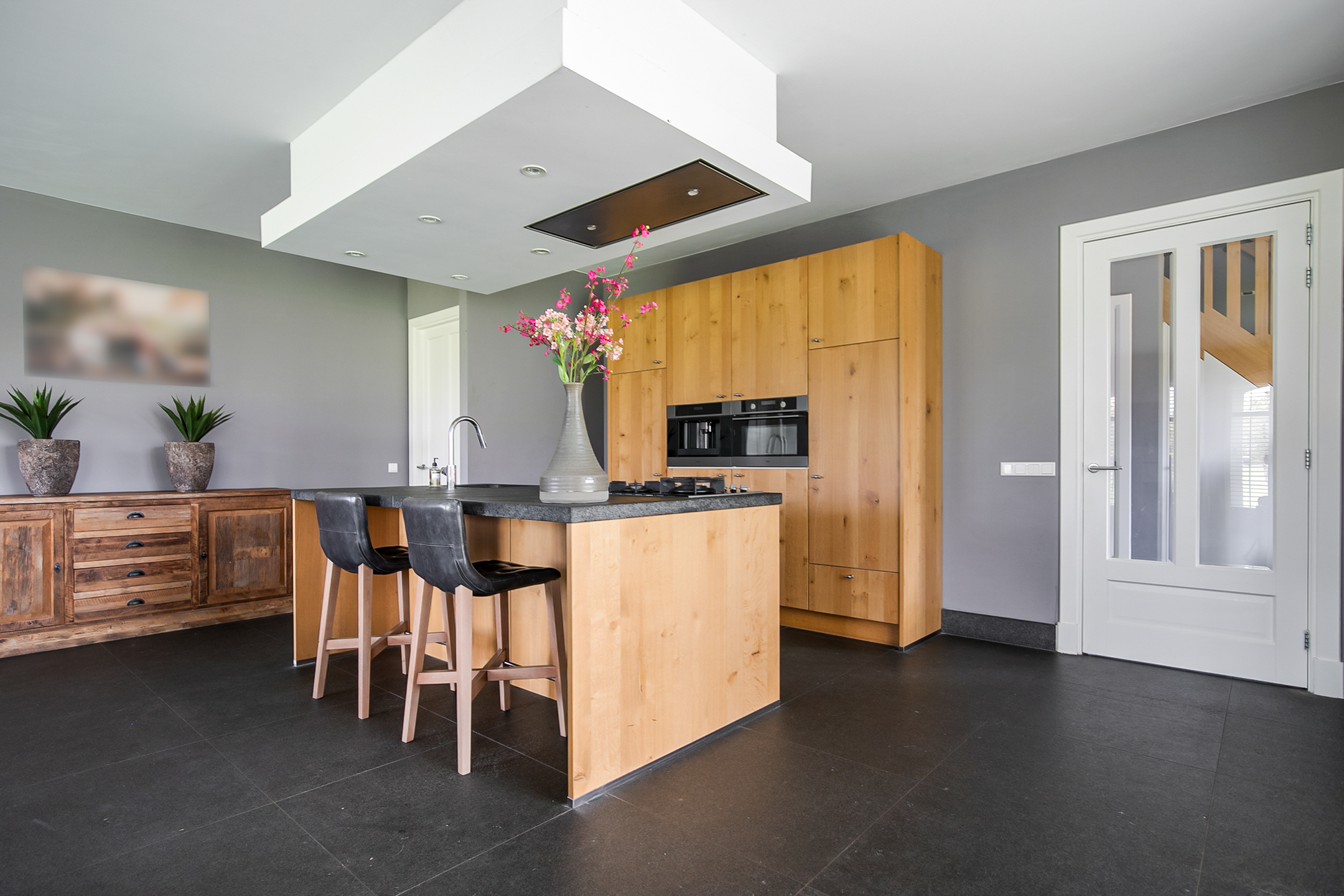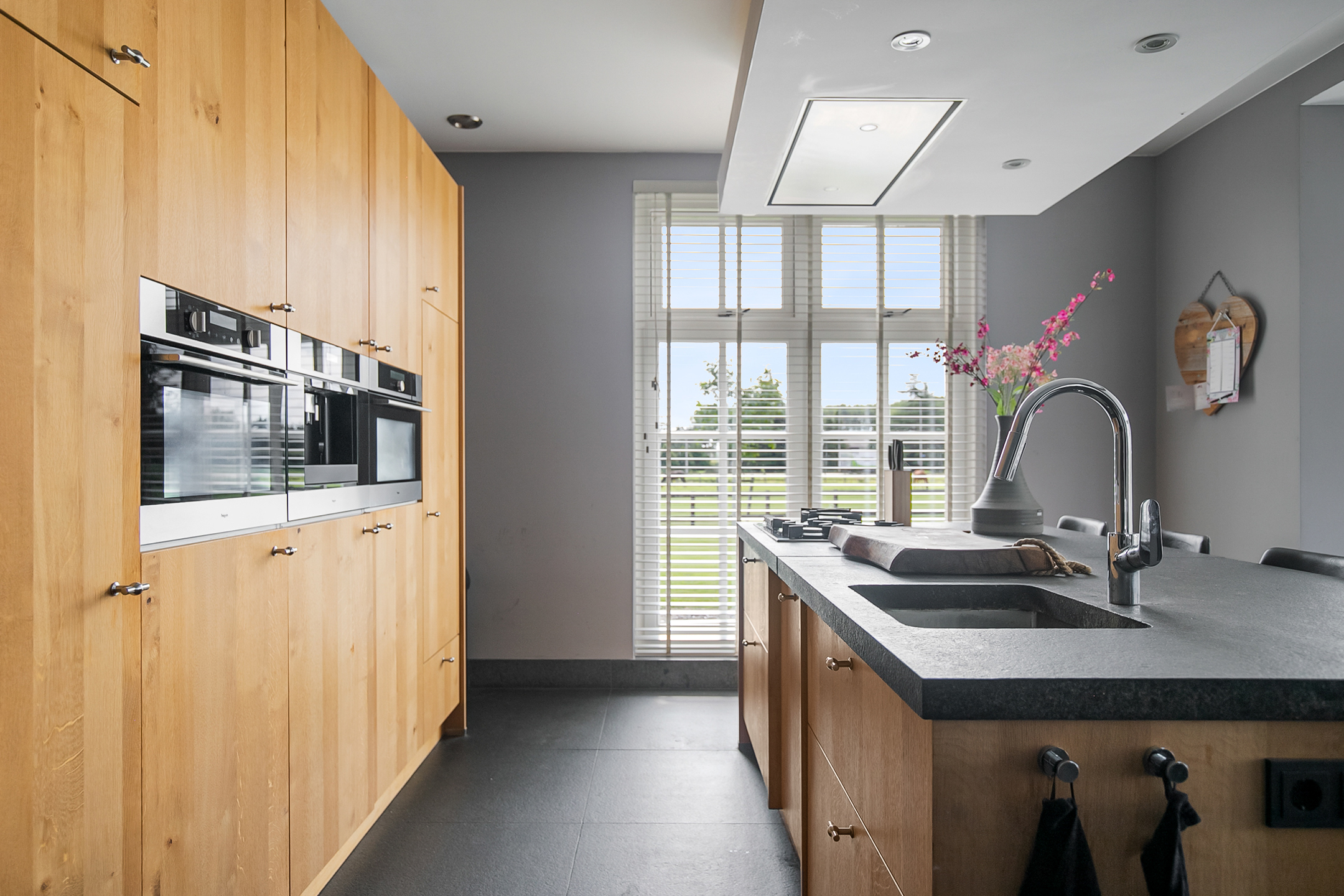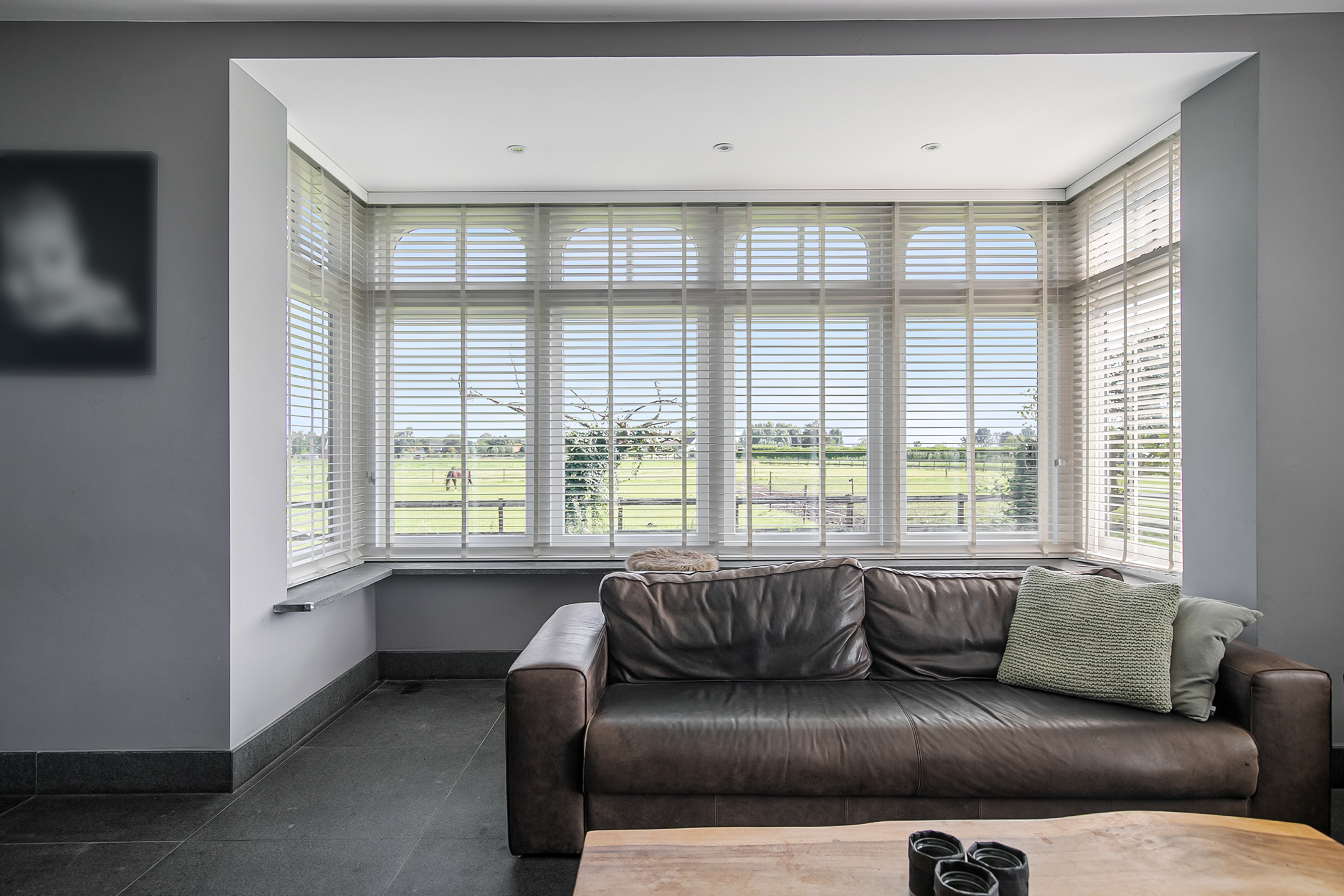 De overdekte entree met een dubbele openslaande voordeur, geeft deze villa een fraaie uitstraling. De ruime ontvangsthal met imposante houten trap biedt toegang tot de woonkamer en de 1e verdieping. De hal is voorzien van een natuurstenen tegelvloer, stucwerk wanden en een stucwerk plafond. De royale leefkeuken met eetkamergedeelte is voorzien van een natuurstenen tegelvloer, stucwerk wanden en een stucwerk plafond met inbouwverlichting. De keuken beschikt over een inrichting in een wandopstelling met apparatenwand en een kook- en spoeleiland. De apparatenwand is verder uitgerust met een oven, koffiezetapparaat, een stoomoven en een koelkast. Het eiland beschikt over een 5-pits gaskookplaat met ingebouwde afzuigkap in het plafond, een spoelbak en een vaatwasser. Diverse kastjes en lades zorgen voor veel opbergruimte. Een grote erker/uitbouw met openslaande deuren zorgen voor toegang naar de tuin. De vele raampartijen zorgen voor veel natuurlijke lichtinval. Een haard zorgt voor extra sfeer en warmte in de ruimte. Vanuit de woonkamer is er een fraai uitzicht op de paardenweides. En ook hier zorgen grote raampartijen en dubbele openslaande deuren voor een zee van licht. Daarnaast is er een prachtige, grote schouw aanwezig met een gashaard welke zorgt voor nog extra sfeer en warmte in de ruimte. Schuifdeuren zorgen dat de woonkamer afgesloten kan worden van de keuken/eetgedeelte. Halfronde openslaande deuren in de zijgevel van de woning zorgen voor toegang tot het voorhuis. De ruime entreehal biedt toegang tot de bijkeuken/wasruimte, woonkamer, toiletruimte en de meterkast. De bijkeuken/wasruimte is uitgerust met een gootsteen. Tevens zijn hier de aansluitingen voor de wasapparatuur gesitueerd. Vanuit hier is er toegang tot de kantoor/werkkamer. De kantoorruimte is een fijne ruimte welke uiteraard voor diverse doeleinden geschikt is, zoals bijvoorbeeld een speelkamer of chillroom.