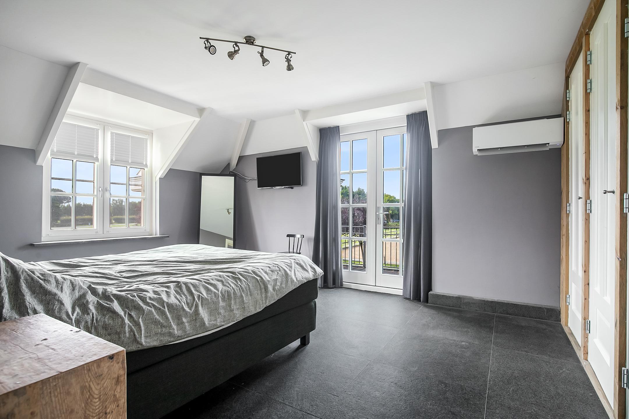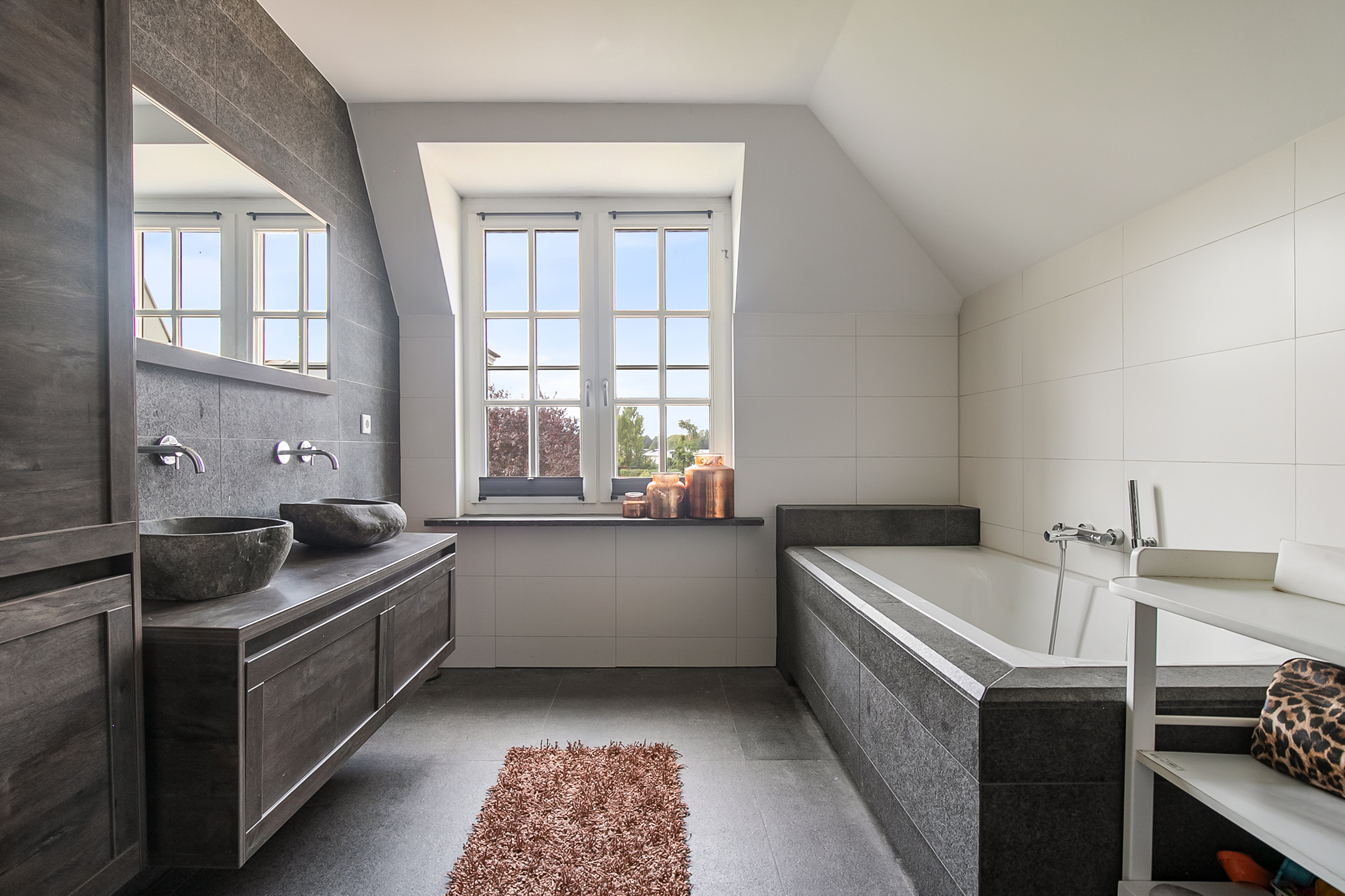 De masterbedroom is uitgerust met een praktische vaste kastenwand en een airco. Openslaande deuren zorgen vanuit hier voor toegang tot het dakterras. Vanaf het dakterras is er een fraai zicht op de tuin en bijbehorende accommodatie.De geheel betegelde badkamer is uitgerust met een ligbad, een badkamermeubel met 2 fraaie waskommen en een inloopdouche. De separate toiletruimte beschikt over een zwevend toilet en een fonteintje.
