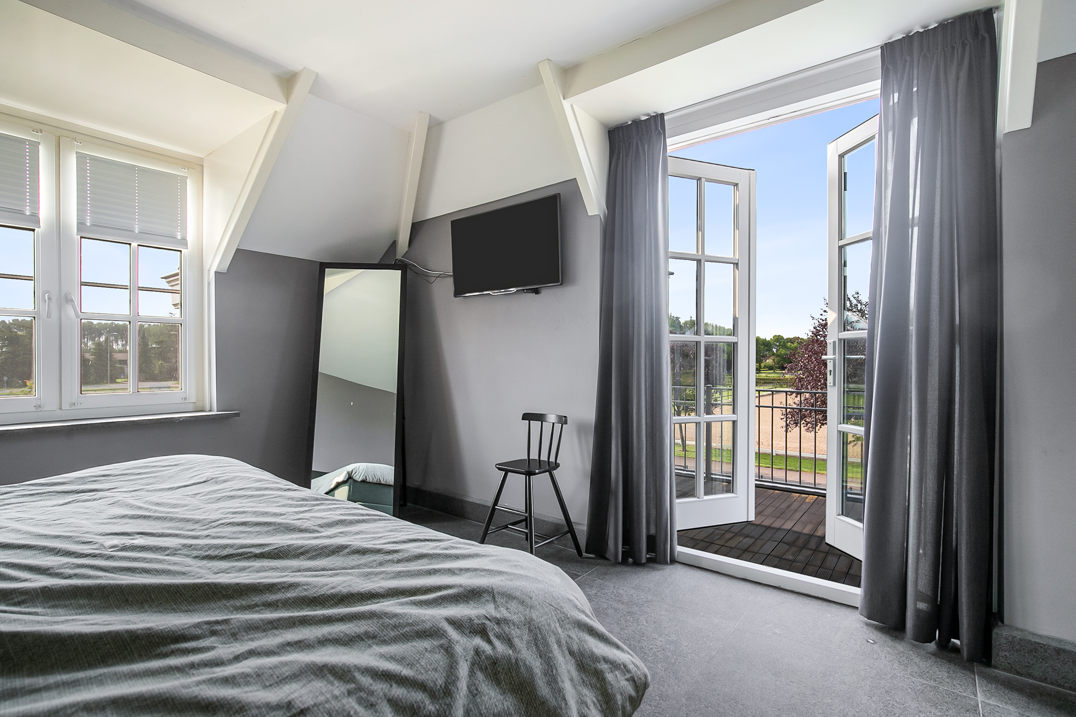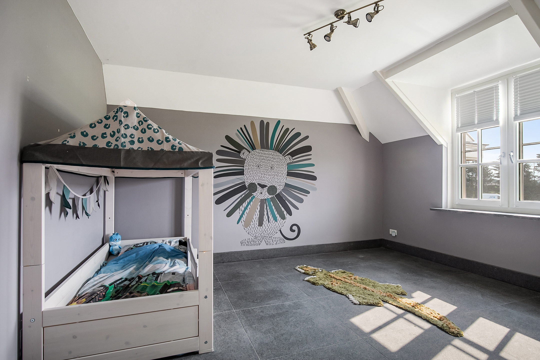 De royale overloop met vide biedt toegang tot 3 ruime slaapkamers, de badkamer, toiletruimte en de zolder. Ook is er toegang tot een charmant Frans balkon welke een fraai uitzicht biedt op de omgeving. De overloop en alle slaapkamers hebben dezelfde afwerking, natuurstenen vloer, stucwerk wanden en een stucwerk plafond.