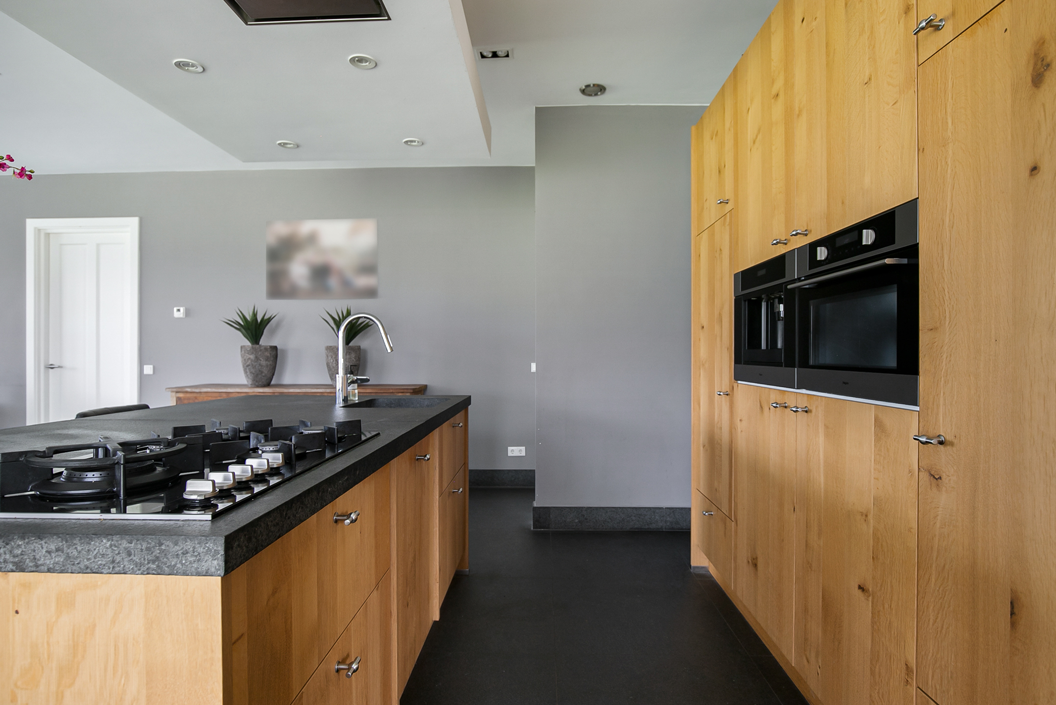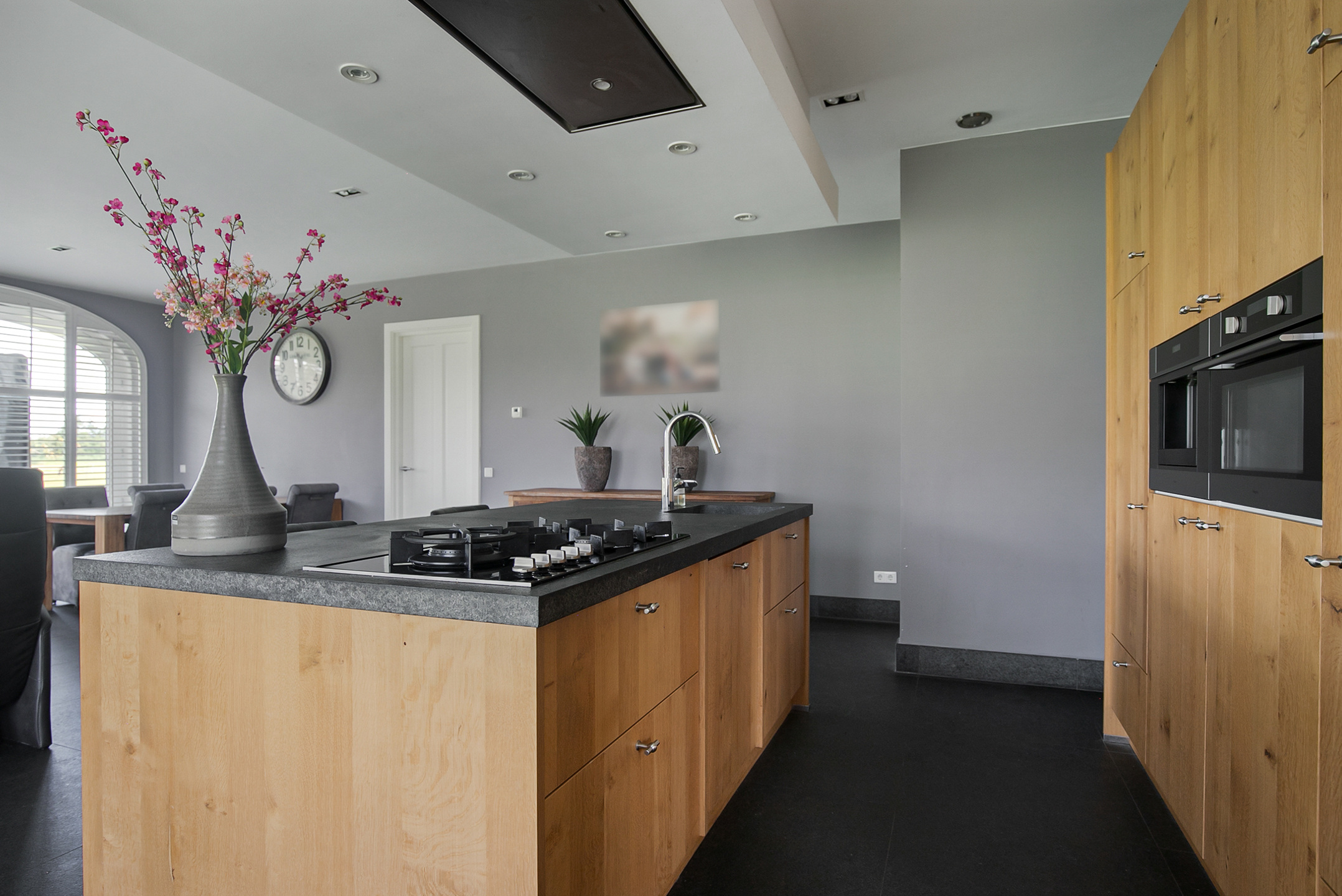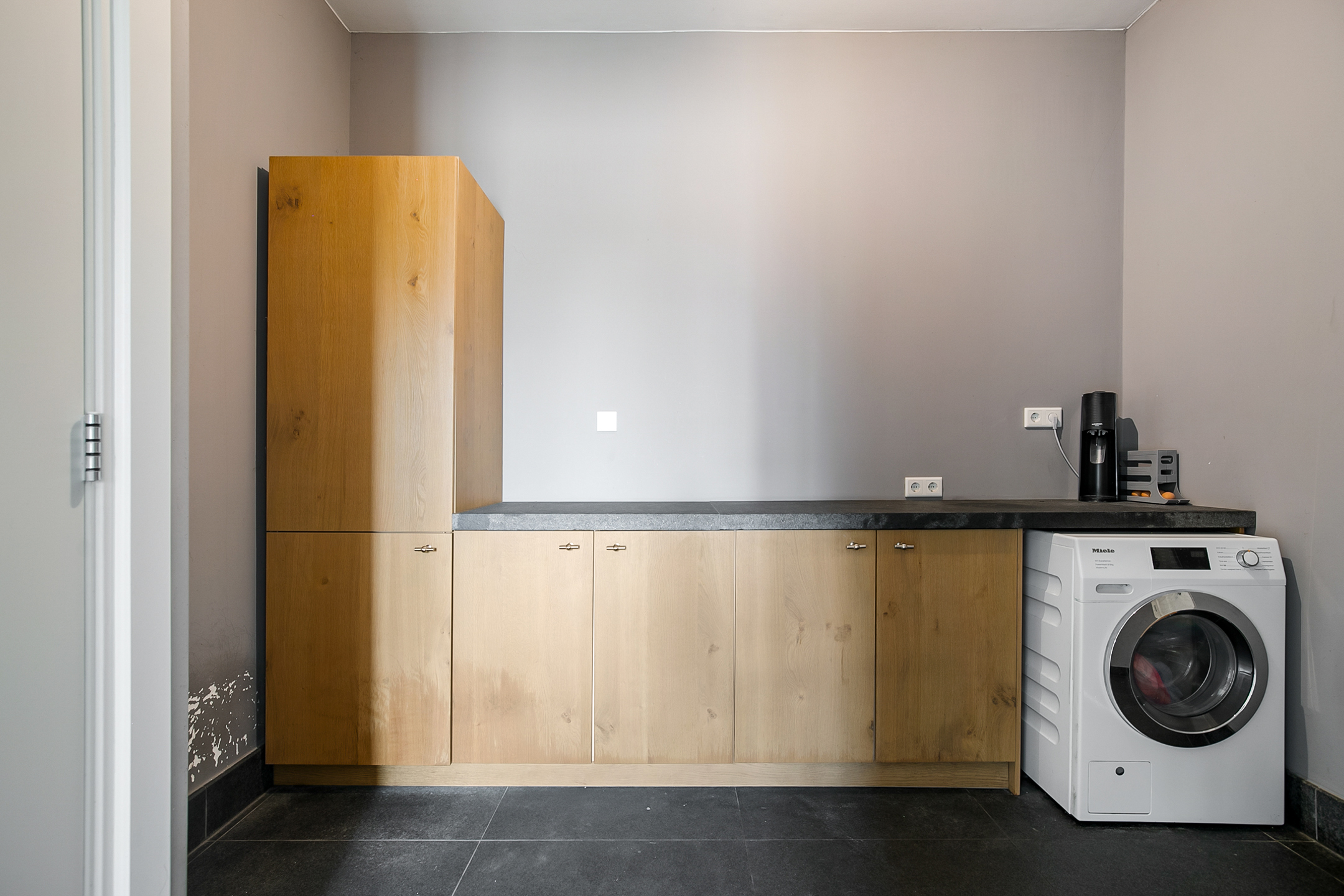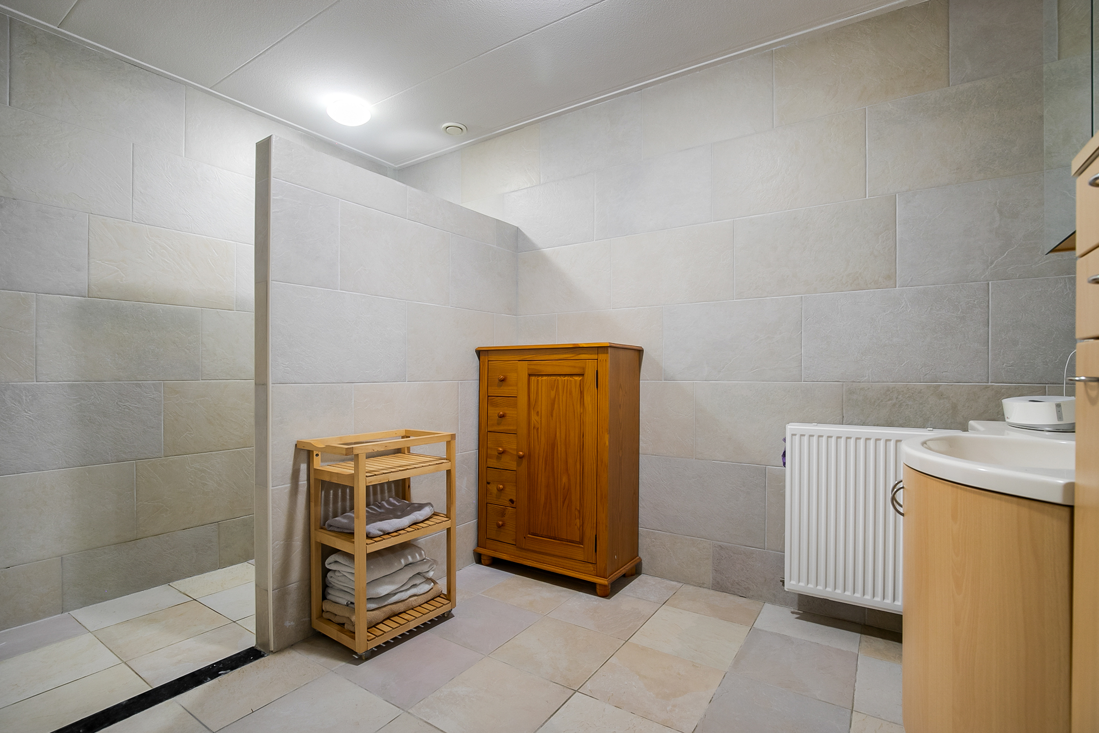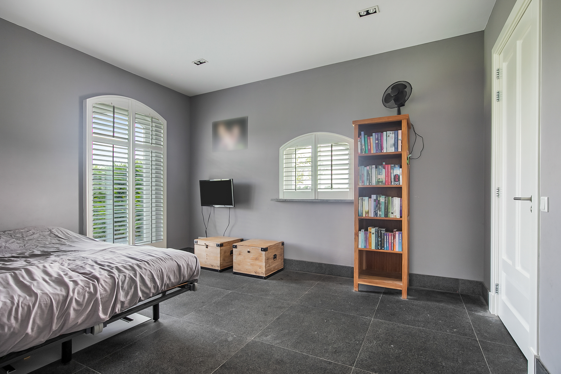 De hal biedt toegang tot de woonkamer, bijkeuken, toiletruimte en de vaste trapopgang tot de zolderruimte op de 1e verdieping. In de trapkast is de unit voor de vloerverwarming gesitueerd. De toiletruimte is deels betegeld en verder voorzien van een zwevend toilet en een fonteintje. De praktische bijkeuken is uitgerust met een op maat gemaakt keukenblok. De aansluitingen voor de wasapparatuur zijn hier gesitueerd. Ook is er vanuit hier toegang tot de meterkast. Een loopdeur zorgt vanuit de bijkeuken voor toegang tot de bijkeuken/wasruimte van het voorhuis. De sfeervolle woonkamer met open keuken is voorzien van een natuurstenen vloer, stucwerk wanden en een stucwerk plafond met inbouwverlichting. Drie stuks dubbele openslaande deuren en een grote raampartij voorzien van fraaie en praktische shutters zorgen voor veel natuurlijke lichtinval. Een fraaie schouw met gashaard zorgt voor extra sfeer en warmte in de ruimte. De keuken beschikt over een inrichting in een wandopstelling met apparatenwand en een kook- en spoeleiland. De apparatenwand is verder uitgerust met een combioven, koffiezetapparaat, een koelkast en een vriezer. Het eiland beschikt over een 4-pits gaskookplaat met wokbrander en ingebouwde afzuigkap in het plafond, een spoelbak en een vaatwasser. Diverse kastjes en lades zorgen voor veel opbergruimte. Vanuit de woonkamer is er toegang tot de logeerkamer. Deze slaapkamer is voorzien van een natuurstenen vloer, stucwerk wanden en een stucwerk plafond met inbouwverlichting. Vanuit deze kamer is er toegang tot de badkamer. Deze badkamer is afgewerkt met dezelfde natuurstenen vloer als in de rest van de ruimtes. De wanden en het plafond zijn voorzien van stucwerk. De badkamer is verder uitgerust met een ruime inloopdouche met sunshower, twee wastafels met meubel een zwevend toilet en een design radiator. Een raampartij zorgt voor natuurlijk lichtinval. Vanuit de badkamer loop je verder naar de masterbedroom. Deze masterbedroom is uitgerust met praktische vaste kastenwand, welke zorgt voor veel opbergruimte. Een raampartij zorgt ook hier voor natuurlijke lichtinval.