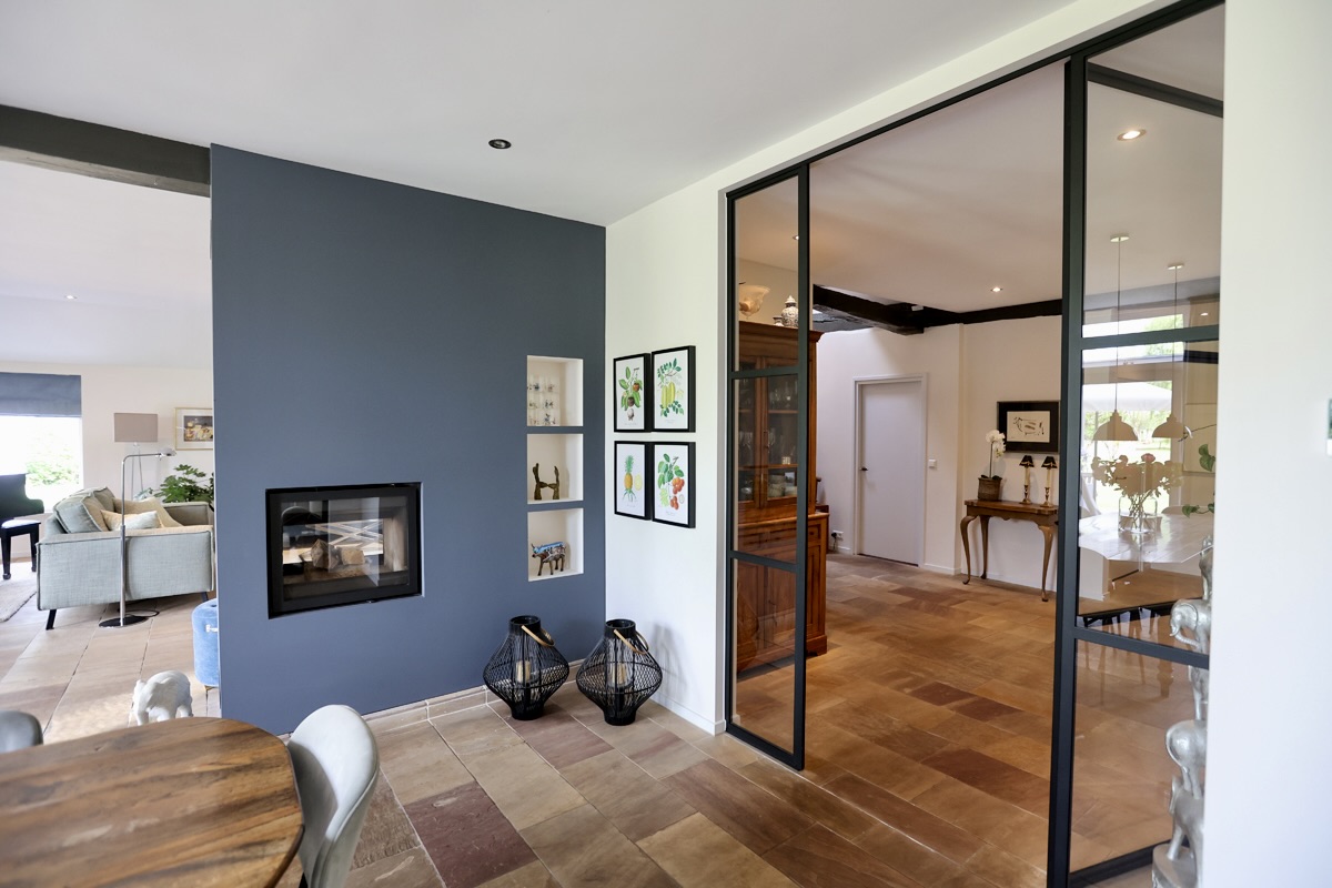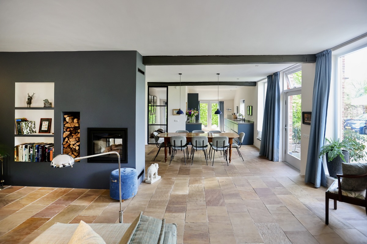 Loop je verder, dan opent zich aan de achterkant van de woning een verrassend ruime en lichte woonkamer, waar een open haard voor gezellige winteravonden zorgt. De kamer grenst naadloos aan het eetgedeelte en een moderne open keuken voorzien van Miele inbouwapparatuur– samen vormen ze het hart van het huis, met uitzicht op de diepe tuin en daarachter het weidse landschap. Geen schilderij kan hieraan tippen. De naastgelegen bijkeuken zorgt voor extra opslag en praktisch gemak.