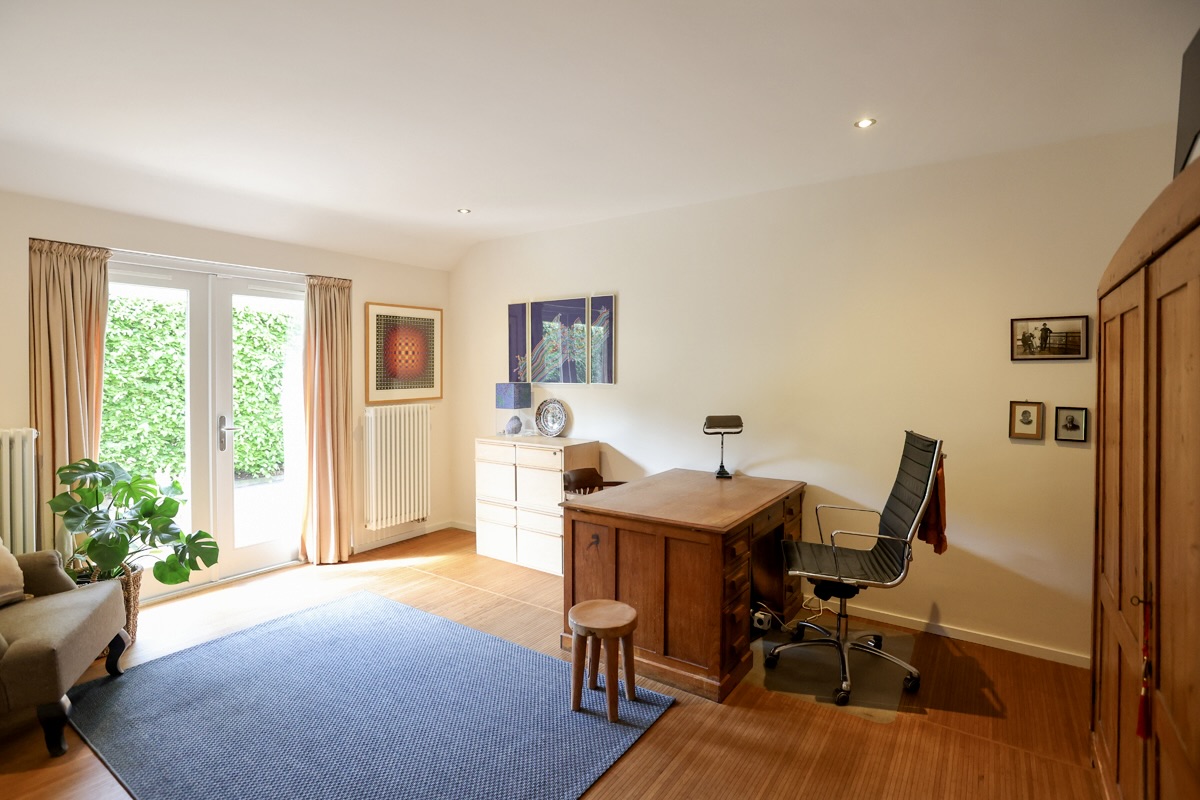 Binnen word je verwelkomd in een ruime hal waar direct het gevoel van huiselijkheid je tegemoetkomt. Aan de voorzijde bevindt zich een sfeervolle werkkamer, ideaal voor wie graag in alle rust thuis werkt – of simpelweg een goed boek wil lezen. Aan dezelfde zijde is er een royale slaapkamer op de begane grond, met een eigen badkamer voorzien van een wastafelmeubel, ligbad, douche en aansluitingen voor wasmachine en droger. Daarnaast is er een separaat toilet.