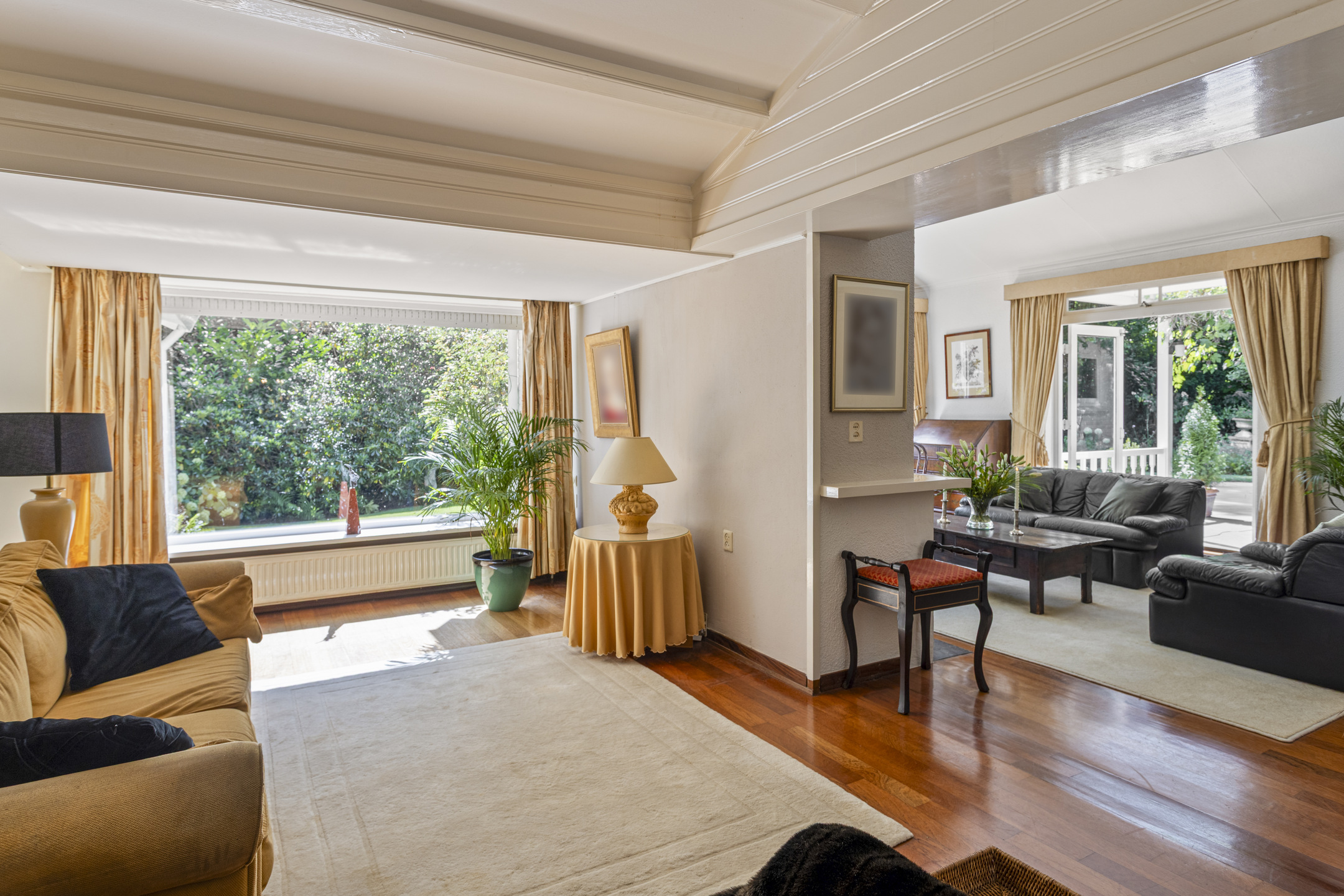 De elegante tuinkamer verbindt woonkamer met de serre, maar is een heerlijke zitruimte op zich, met uiteraard het prachtige uitzicht. De houtvloer contrasteert fraai met de frisse witte wanden.