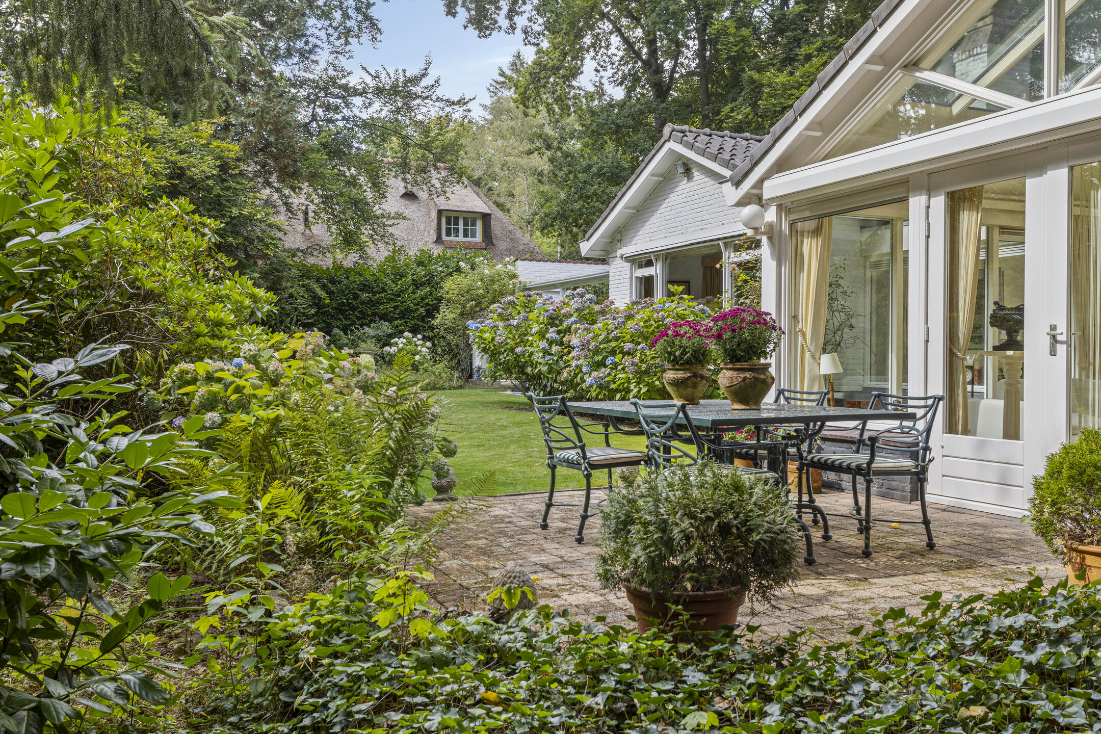 Het huis ligt iets verhoogd ten opzichte van haar omgeving en wordt omgeven door een diepe, landschappelijk aangelegde parktuin, met rododendrons en oude beuken, eiken en Douglas-sparren, die als wachters rondom staan. Op de veranda groeit een grote blauwe druif die zich met haar bladerdak en dikke druiventrossen als een natuurlijke parasol uitstrekt boven het terras. Deze perfect onderhouden tuin, gaat moeiteloos op in de bosrand, die de percelen als een groene ketting met elkaar verbindt.