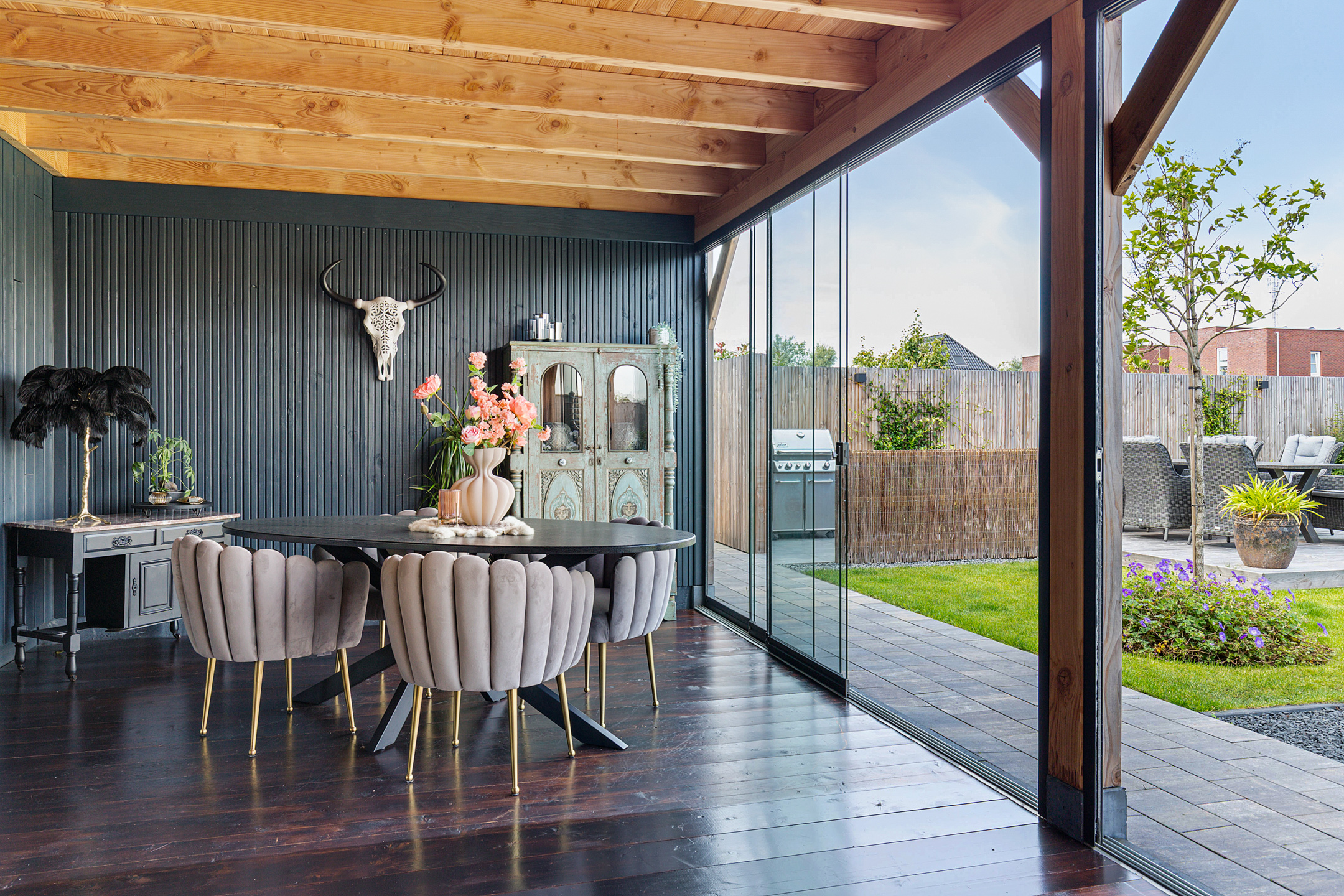 Via de ruime entree bereikt u de hal met stijlvol extra royaal gastentoilet, trapopgang met vide en toegang tot zowel de bijkeuken als de living. De woonkamer is sfeervol gepositioneerd aan de beschutte tuinzijde en vormt samen met de lichte woonkeuken een speelse, open leefruimte. De keuken aan de voorzijde is maatwerk en voorzien van hoogwaardige afwerking en inbouwapparatuur zoals robuuste decton bladen, koffiehoek, vaatwasser, combi heteluchtoven, grote Bora inductie kookplaat met geïntegreerde afzuiging, Quooker, inbouw koel- vriescombinatie, terwijl de woonkamer uitnodigt tot ontspannen in een knusse zithoek. De tuinkamer is een volwaardige uitbreiding van de leefruimte. Dankzij de glazen pui die volledig geopend kan worden, vloeien binnen en buiten naadloos in elkaar over. In de warmere maanden ervaart u een maximale tuinbeleving, terwijl in de koelere seizoenen een behaaglijke loungeplek behouden blijft. De bijkeuken herbergt de warmtepompinstallatie met 190 liter boiler, aansluitingen voor wasapparatuur en een waterontharder. De fluisterstille luchtwarmtepomp is zorgvuldig buiten de woning geplaatst. De gehele begane grond is voorzien van een stijlvolle laminaat-vloer en wordt verwarmd en gekoeld middels vloerverwarming.