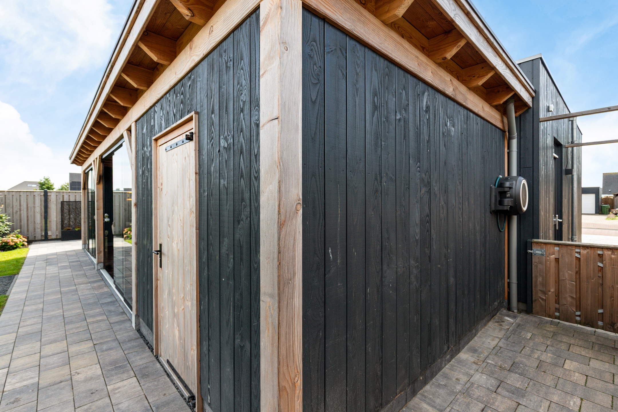 Aan de achterzijde is de woning geschakeld aan een ruime, deels geïsoleerde houten berging. Ideaal voor fietsen, tuinspullen en watersportmaterialen.