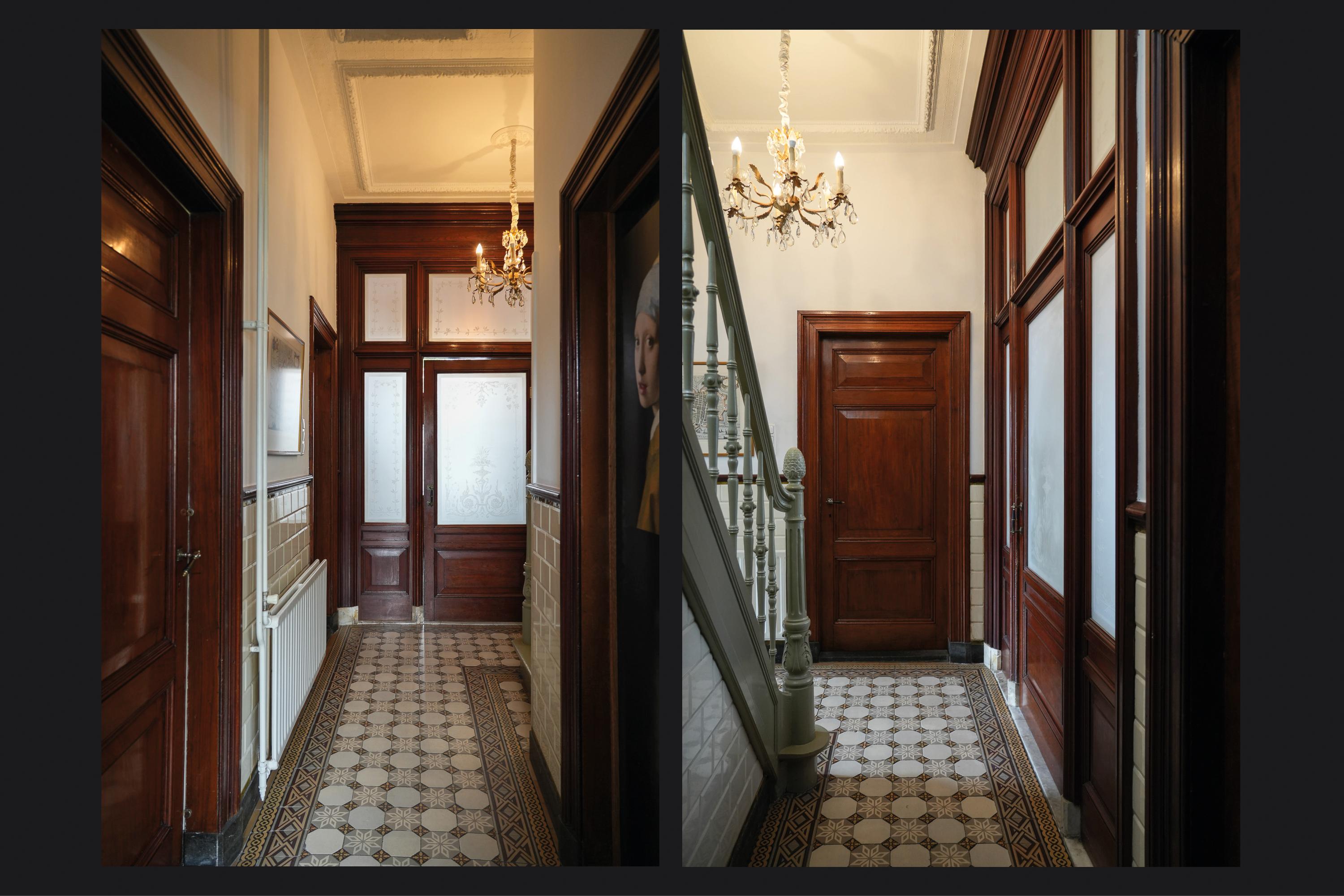 In de fraaie lijstgevel leidt de originele paneelvoordeur naar de vestibule. Deze ruimte heeft een ongekende grandeur, enerzijds door het hoge geornamenteerde stucplafond en anderzijds door het fraaie houtwerk met gaaf bewaard gebleven geëtst glas. De vloer is belegd met marmer en de facettegels op de wanden zijn intact gebleven. In de achtergelegen hal leidt een 19e-eeuwse trappartij naar de verdieping. Vanuit de hal geven prachtige paneeldeuren toegang tot de woonkamer, werkkamer, woonkeuken, kelderkast en het toilet. De vloer is hier belegd met authentieke patroontegels. De woonkeuken is een heerlijk lichte ruimte, ingericht met een Siematic keukenmeubel voorzien van diverse apparatuur en een diep natuurstenen werkblad uit één stuk.