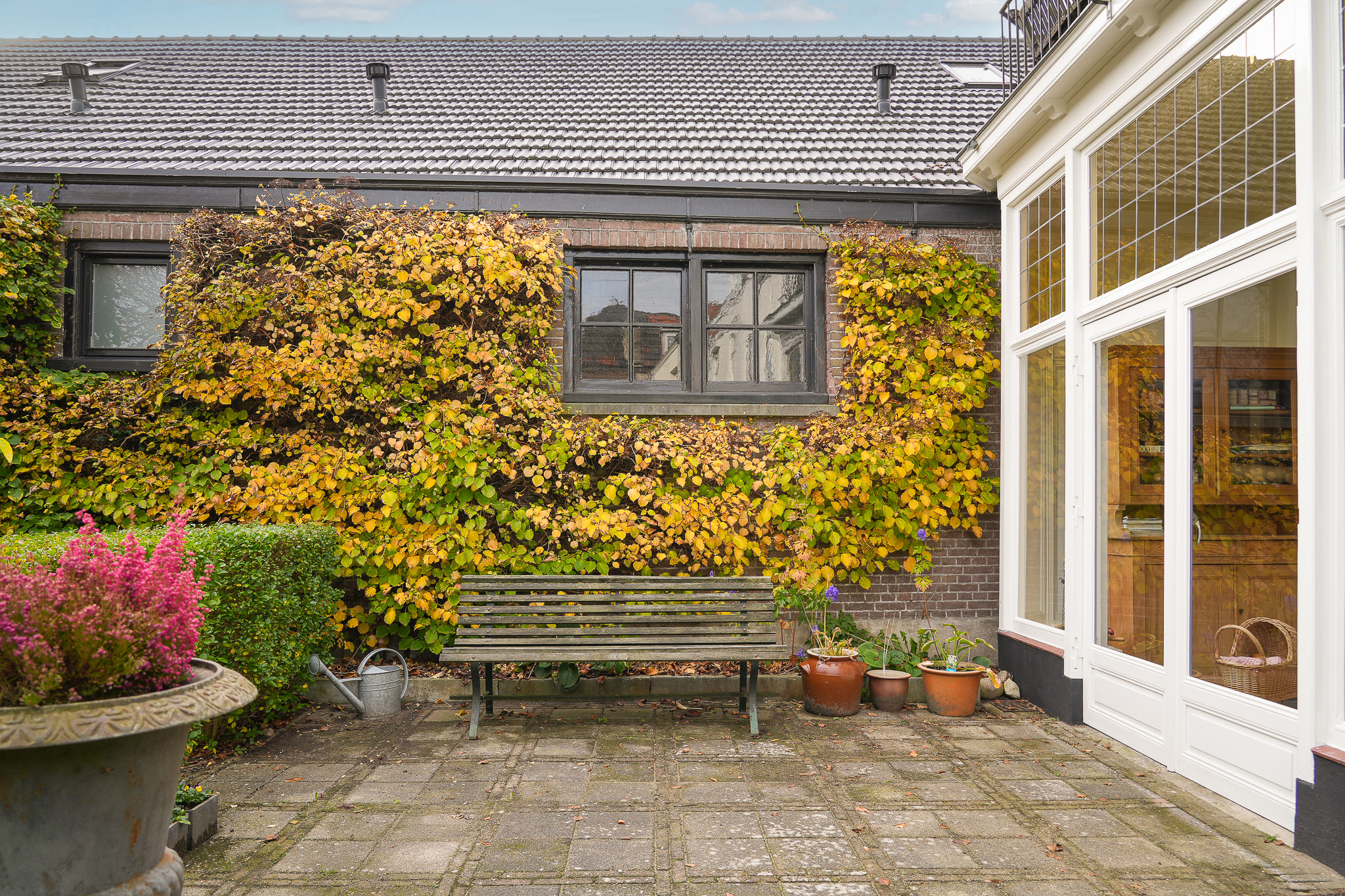 Achter de woning ligt een unieke, 9,5 meter brede en 15 meter diepe tuin op het oosten en zuiden. Er is altijd wel ergens een plekje in de zon of schaduw te vinden. In 2021 hebben de eigenaren het perceel kunnen uitbreiden, waardoor er ruimte ontstond om een groot pannengedekt bijgebouw te bouwen. Deze ruimte van 59 m² leent zich bij uitstek als stallingsruimte voor een oldtimer of boot, dan wel als atelier. De dubbele garagedeuren komen uit op de parkeerplaats direct achter de woning.