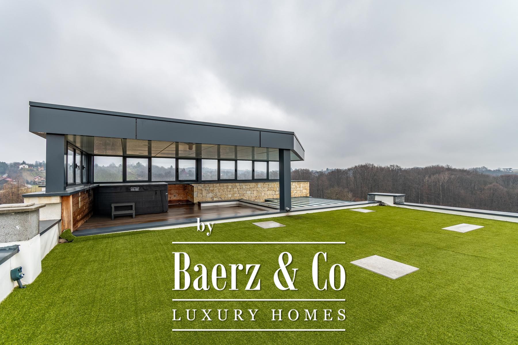 Het dakterras is ontworpen met zowel overdekte als open zones met kunstgras, een jacuzzi en vormt een natuurlijke verbinding met het buitenleven. De fraai aangelegde tuin biedt een verwarmd zoutwaterzwembad van 10 x 4 x 1,65 meter en een speciale barbecueplaats met extra vertrekken voor gasten of personeel, compleet met keuken en badkamer.