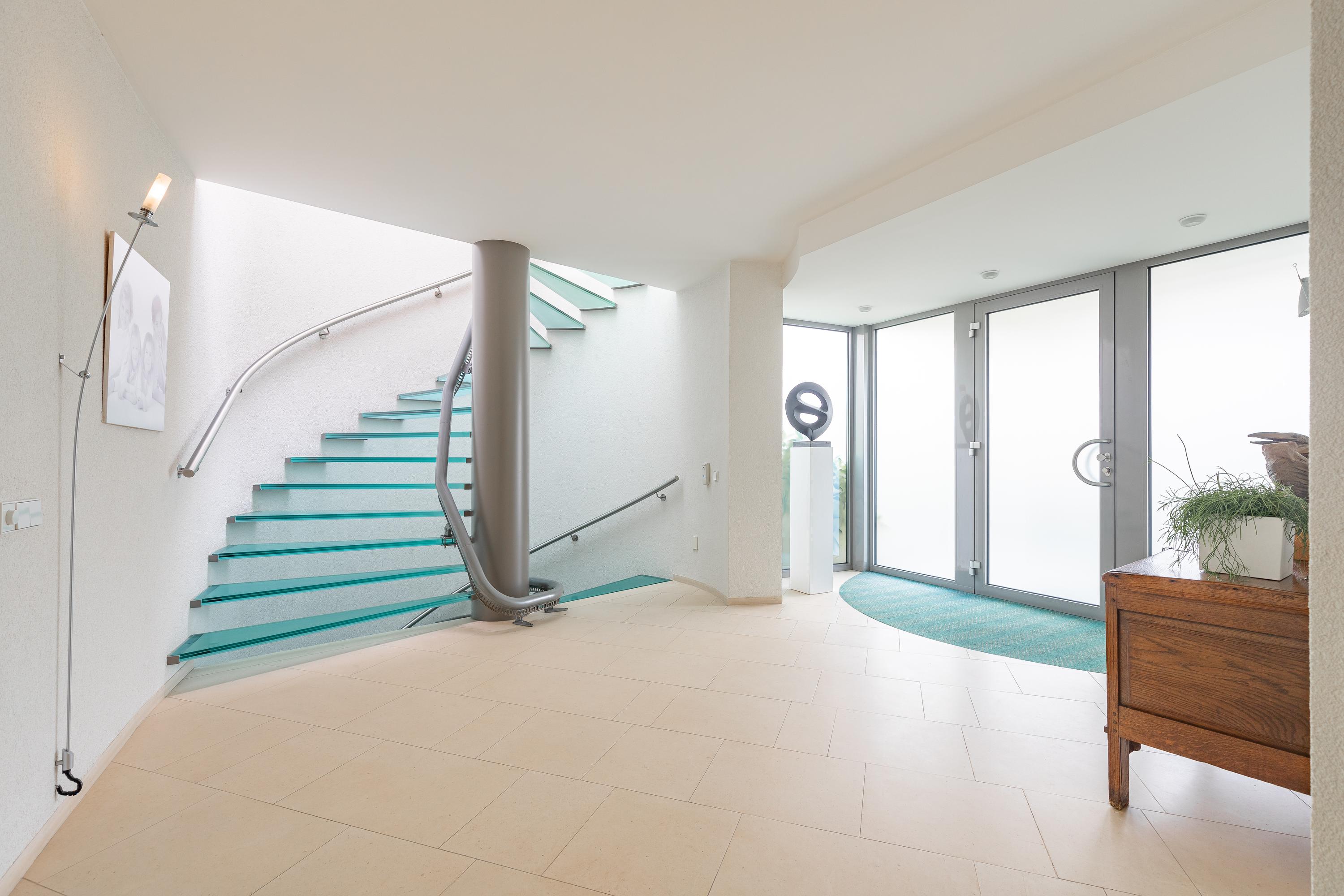 Het imposante trappenhuis is in een ronde vorm gebouwd en loopt vanuit het souterrain tot de overloop op de eerste verdieping. De stalen koker centraal dient als waskoker en voor de bevestiging van de hardglazen traptreden.