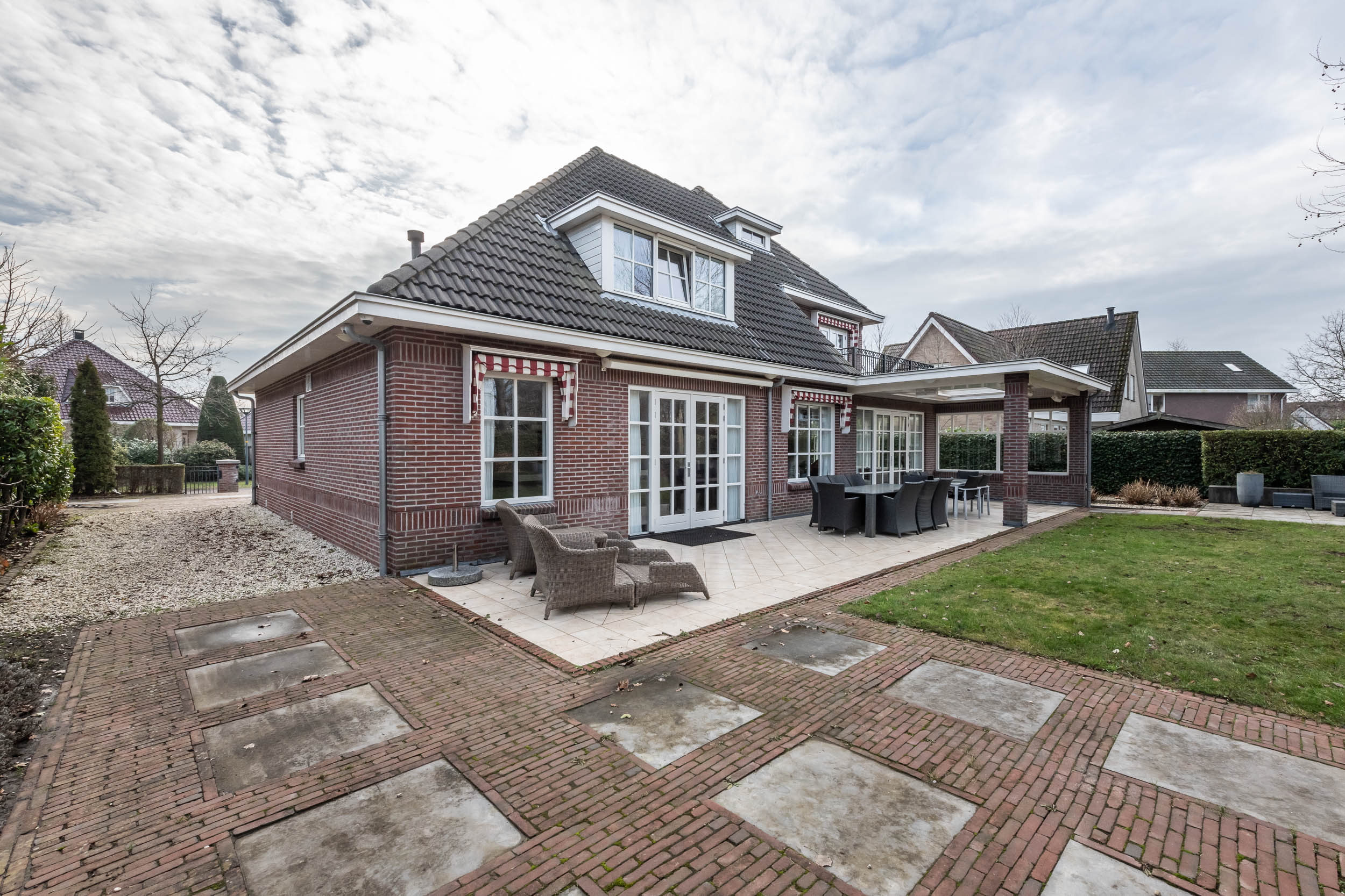 In 2003 is deze bijzondere villa op (traditionele wijze) gebouwd met hoogwaardige materialen. De villa heeft een voortuin met eigen oprit die toegang biedt tot de royale en inpandige garage en aan de achterzijde is een fraai aangelegde achtertuin met diverse terrassen en een deels overdekte veranda met terrasverwarming.