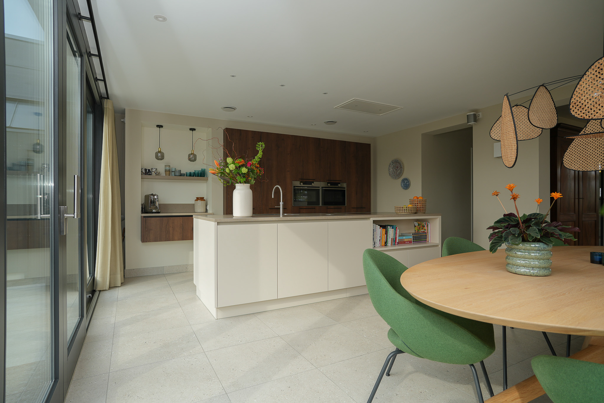 Aan de achterzijde is over de volle breedte een moderne aanbouw gerealiseerd, waardoor een royale woonkeuken is ontstaan waarin de binnen-buitenbeleving centraal staat. De grote schuifpui zorgt voor een directe verbinding met de onder architectuur aangelegde tuin.