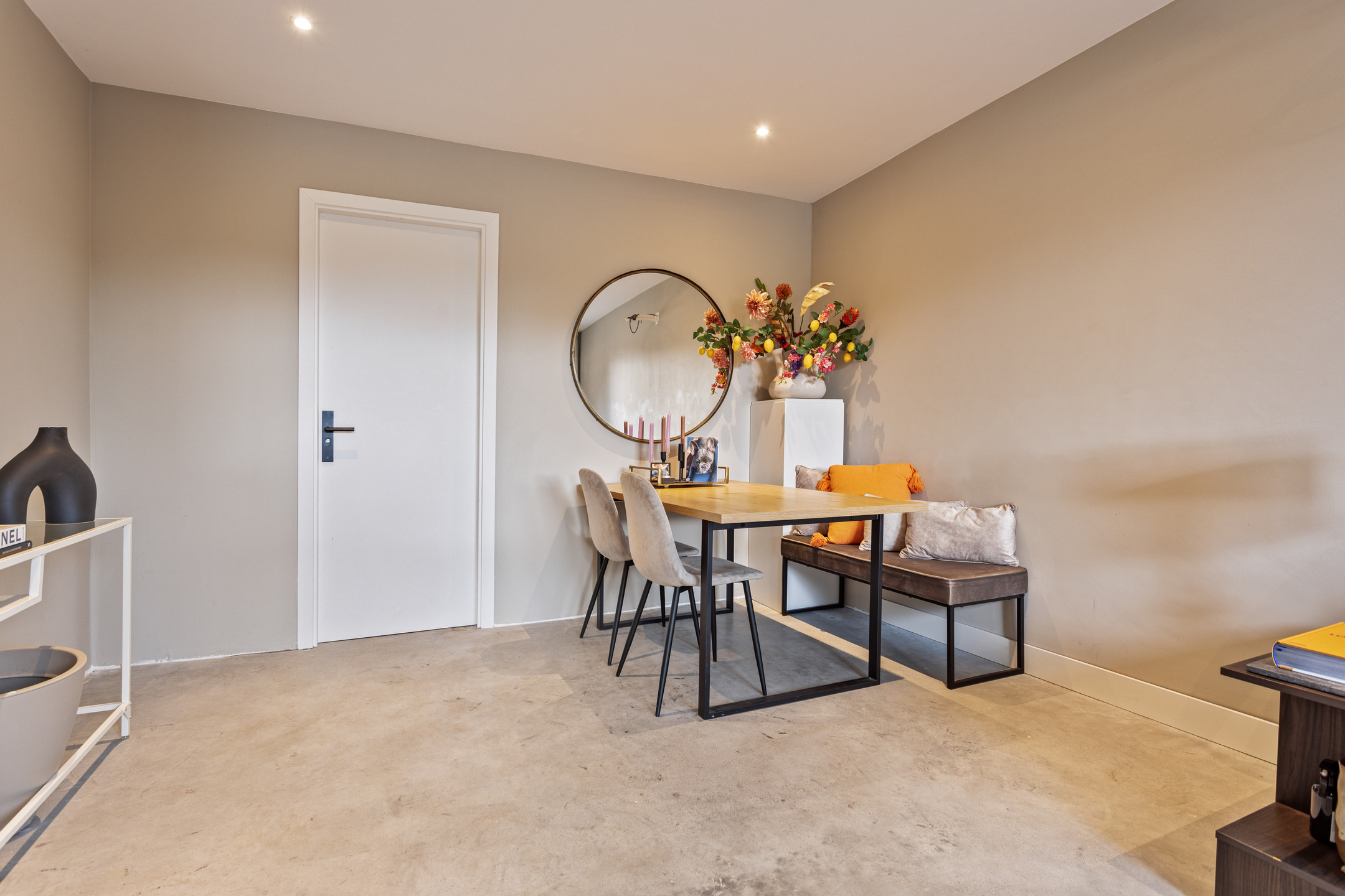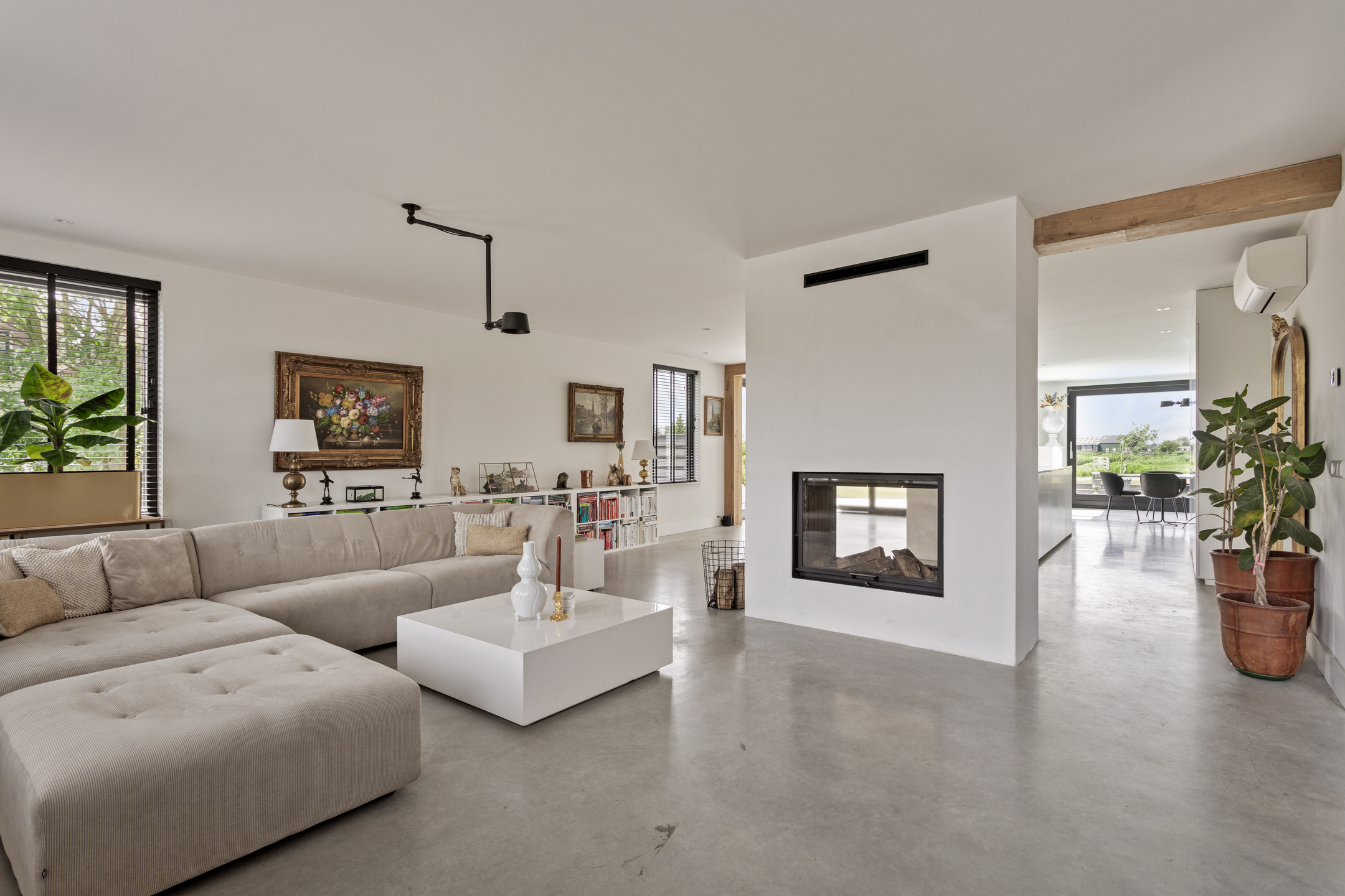 De gehele begane grond verdieping is voorzien van een gevlinderde gietbeton vloer met vloerverwarming.