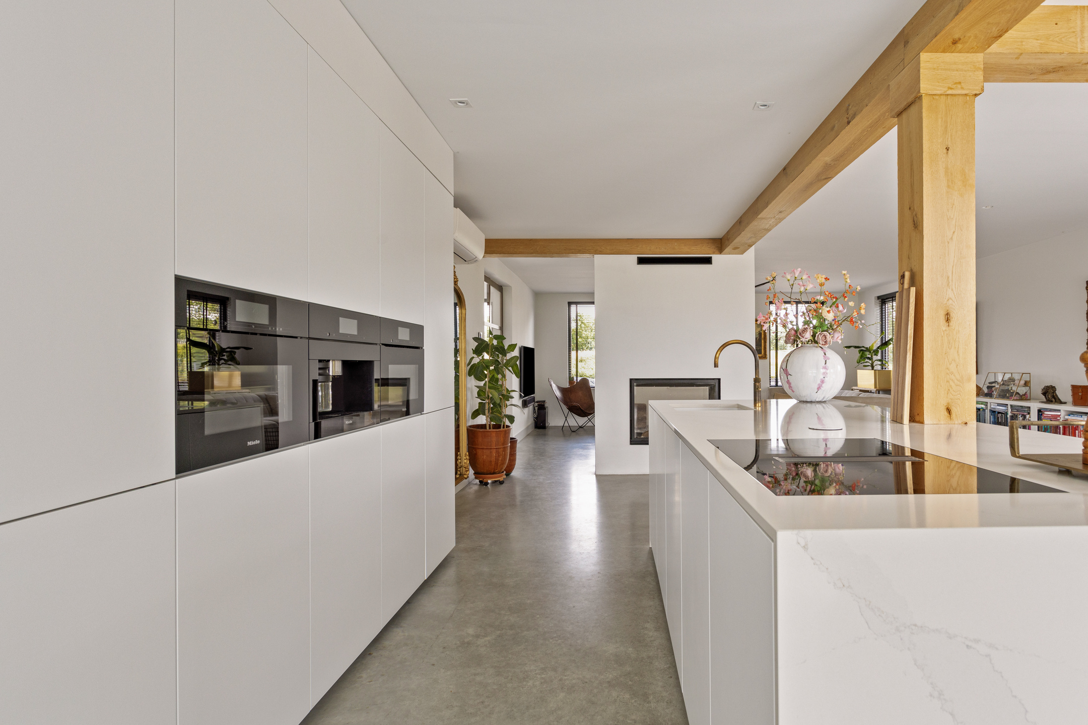 A spacious entrance with a mezzanine (creating a high ceiling) and custom-made steel pivot doors in bronze metal that lead to the living room. The living room, featuring beautiful French oak beams, is bright and airy thanks to the large windows and sliding glass doors. At its heart is an open fireplace with double-sided glass, creating a cozy atmosphere in both the living room and the kitchen.