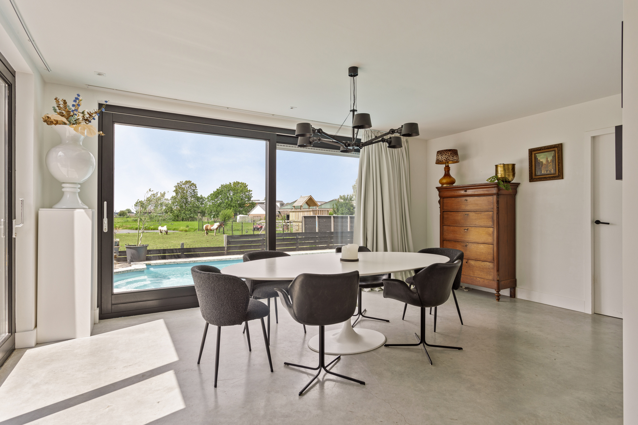 The open-plan kitchen is sleek and modern, equipped with a cooking island and built-in appliances. With ample storage and high-quality appliances, including Miele built-ins, a Quooker tap, and Hotbath Cobber faucets, it’s designed for culinary enthusiasts. The dining area at the rear of the house is ideal for a large family table, offering stunning views of the pool and surrounding meadows.