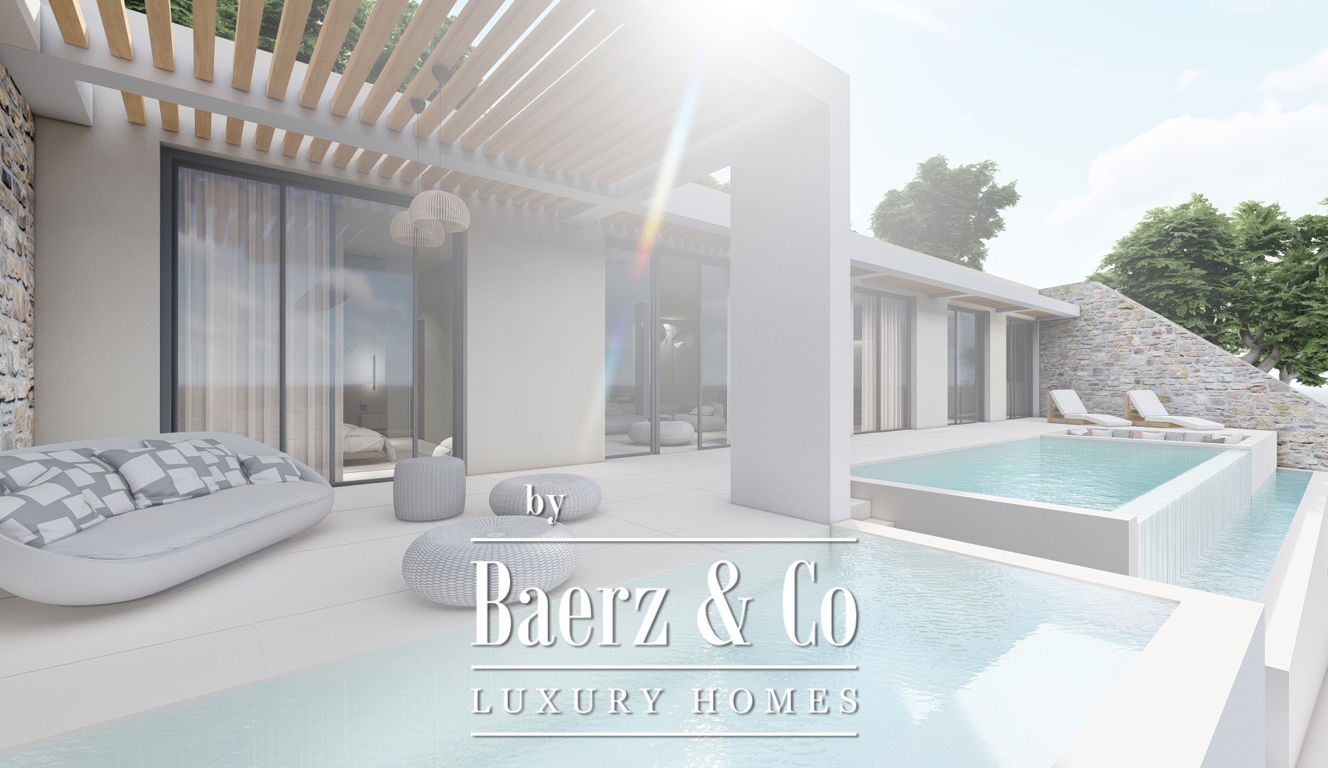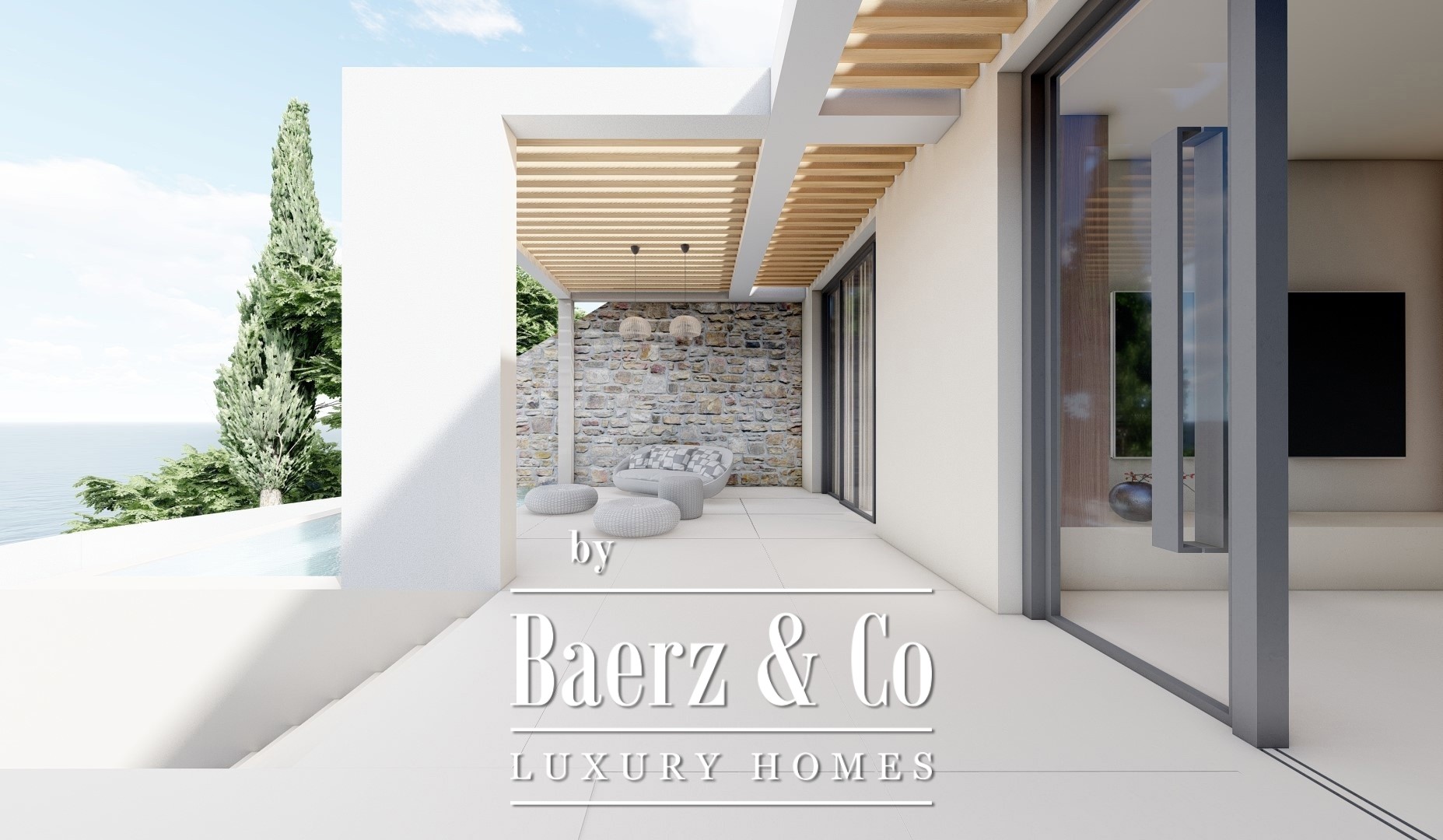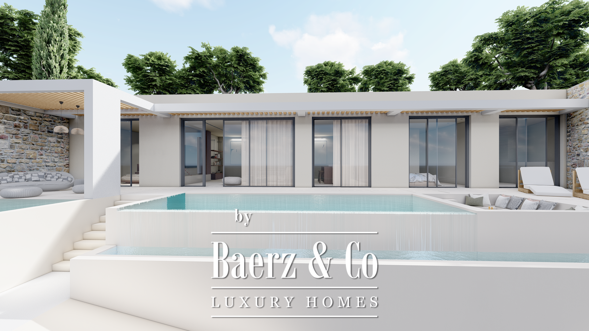 Gelegen op een perceel van 1.000 m², biedt de villa een totale woonoppervlakte van 180 m². Elke van de drie slaapkamers beschikt over een eigen badkamer en een inloopkast, wat privacy en comfort in balans brengt. Riante glaspartijen halen het zeezicht naar binnen in de open leefruimte, aangevuld met een slimme, volledig uitgeruste keuken en een aparte wijnkelder. Buiten wonen krijgt vorm naast een infinity zoutwaterzwembad, jacuzzi en een stenen terras met buitenhaard, allemaal op het Ionische uitzicht georiënteerd. Mediterrane beplanting en sfeervolle verlichting creëren rustige avonden, terwijl een buitendouche het zomerse gemak versterkt.