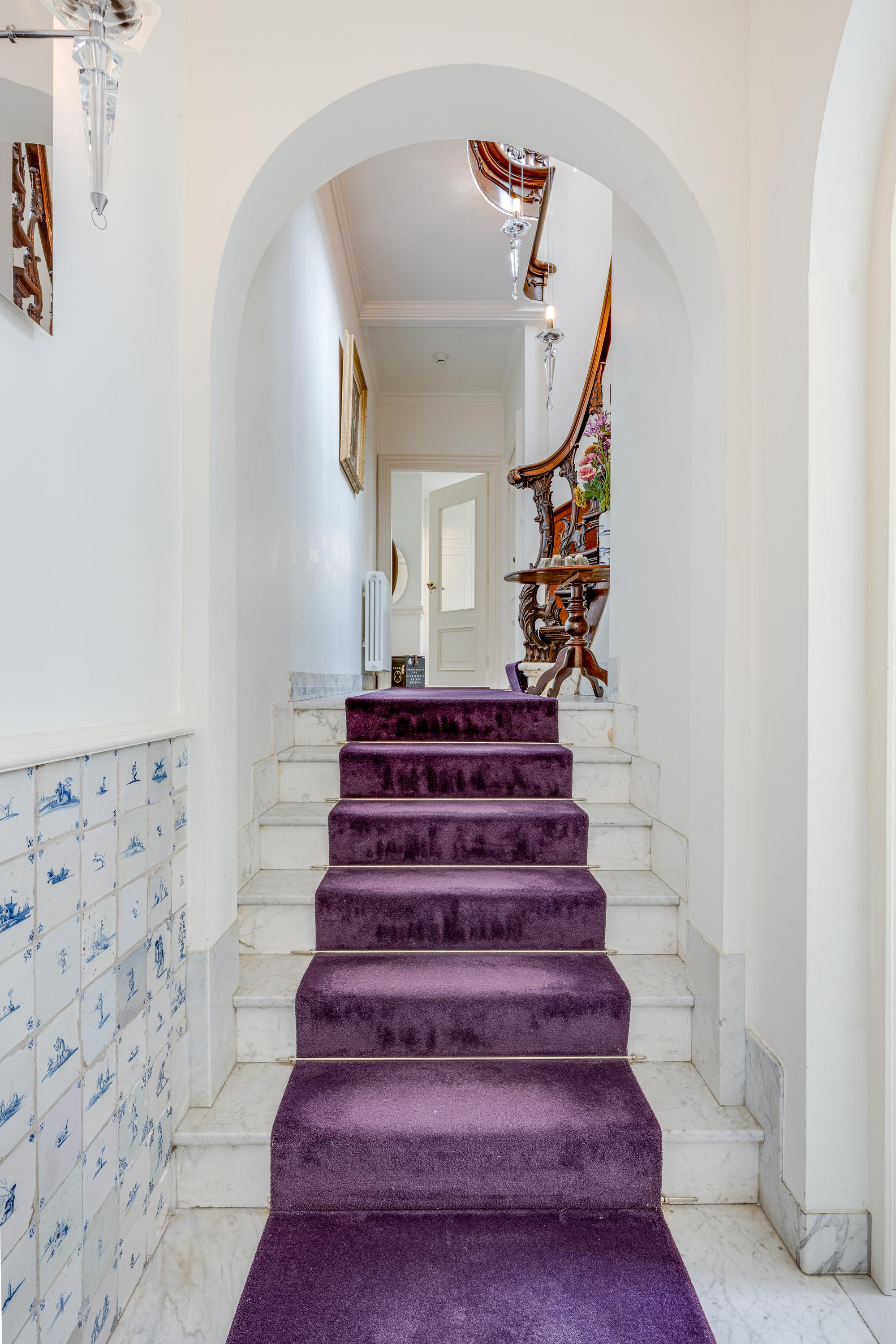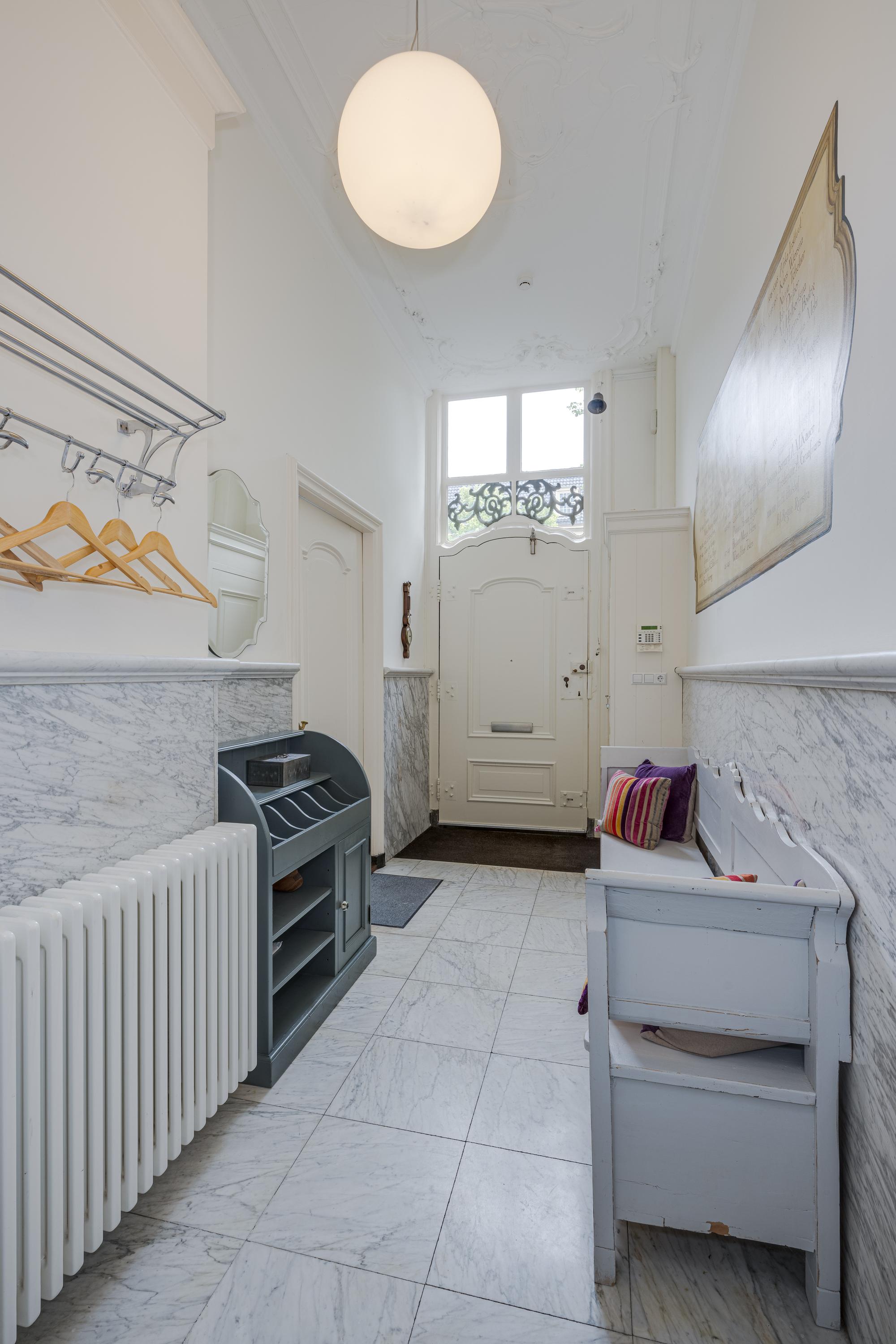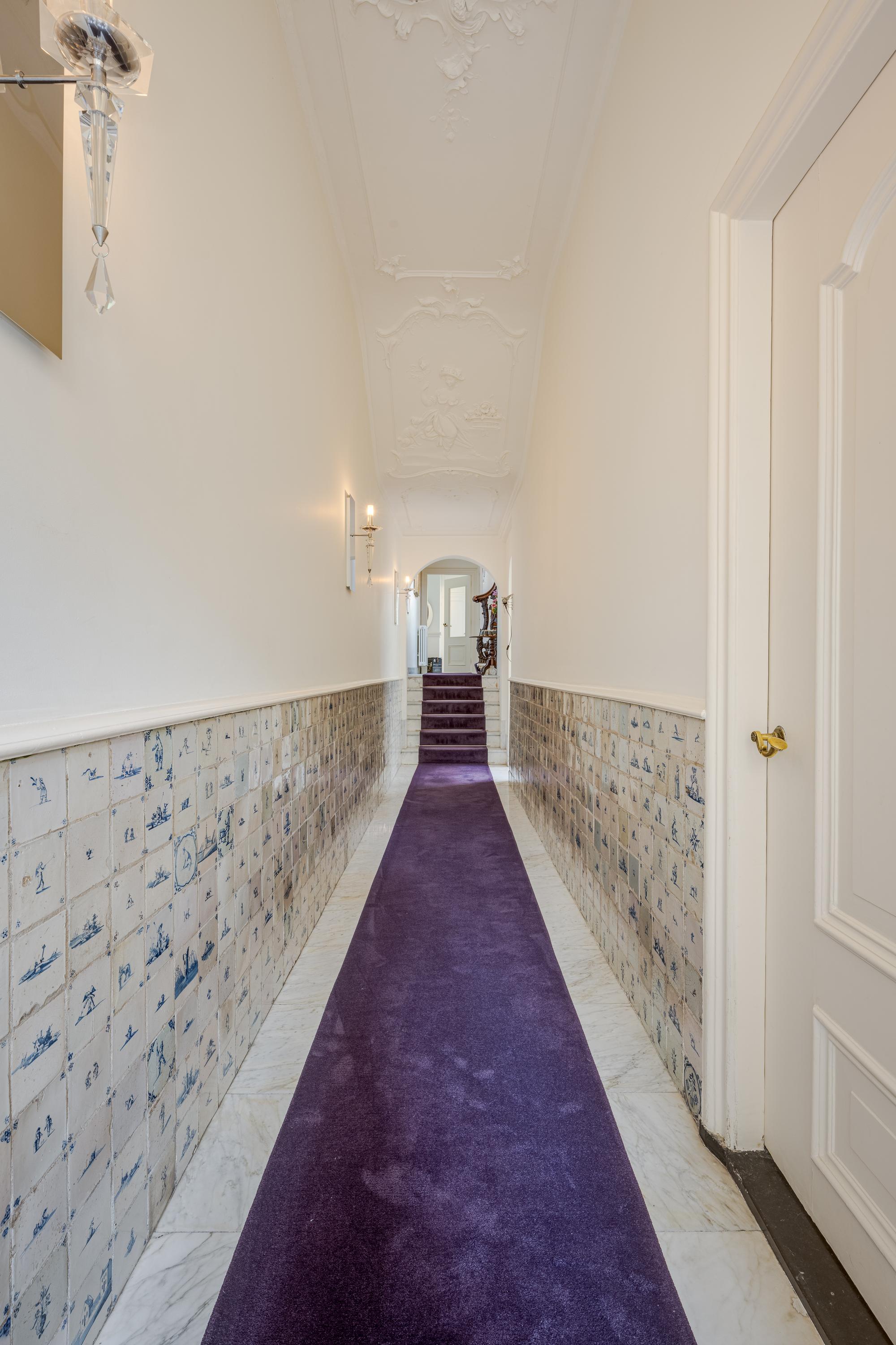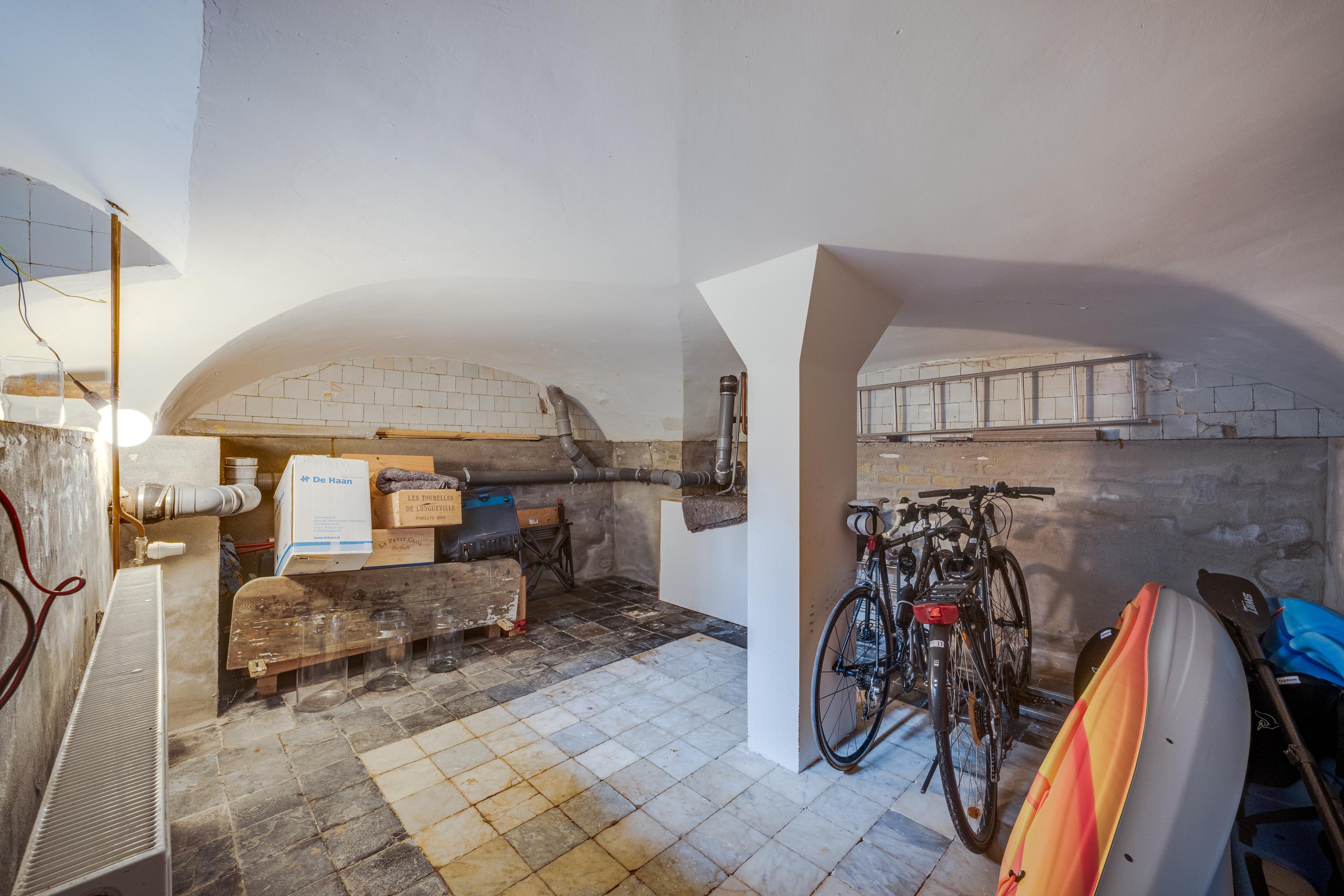 Ruime en lichte entree. Deur naar de woonkeuken. Dit is een prachtige en zeer sfeervolle ruimte met 2 hoge ramen aan de grachtzijde en openslaande deuren naar de achtertuin. De luxe Bulthaup keuken is uiteraard voorzien van alle gebruikelijke apparatuur. De brede gashaard aan de tuinzijde voegt extra sfeer toe aan het eet- en zitgedeelte van deze ruimte. De lange gang met Delfts Blauwe tegeltjes aan weerszijden leidt naar een kleine hal met toegang tot de tuin en een trap naar het souterrain. Deze is thans in gebruik als wasruimte. Aan de straatzijde bevindt zich op dit niveau een gewelfde kelder voor opslag. Terug naar de gang, Hier treft u nog een gastentoilet en aan het einde van de gang een multifunctionele kamer.
