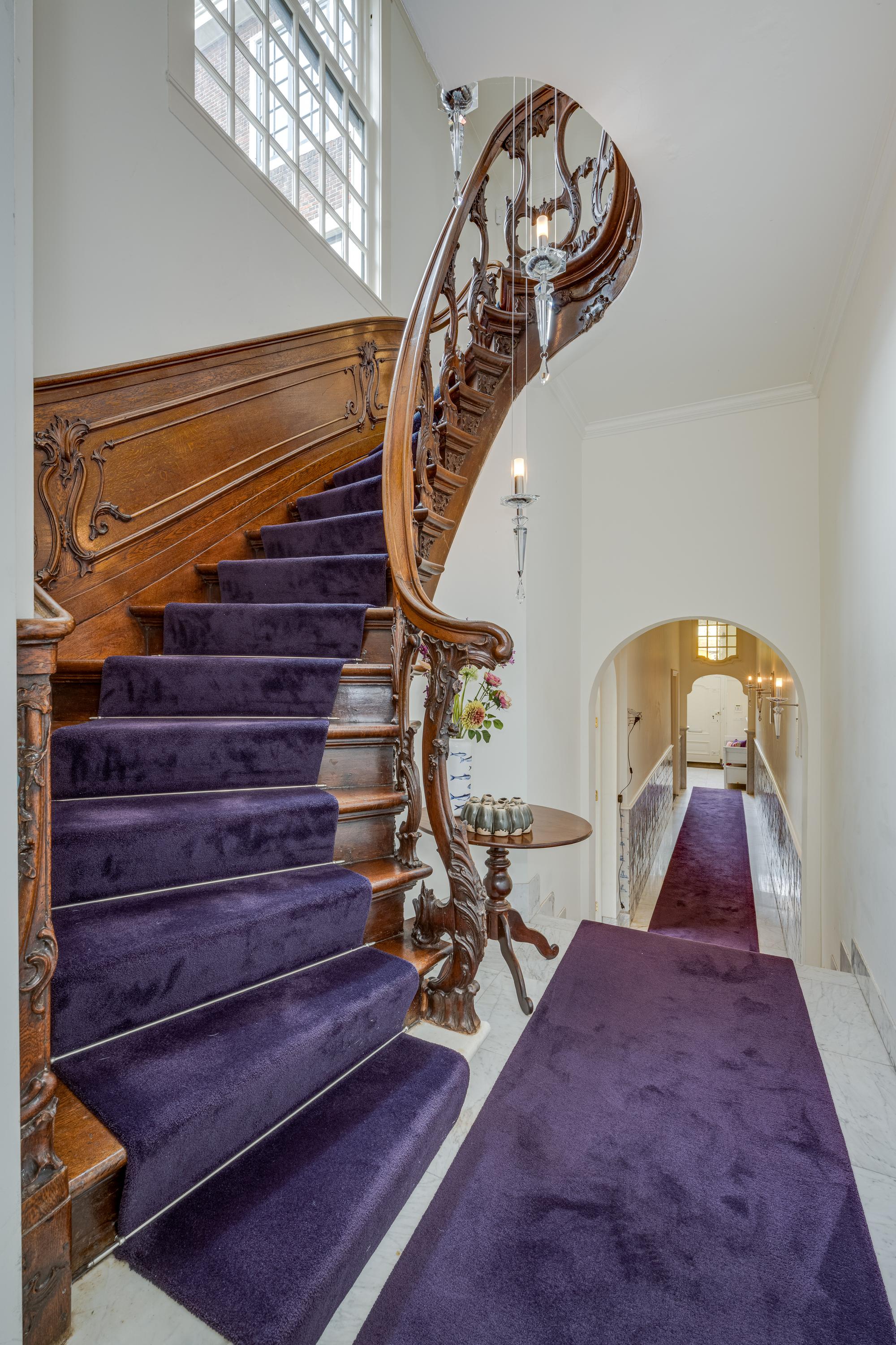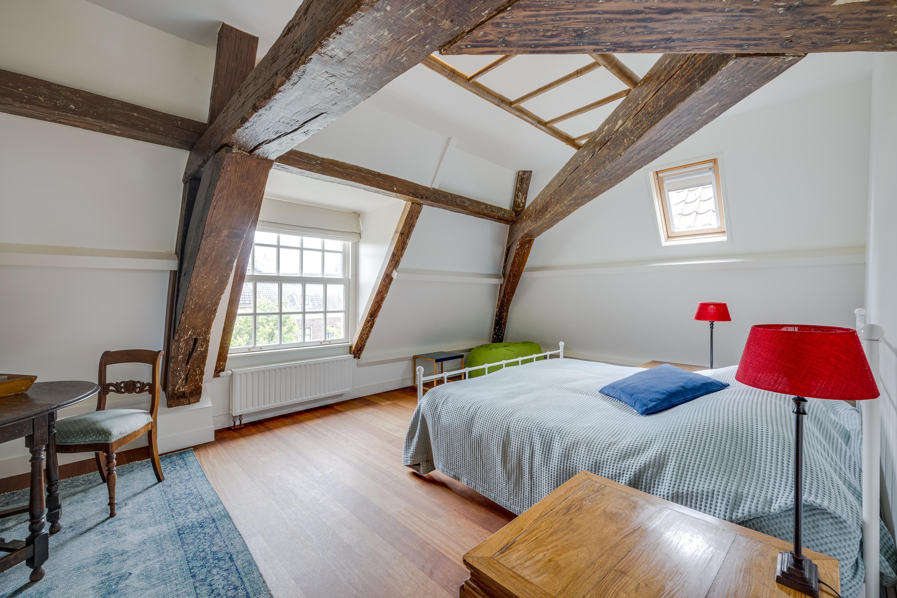 Een monumentale trap leidt naar de eerste verdieping. In het achterhuis bevindt zich een separaat toilet en een slaapkamer met moderne badkamer en suite. In het voorhuis treft u de zeer ruime en lichte woonkamer met aan de tuinzijde een zitkamer rondom de haardpartij en aan de voorzijde (3 ramen breed) een fijne lichte woonkamer met prachtig uitzicht op de gracht en de stad.