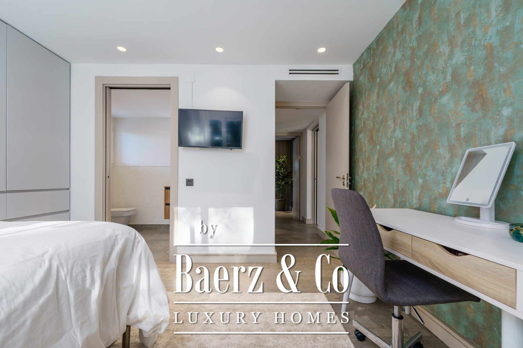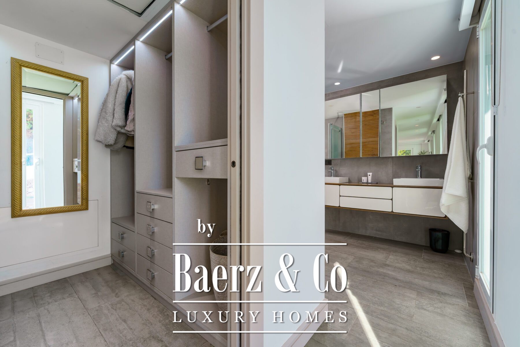 Op de bovenverdieping beschikt de master suite over een royale inloopkast en een verfijnde en-suite badkamer. Een extra gastenkamer op dit niveau heeft eveneens een eigen inloopkast en badkamer, terwijl de woonkamer opent naar het solariumterras met deels uitzicht op zee en bergen. Het terras biedt volop gelegenheid tot ontspanning of ontvangst van gasten.