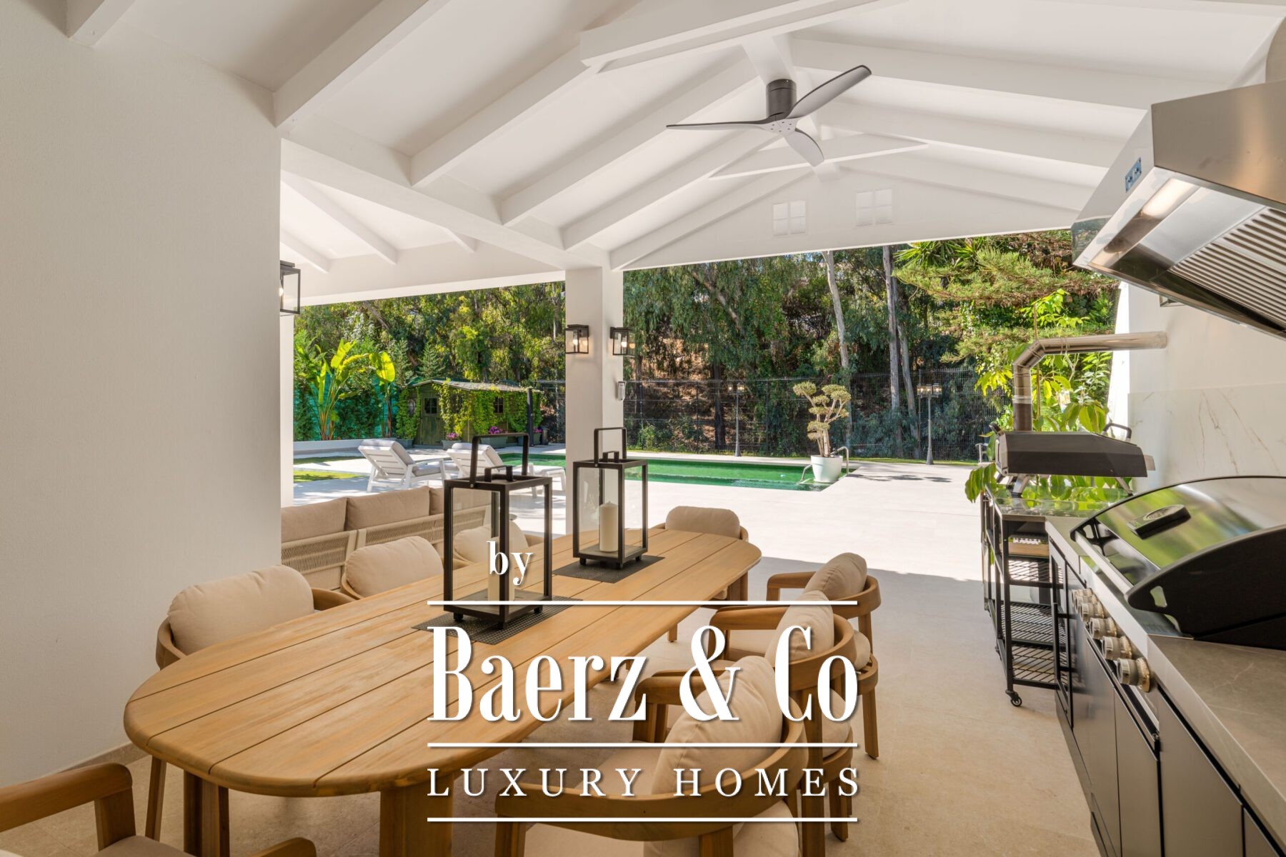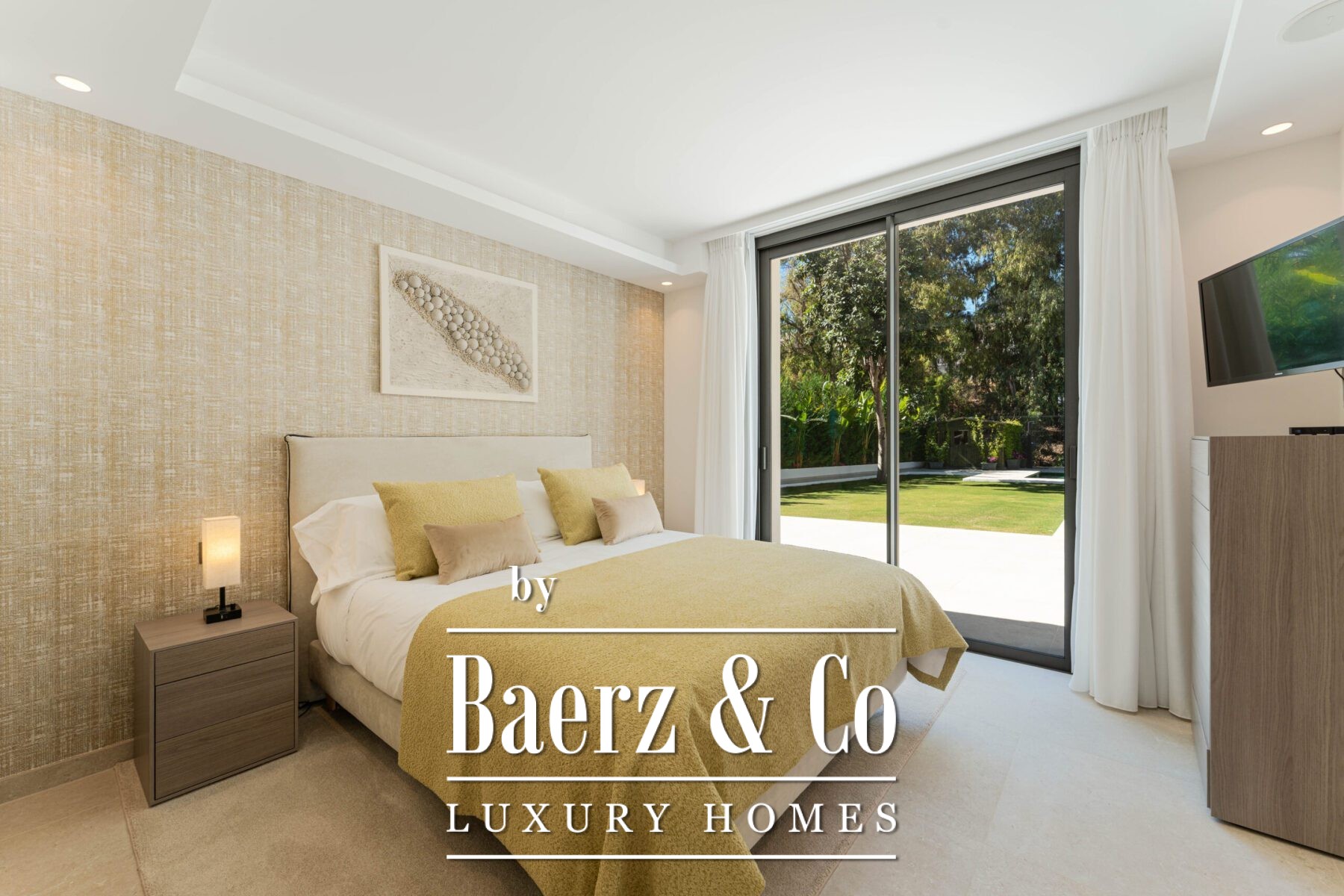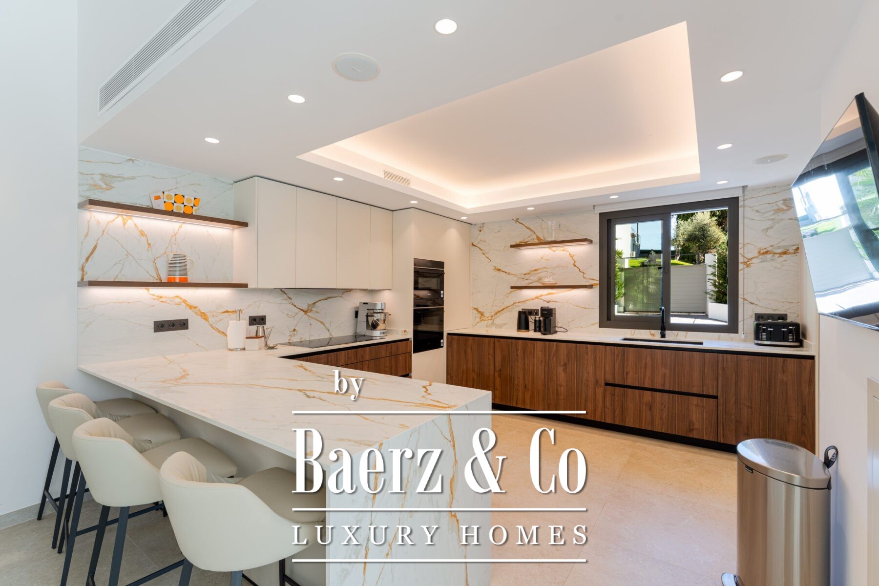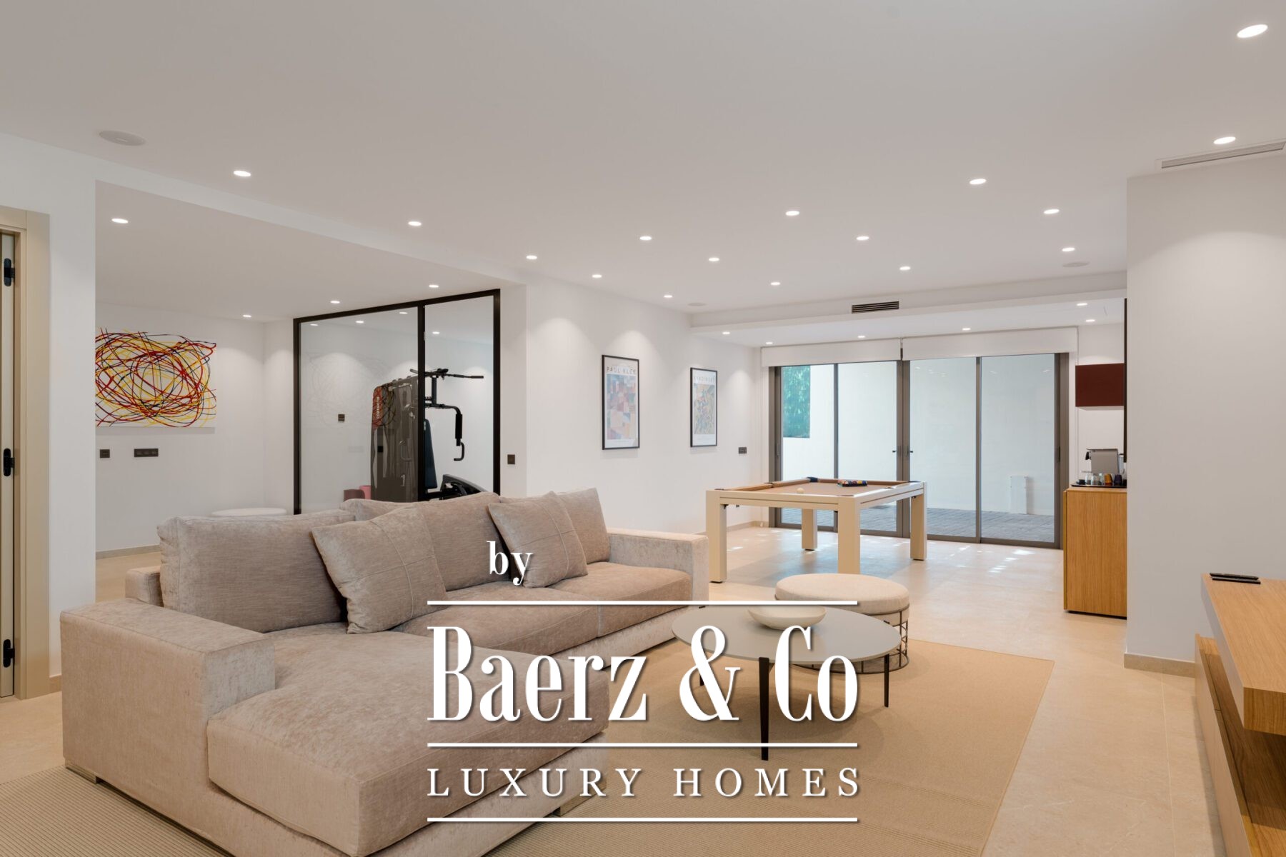 De doordacht aangelegde tuin omsluit een privé, verwarmd zwembad en royale terrassen die uitgerust zijn met een buitenkeuken, eetgedeelte en diverse zitplekken voor tijdloos buitenleven. Voorzieningen als vloerverwarming, zone airconditioning en geavanceerde beveiliging voldoen aan de wensen van internationale kopers. De villa waarborgt totale privacy en is toch dichtbij toonaangevende internationale scholen, Marbella Sports & Tennis Club en biedt directe aansluiting op de AP-7.