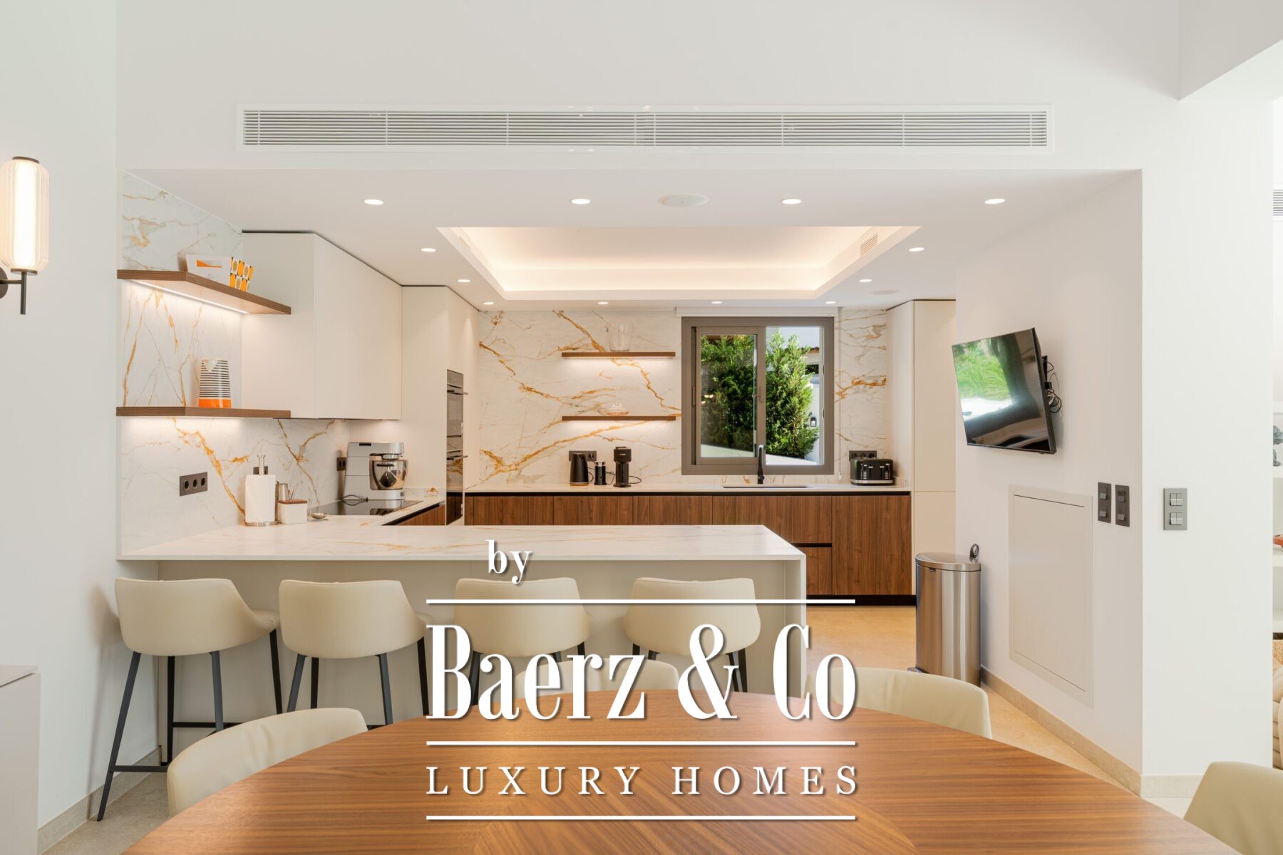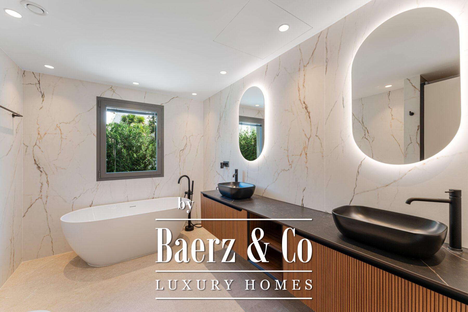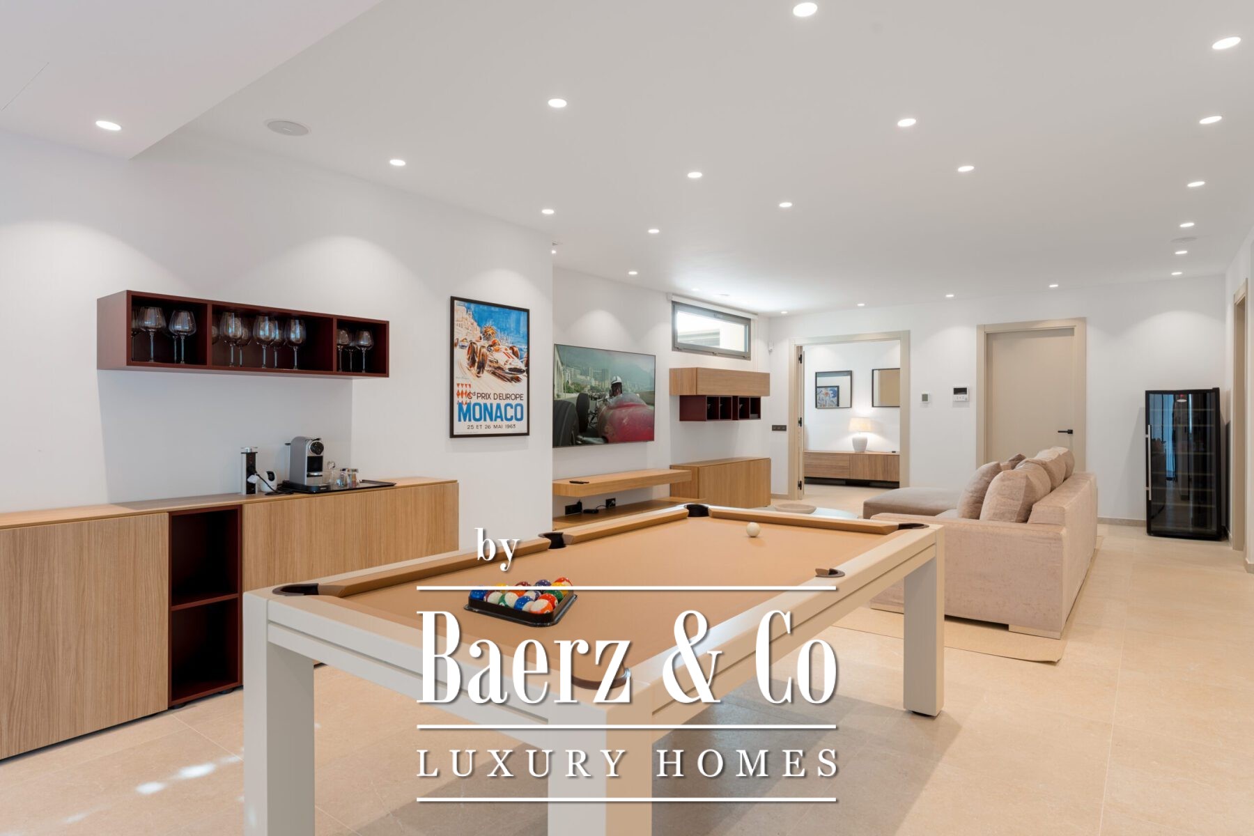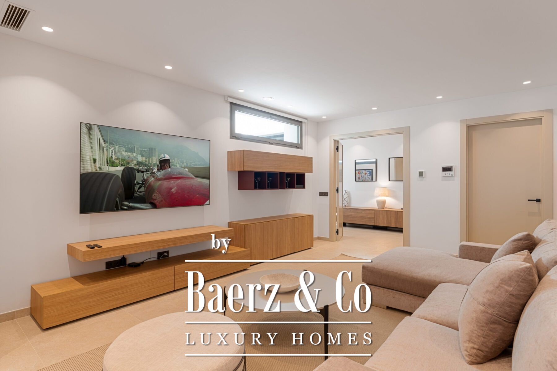 De doordacht aangelegde tuin omsluit een privé, verwarmd zwembad en royale terrassen die uitgerust zijn met een buitenkeuken, eetgedeelte en diverse zitplekken voor tijdloos buitenleven. Voorzieningen als vloerverwarming, zone airconditioning en geavanceerde beveiliging voldoen aan de wensen van internationale kopers. De villa waarborgt totale privacy en is toch dichtbij toonaangevende internationale scholen, Marbella Sports & Tennis Club en biedt directe aansluiting op de AP-7.