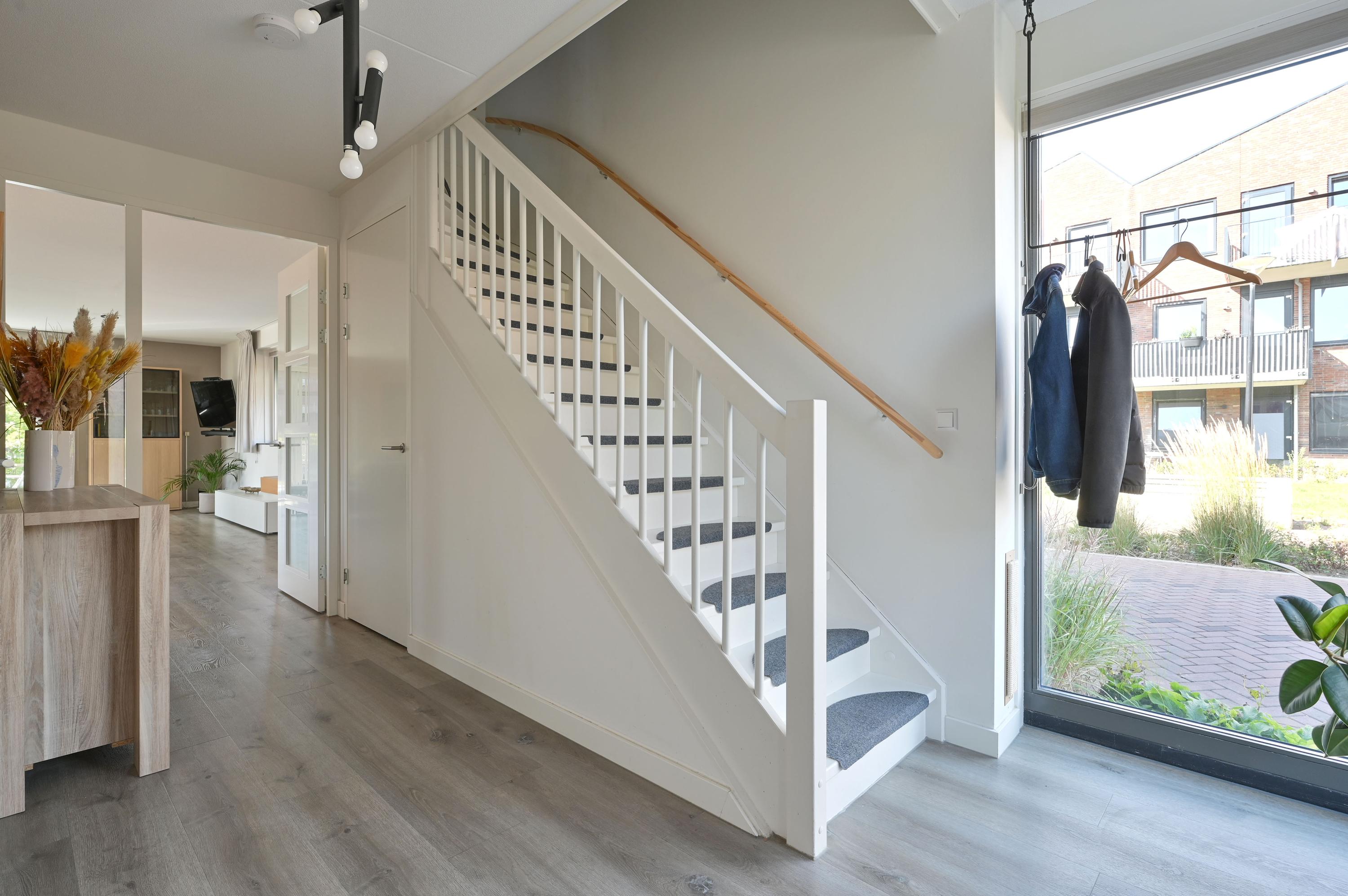 Via de royale oprit van antraciet grind, met plaats voor twee auto’s en een eigen laadpaal, bereikt u de stijlvolle entree van deze villa. Al bij binnenkomst in de ruime en representatieve hal valt het grote hoekraam naast de voordeur op waardoor het daglicht rijkelijk binnenstroomt. Vanuit de hal heeft u toegang tot diverse vertrekken én de vaste trapopgang naar de eerste verdieping. Links van de voordeur bevindt zich een veelzijdige ruimte die nu dienst doet als werkkamer, maar ook ideaal is als inpandige berging of hobbykamer. Deze ruimte heeft bovendien een eigen ingang vanaf de voorzijde. Naast gelegen vindt u de meterkast met glasvezelaansluiting, gevolgd door het modern afgewerkte toilet in grijs-wit tinten met fontein. Onder de trap is een praktische opbergkast en er is ruim plek voor een garderobe.