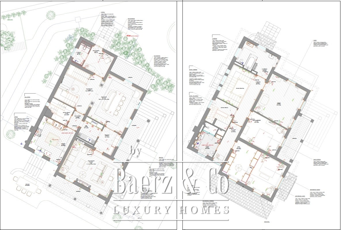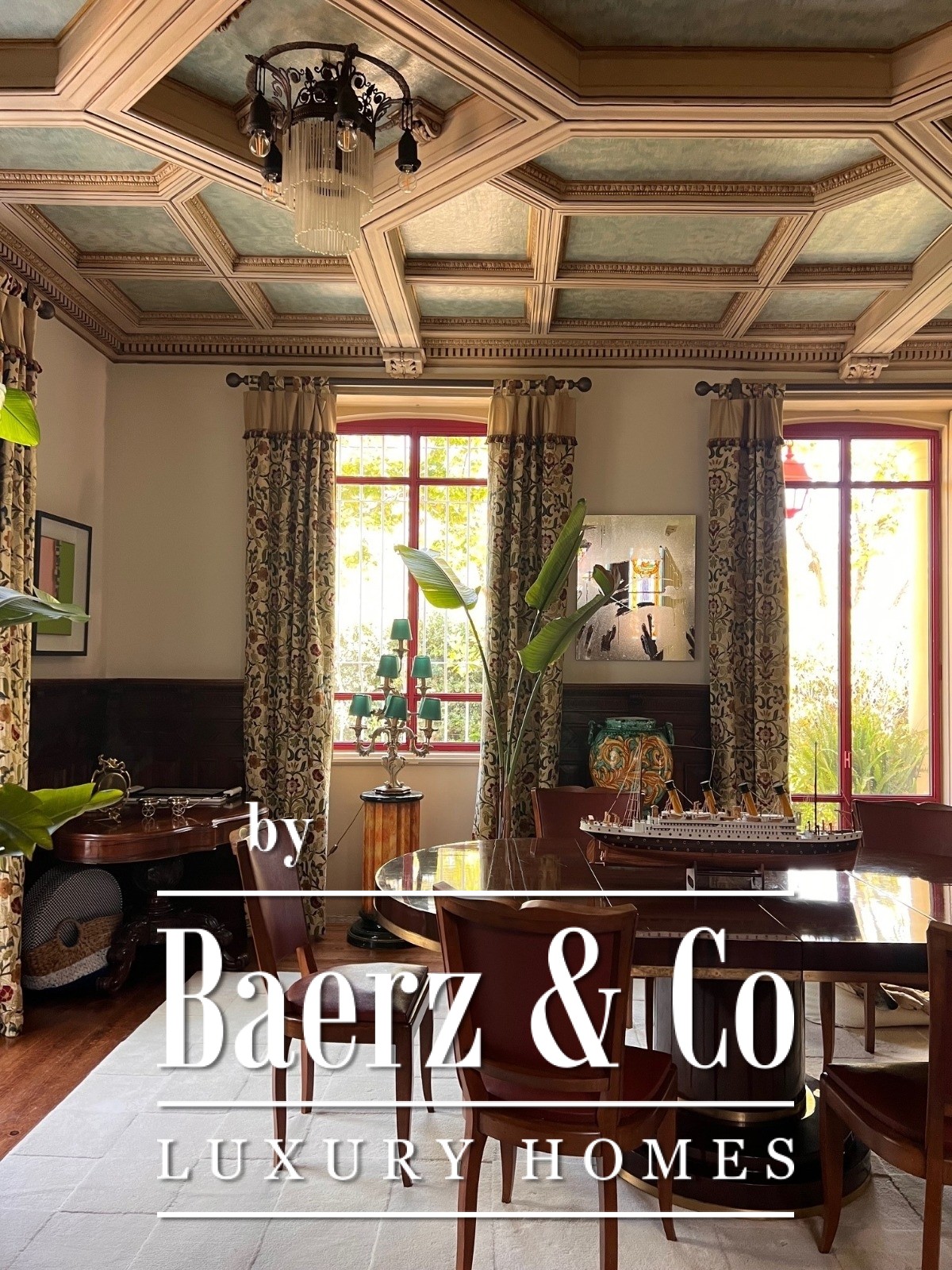 Binnen de 576 m² elegante leefruimte beschikt het hoofdhuis over vijf slaapkamers en vijf badkamers. Twee suites weerspiegelen eigentijdse luxe, terwijl het interieur tijdloze klasse uitstraalt met fraai sierplafond, een indrukwekkend trappenhuis met glas-in-lood en royale lichtval. Zithoek, eetgedeelte en de moderne keuken met kookeiland lopen harmonieus in elkaar over. Comfort wordt geboden door vloerverwarming, geselecteerde airconditioning en een sfeervolle open haard.