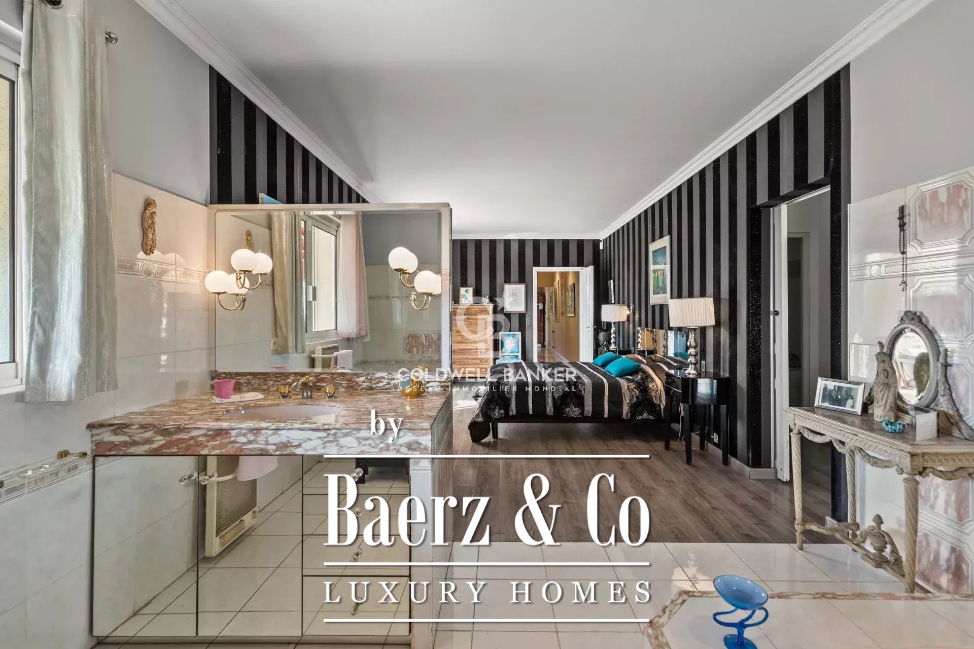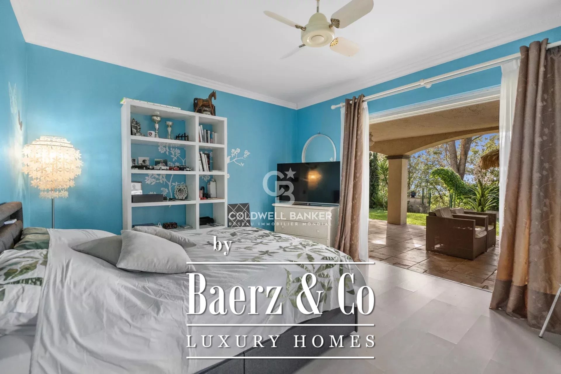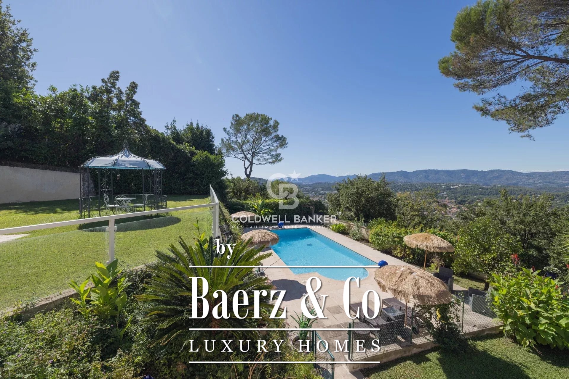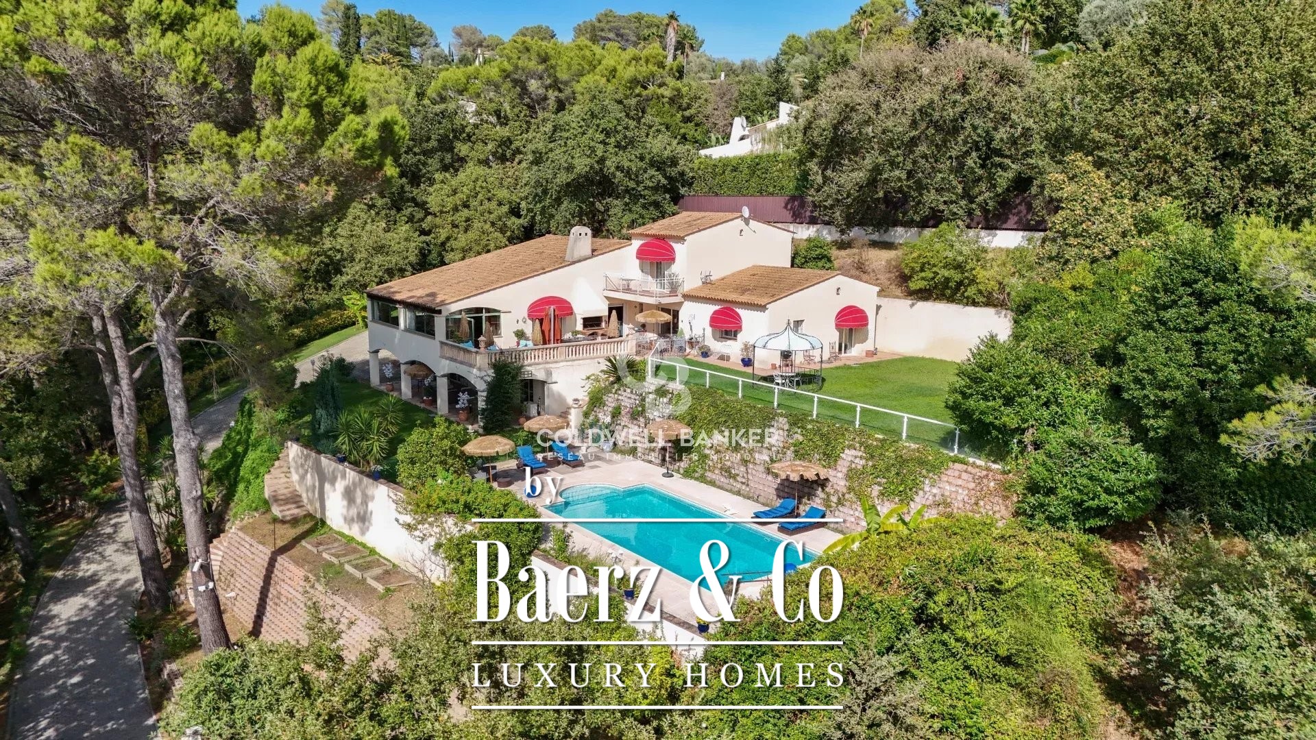 Brede terrassen vloeien over in de aangelegde tuin, die wordt geaccentueerd door een imposant zwembad. De villa van 370 m² is verder voorzien van airconditioning, een open haard, dubbele beglazing, een alarmsysteem en een elektrische poort voor optimale veiligheid, plus doordachte voorzieningen. Een carport voor vier auto’s en een afgesloten garage van 60 m², eenvoudig om te bouwen tot gasten- of beheerderswoning, zorgen voor extra autonomie. Deze luxe villa te koop in Mougins biedt een ingetogen toevluchtsoord met zeezicht en blijvende kwaliteit.