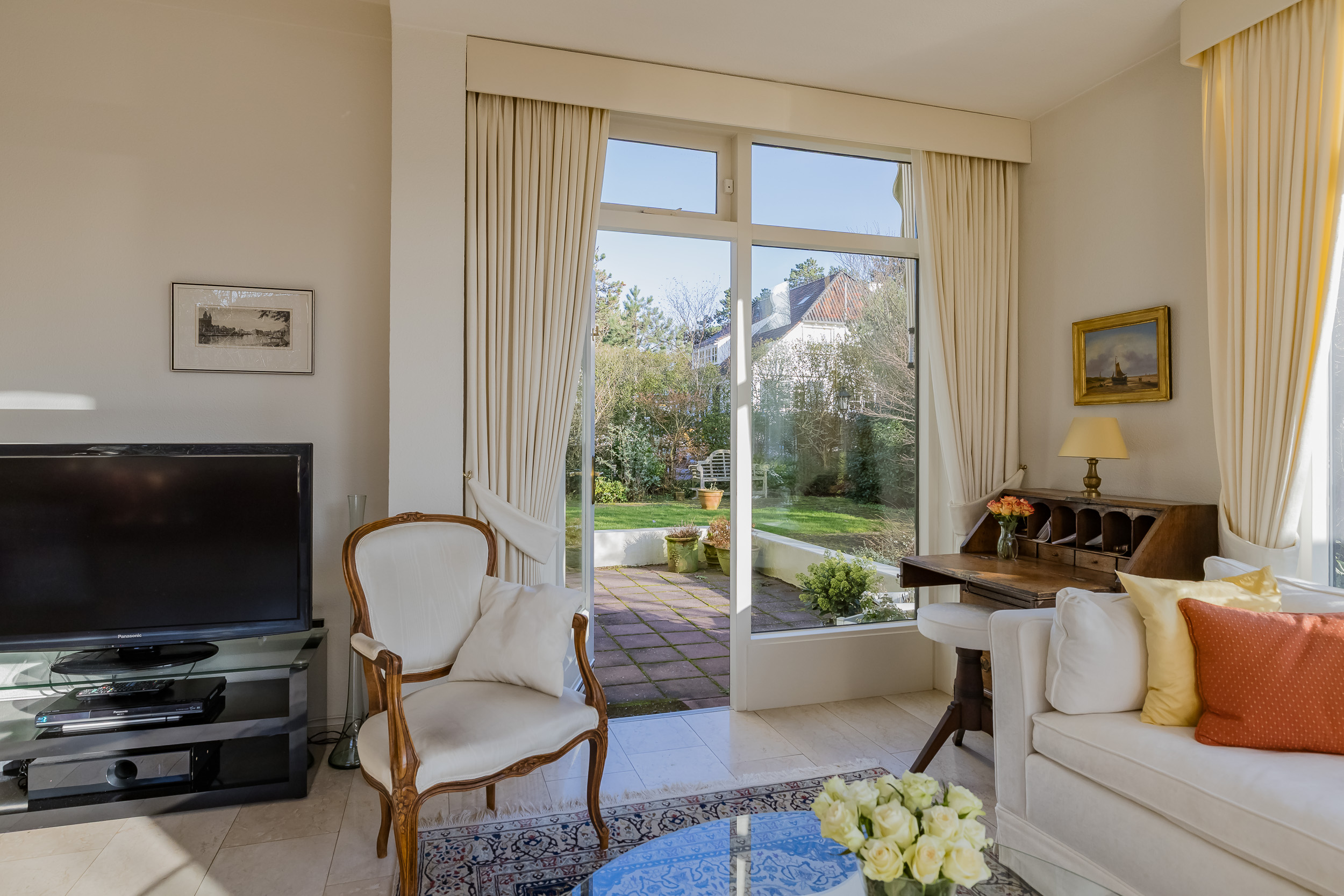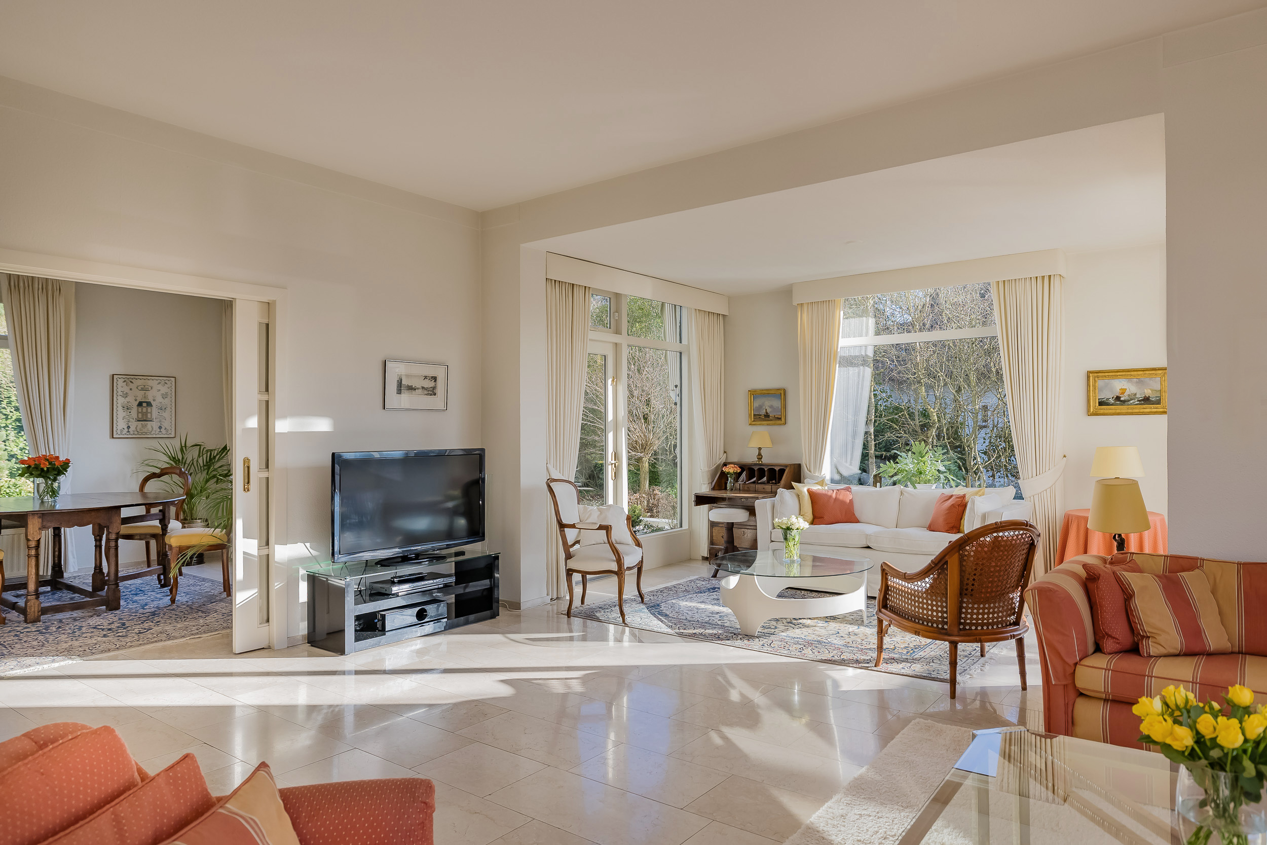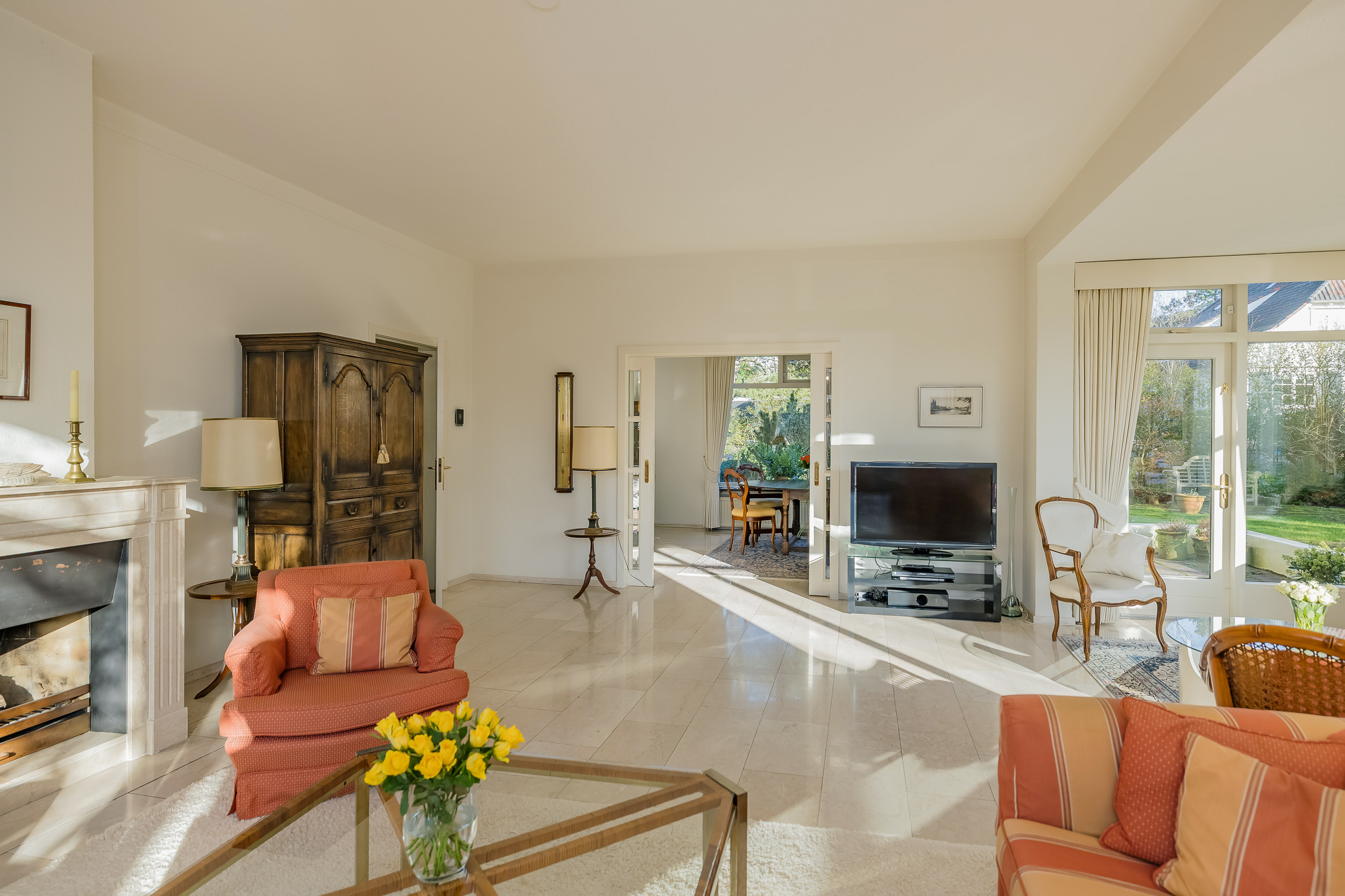 De royale woonkamer is een heerlijke leefruimte met een warme, uitnodigende sfeer. De open haard en de elegante marmeren vloer geven de ruimte karakter, terwijl de deuren vanuit de woonkamer zorgen voor een directe verbinding met de tuin. De zon draait van ’s-ochtends tot ’s-avonds om het huis wat voor een prachtige lichtinval zorgt.