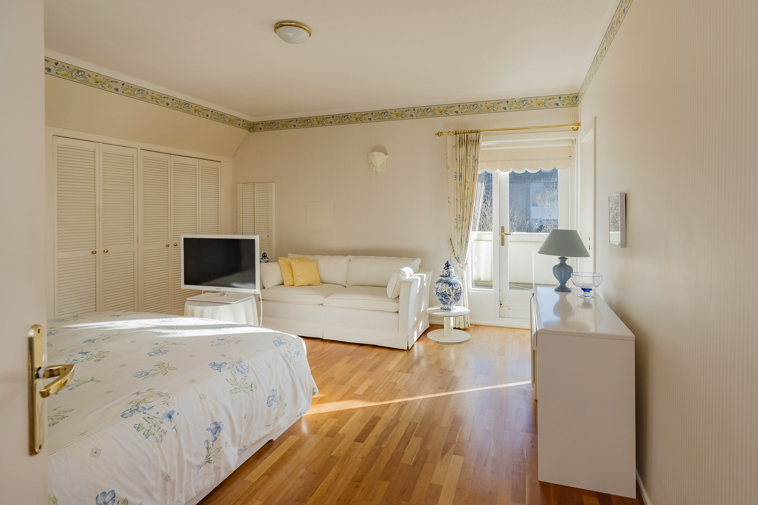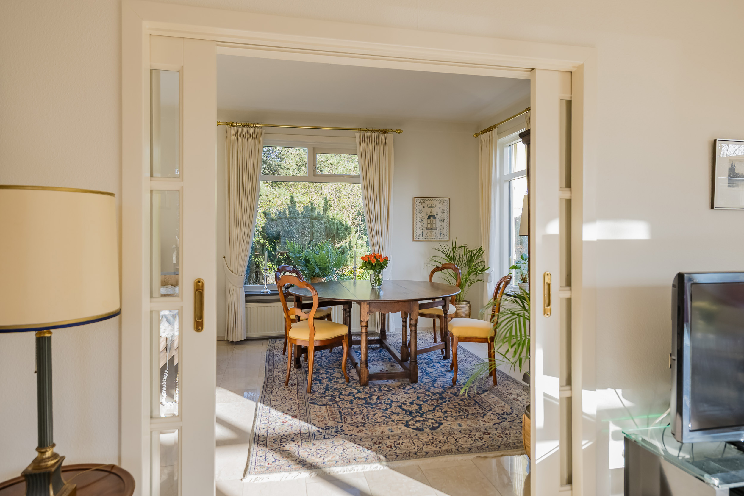 De eetkamer en-suite is met schuifdeuren handig af te sluiten van de woonkamer. Op het zonnige, met glas afgeschermde terras, geniet je al vroeg in het seizoen van de eerste zonnestralen, terwijl de deur op het terras directe toegang geeft tot de tuin.