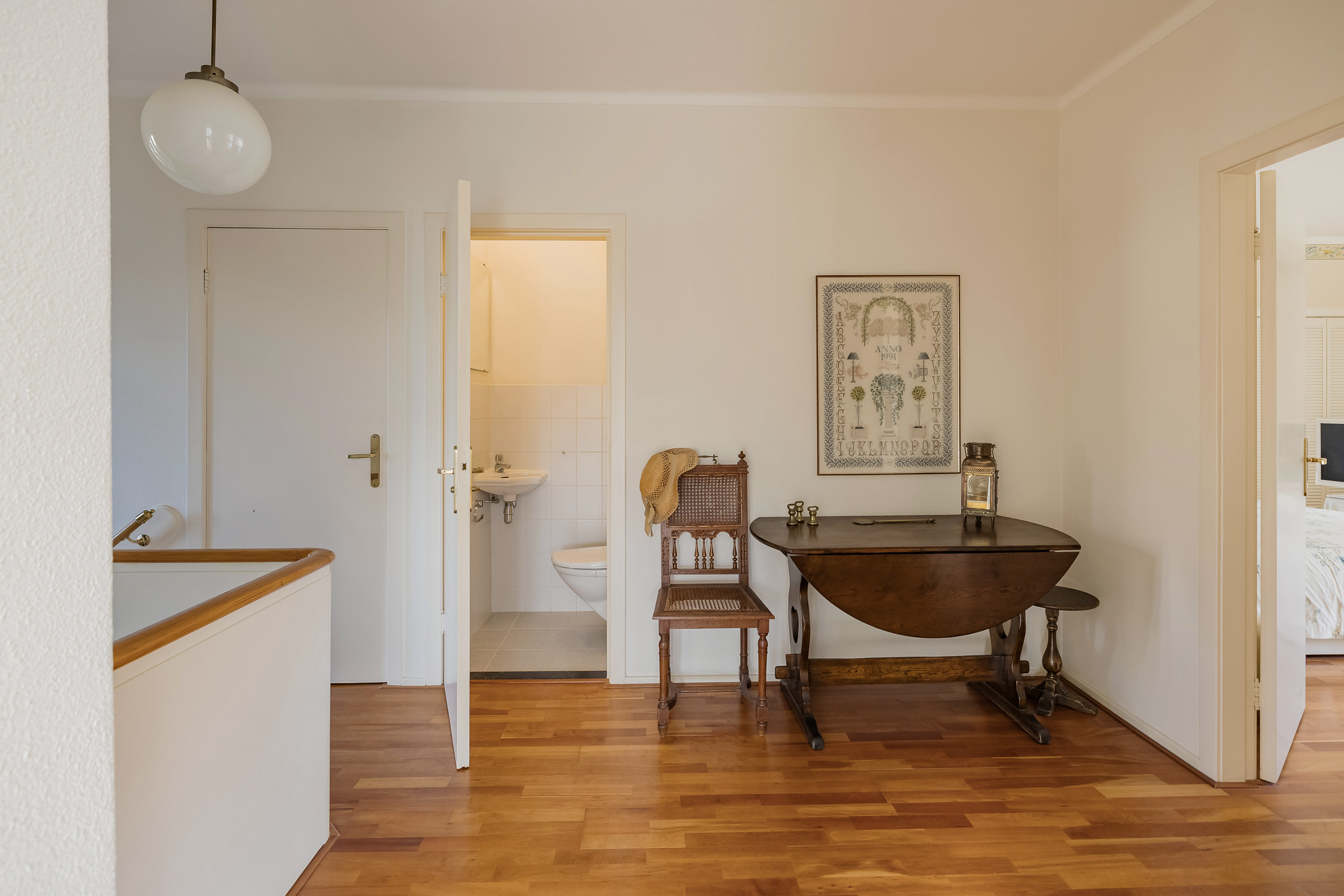 Verder vind je op deze verdieping een goed uitgeruste werkkamer voorzien van maatwerk kasten en een bijkeuken/bergruimte met vlizotrap naar de ruime vliering met stahoogte die extra bergruimte biedt boven de hele bijkeuken.