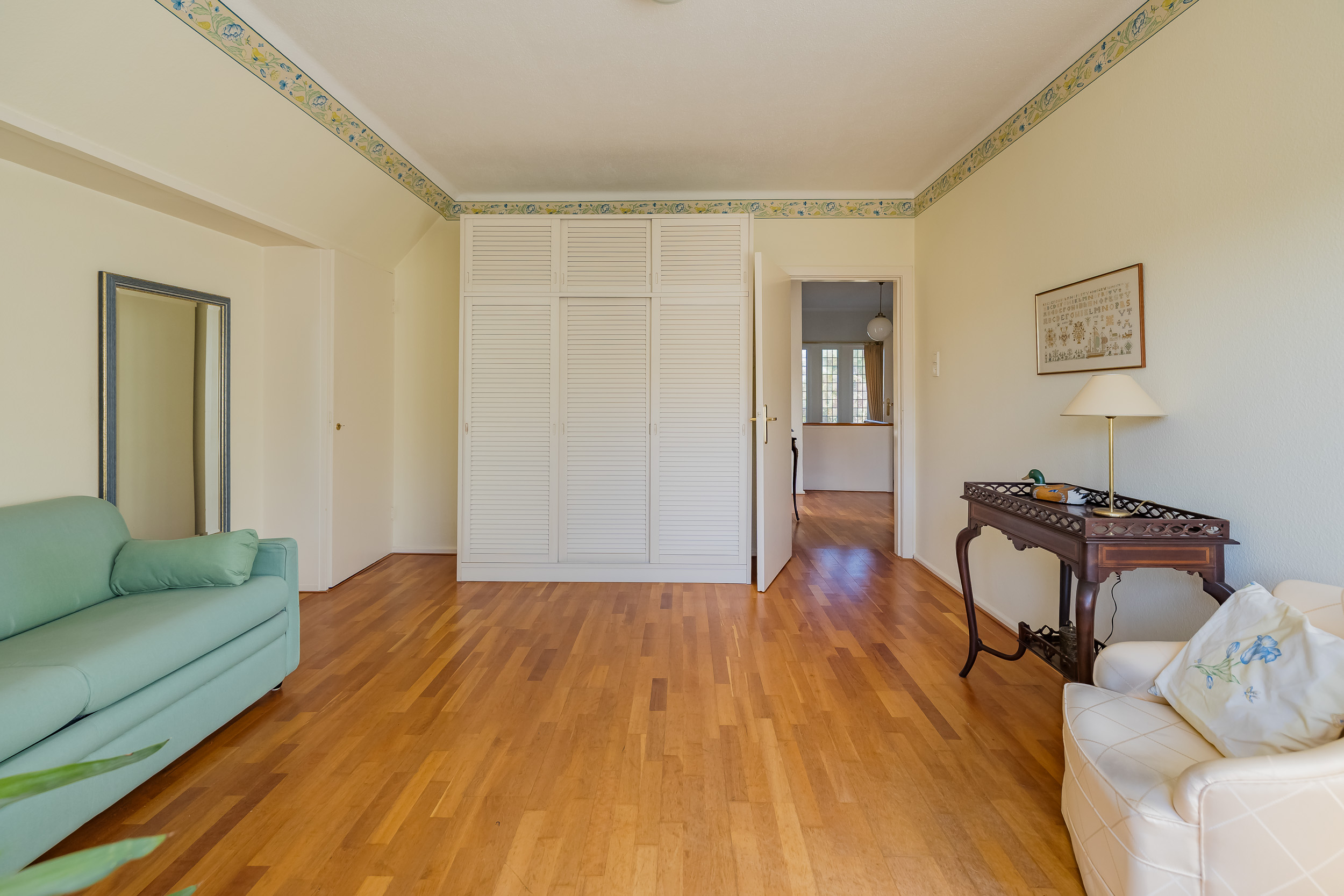 De vaste trap leidt naar een verrassend ruime verdieping met een grote overloop/multifunctionele ruimte en een vijfde slaapkamer met eigen wastafel en diepe kast. Ook vindt u hier een donkere kamer (DoKa).