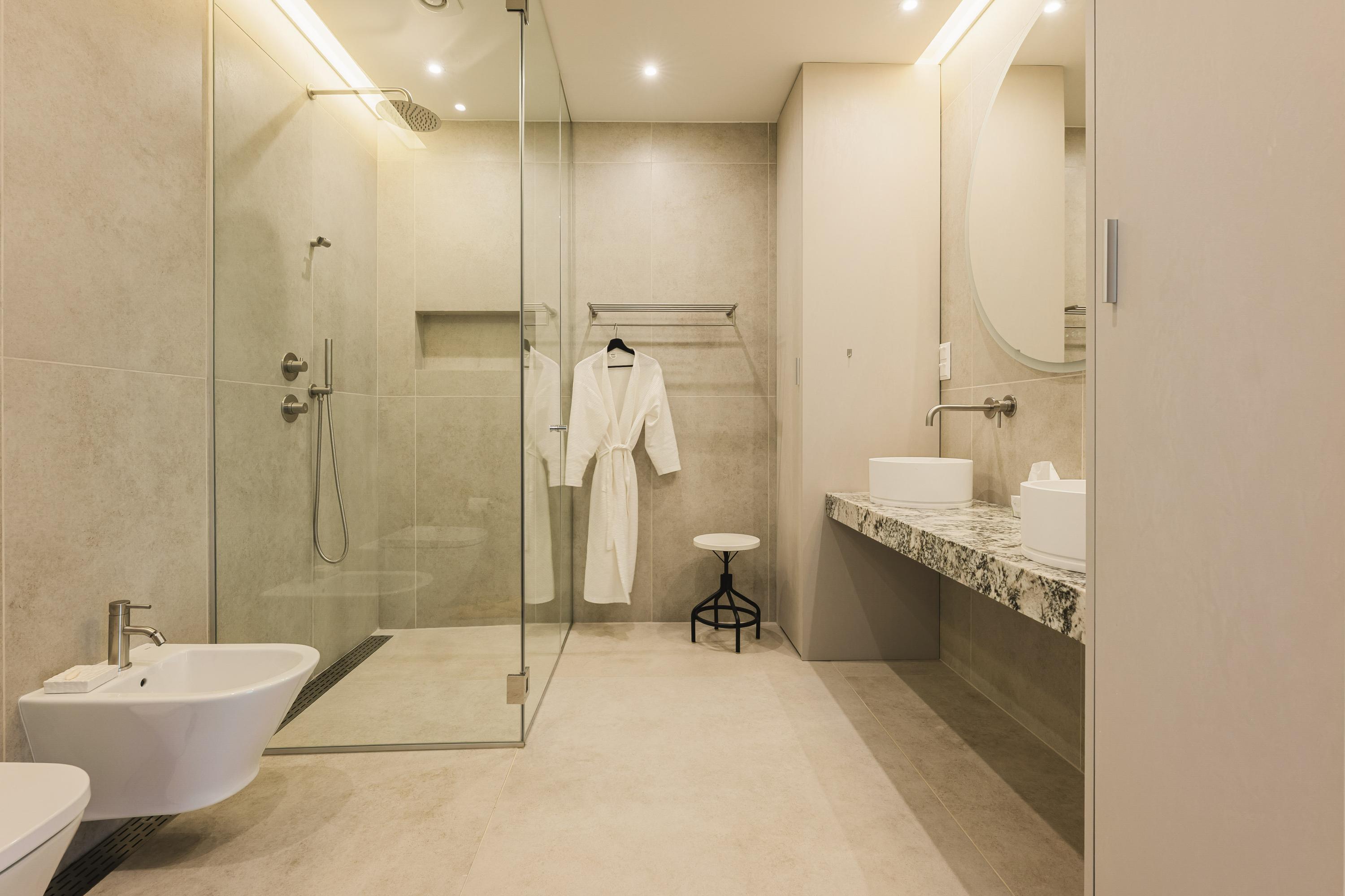 Met glazen hoek en uitzicht op tuin en zee. Badkamer met dubbele wastafel, regendouche, bidet, toilet en natuursteen.