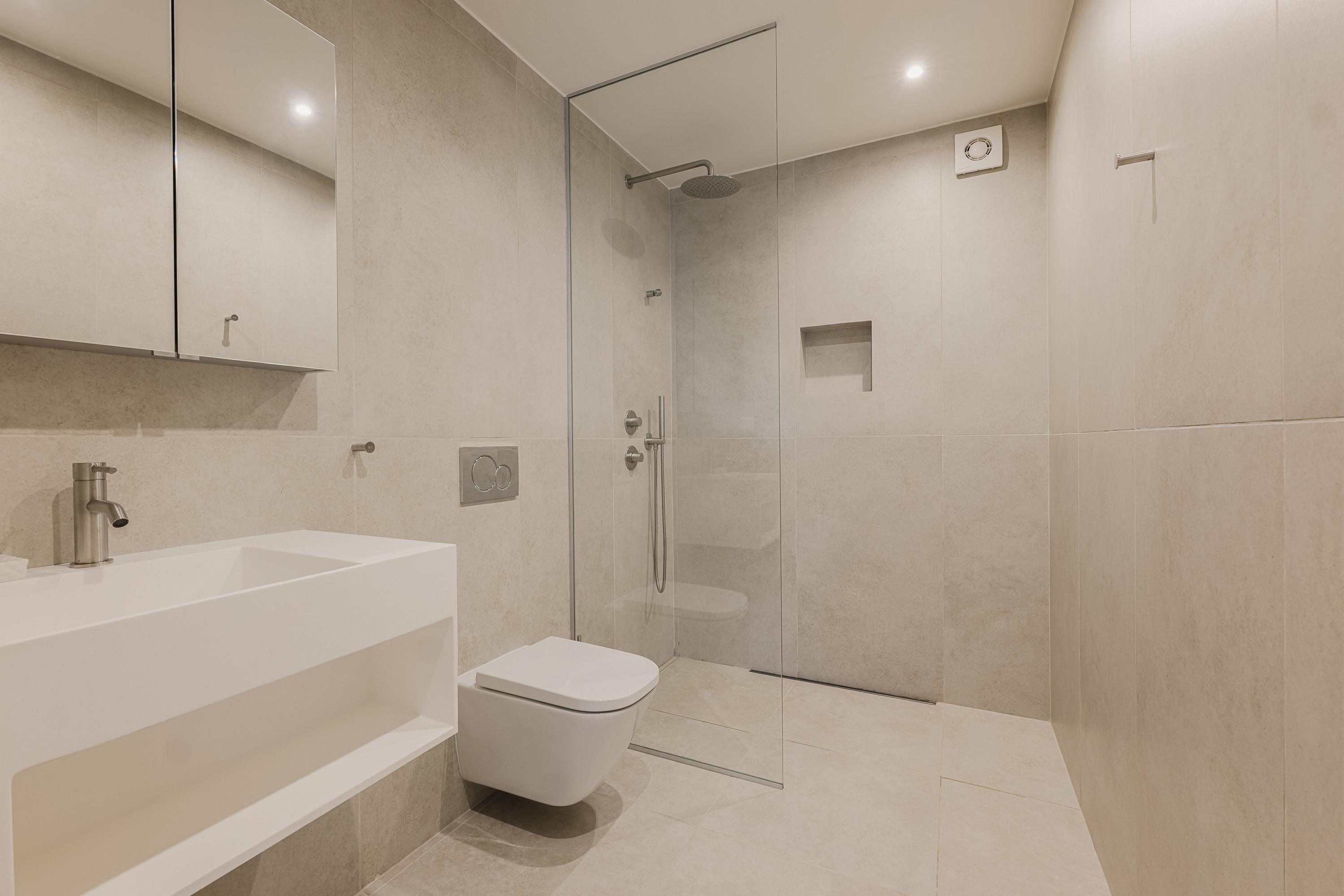 Een serene retreat met oceaanlicht en vloerverwarming. En-suite badkamer met marmeren dubbele wastafel, vrijstaand bad, inloop regendouche, bidet en toilet. Inclusief walk-in closet en aparte schoenenkast.