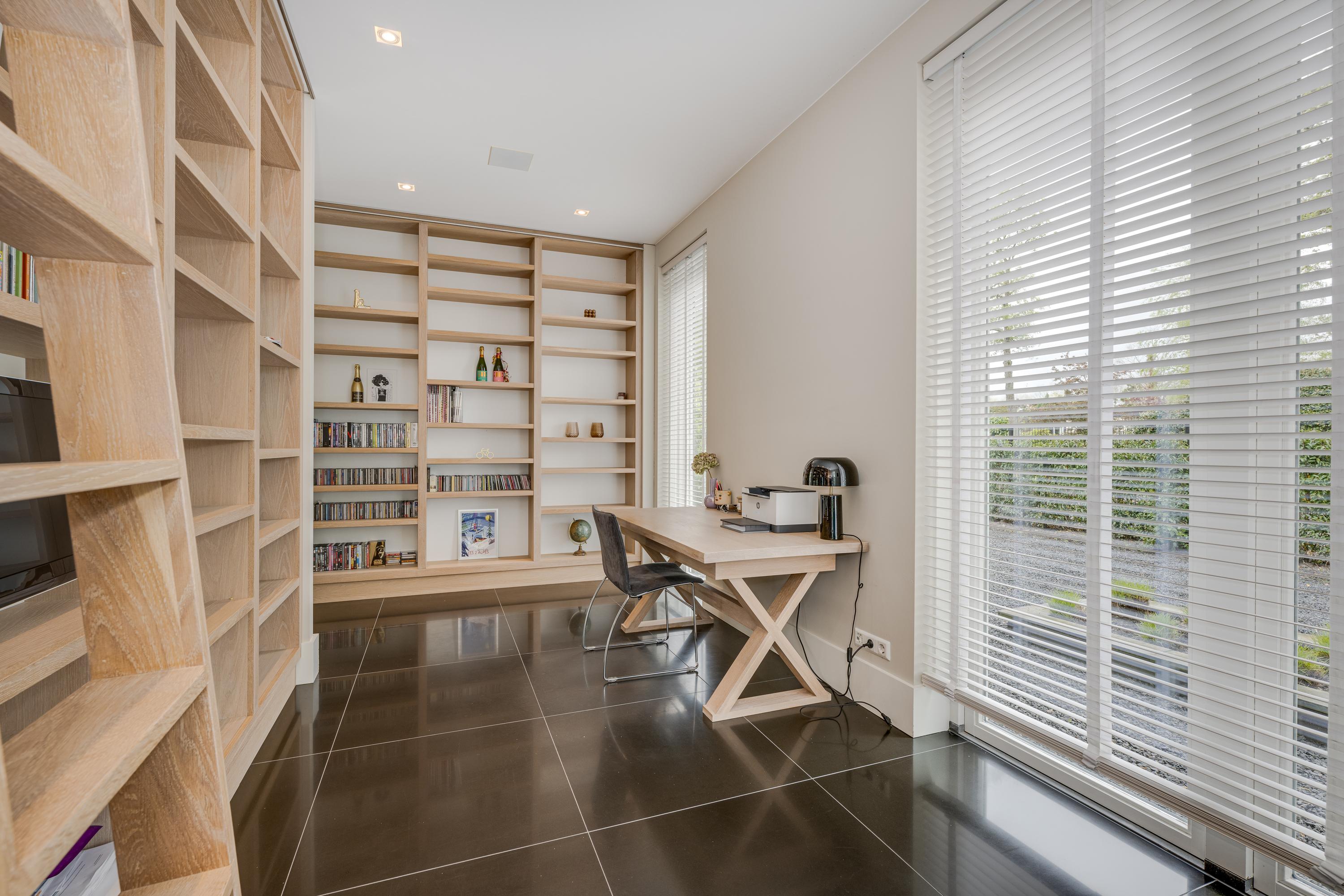 De woonkamer heeft een lichte eiken vloer met een moderne open haard (hout gestookt), hoge ramen en dubbele openslaande deuren naar het terras, waardoor er op elk moment van de dag licht binnenvalt vanuit alle kanten en zicht is op de omliggende tuin. De keuken en de studeerkamer kunnen door moderne schuifdeuren gescheiden worden van de woonkamer, maar geopend vormen deze ruimtes één geheel. De vloer in keuken en werkkamer zijn van hardsteen, welke samen met de elementen van eikenhout en kleuren een fraai effect geven. De werkkamer/bibliotheek is ruim en heeft een ingebouwde boekenwand in L-vorm.