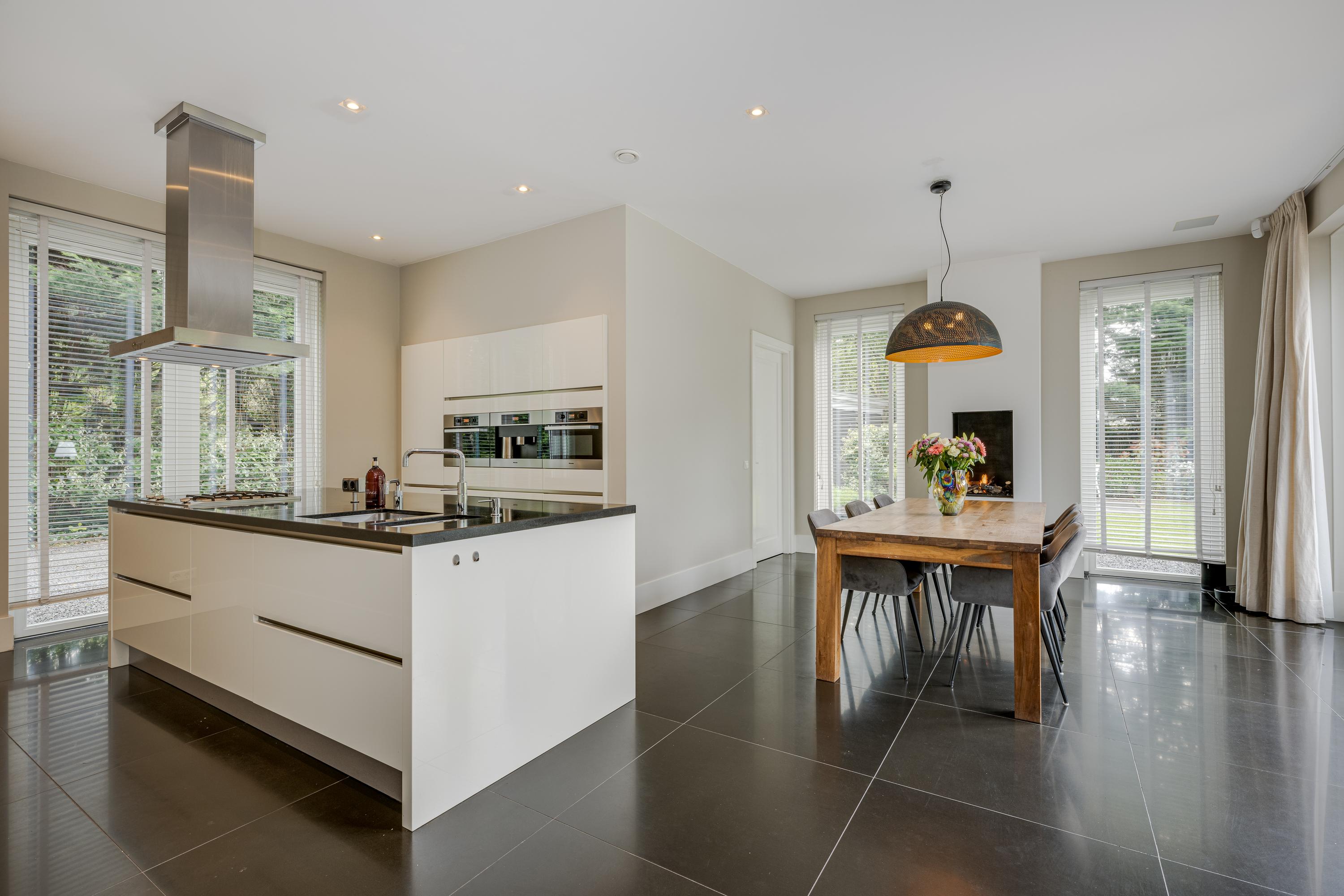De moderne keuken is voorzien van alle wenselijke apparatuur, waarbij het kookeiland beschikt over een dubbele spoelbak, vaatwasser, ijskast en een kookplaat op gas én inductie. De hoge wand biedt ruimte aan de stoomoven, combimagnetronoven en het koffieapparaat. Naast koken biedt de keuken ruimte aan een zeer royale eettafel met een gezellige gasgestookte haard. De dubbele openslaande deuren geven vanuit de keuken toegang tot het ruime terras. Naast de keuken bevindt zich de bijkeuken, voorzien van een gootsteen, veel vaste kastruimte en een deur naar de tuin.
